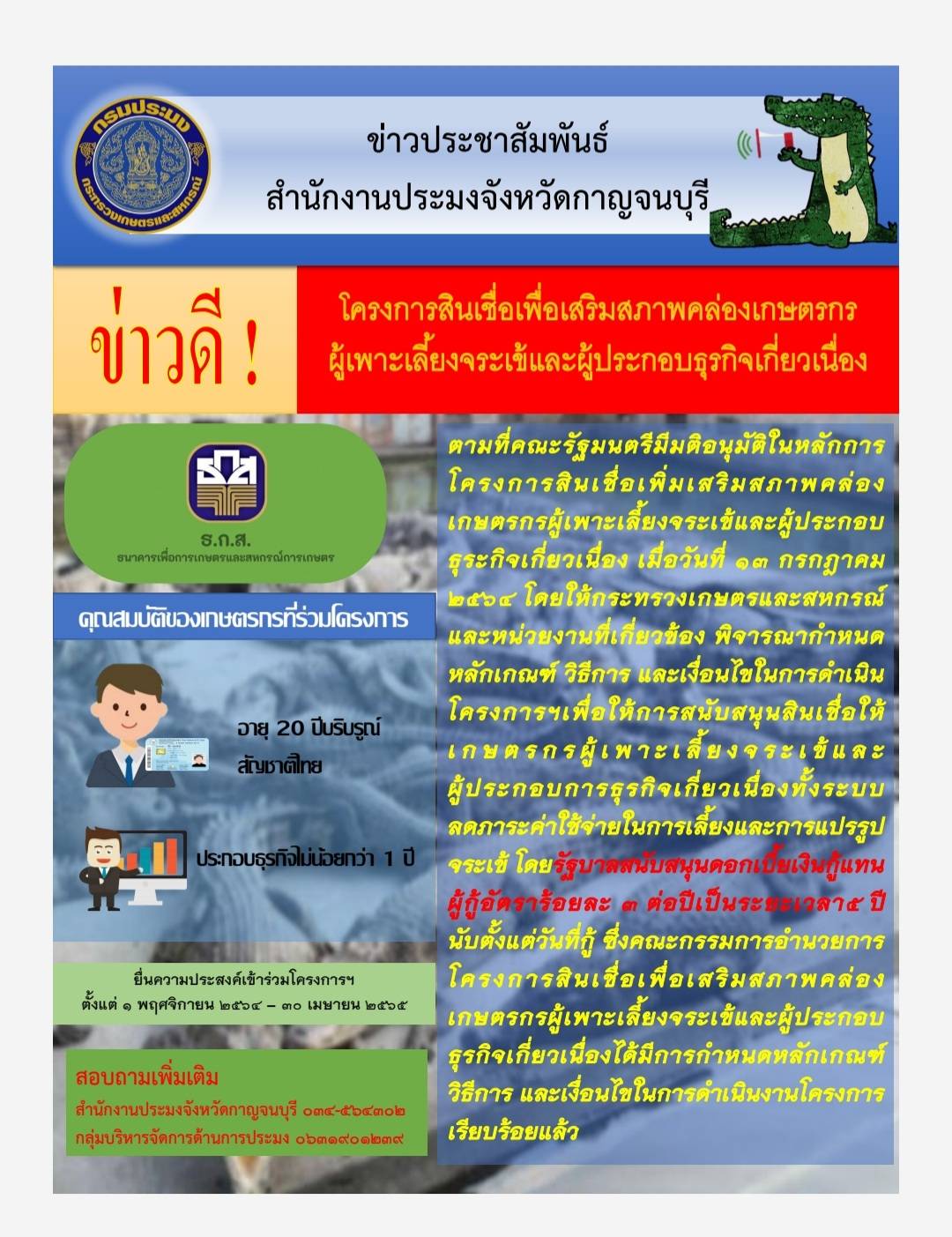 โครงการสินเชื่อเพื่อเสริมสภาพคล่องเกษตรกร ผู้เพาะเลี้ยงจระเข้และผู้ประกอบธุรกิจเกี่ยวเนื่อง..คลิก