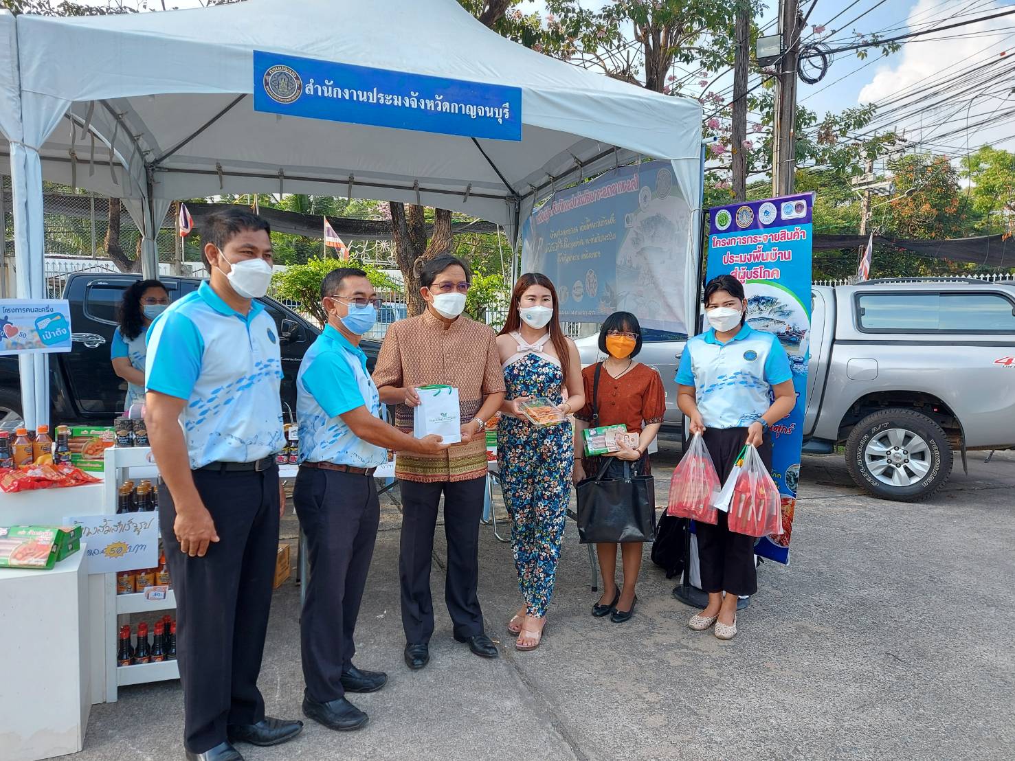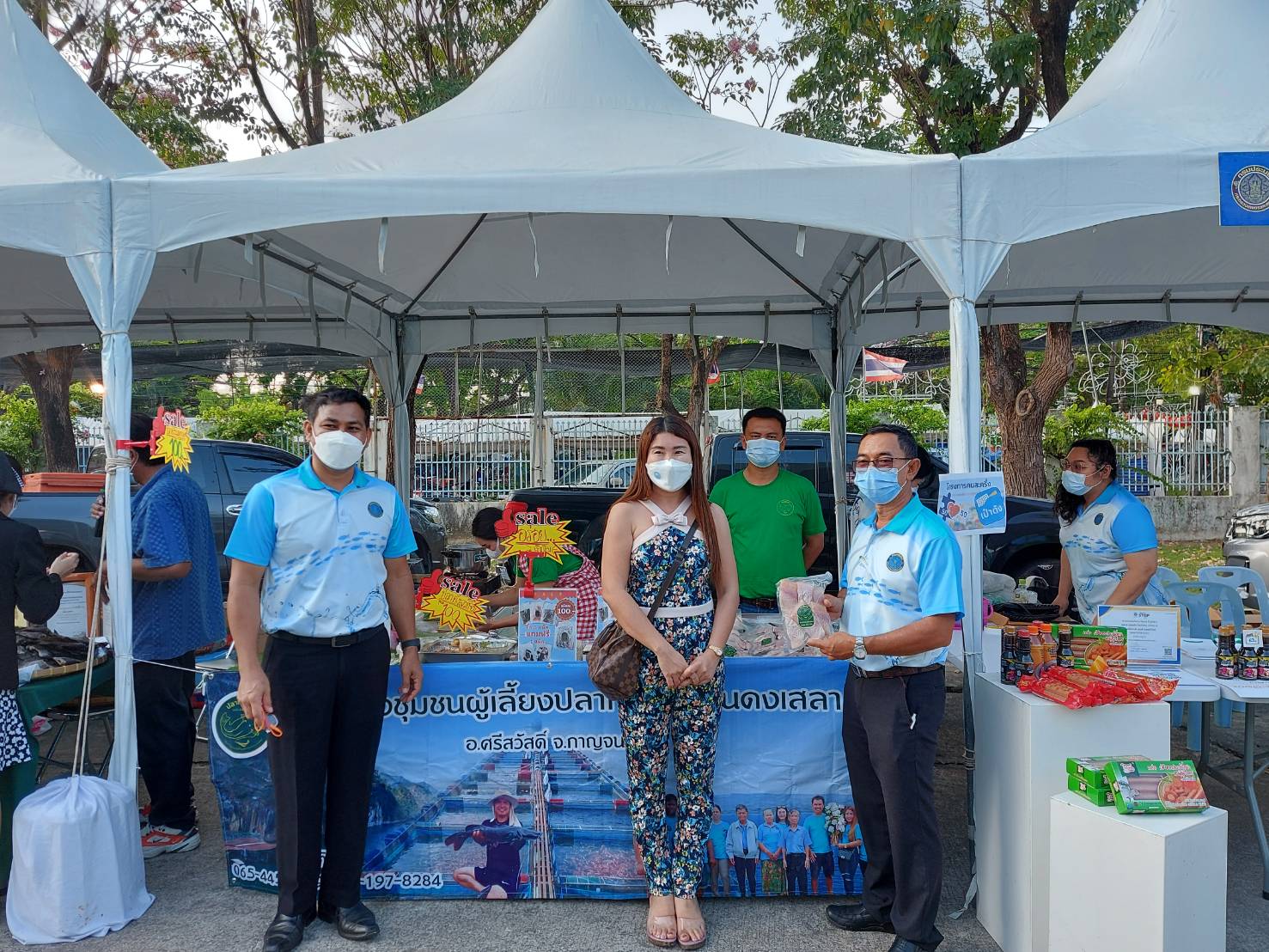 สำนักงานประมงจังหวัดกาญจนบุรี ภายใต้การนำของนายวรรณนัฑ หิรัญชุฬหะ ประมงจังหวัดกาญจนบุรี พร้อมด้วยนายจิระพงศ์  ศิริวัฒน์ หัวหน้ากลุ่มพัฒนาและส่งเสริมอาชีพการประมง และเจ้าหน้าที่สำนักงานฯ ได้จัดให้มีการนำผู้แทนกลุ่มวิสาหกิจชุมชนผู้เลี้ยงปลากระชังบ้านดงเสลา และวิสาหกิจชุมชนกลุ่มไส้กรอกสมุนไพร #พูนทรัพย์ฟาร์ม มาจำหน่ายสินค้าและผลิตภัณฑ์  Fisherman Market กรมประมง