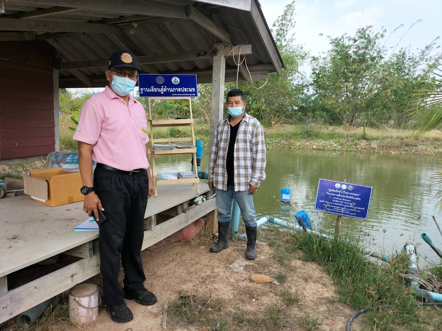 ส่งมอบวัสดุการเกษตร(ฐานเรียนรู้ด้านการประมง) พร้อมกับติดตามผลการดำเนินงานด้านต่างๆในกิจกรรมของศพก.เครือข่ายด้านการประมง ปี 2564 ประจำอำเภอหนองปรือ