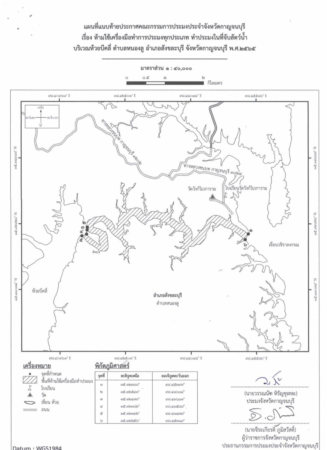 ประกาศคณะกรรมการประมงจังหวัดกาญจนบุรี เรื่อง  ห้ามใช้เครื่องมือทำการประมงทุกประเภท ทำการประมงในพื้นที่จับสัตว์น้ำ บริเวณห้วยบีคลี่ ตำบลหนองลู อําเภอสังขละบุรี จังหวัดกาญจนบุรี พ.ศ. 2565 ตามแผนที่แสดงแนวเขตบริเวณที่กำหนดแนบท้ายประกาศนี้ ภายในระยะเวลาระหว่างวันที่ 16 สิงหาคม ถึงวันที่ 15 ตุลาคมของทุกปี ผู้ใดฝ่าฝืนกระทำความผิด ต้องระวางโทษปรับตั้งแต่หนึ่งหมื่นบาทถึงหนึ่งแสนบาท หรือปรับจำนวนห้าเท่าของมูลค่าสัตว์น้ำที่ได้จากการทำการประมง แล้วแต่จำนวนใดจะสูงกว่า
