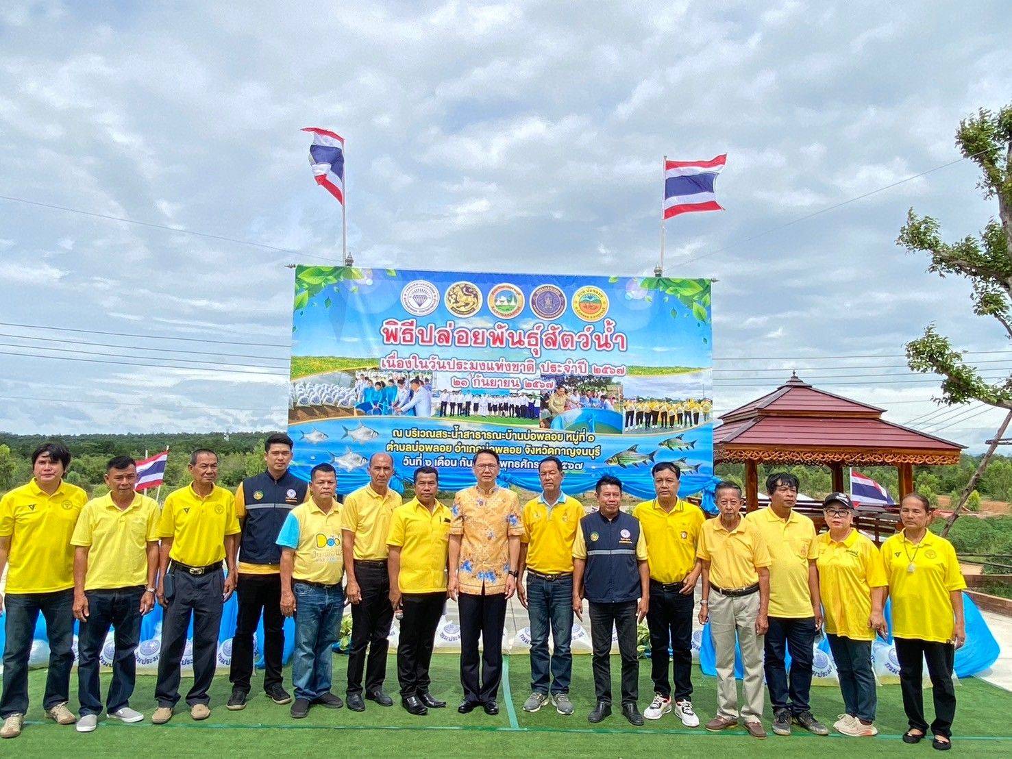 วันที่ 6 กันยายน 2567 เรือโทนพดล จันทรมณี ประมงจังหวัดกาญจนบุรี ร่วมกับเทศบาลตำบลบ่อพลอยและองค์การบริหารส่วนตำบลบ่อพลอย จัดพิธีปล่อยพันธุ์สัตว์น้ำ เนื่องในวันประมงแห่งชาติ ประจำปี 2567 ณ สระน้ำสาธารณะบ้านบ่อพลอย หมู่ที่ 1 ตำบลบ่อพลอย อำเภอบ่อพลอย จังหวัดกาญจนบุรี มีหน่วยงานในสังกัดกรมประมงในจังหวัดกาญจนบุรี ส่วนราชการ ประชาชนและนักเรียน เข้าร่วมพิธีเป็นจำนวนมาก โดยมี ร้อยโท ทศพล ไชยโกมินทร์ ผู้ว่าราชการจังหวัดกาญจนบุรี เป็นประธาน ได้รับการสนับสนุนพันธุ์ปลาจากศูนย์วิจัยและพัฒนาประมงน้ำจืดกาญจนบุรี