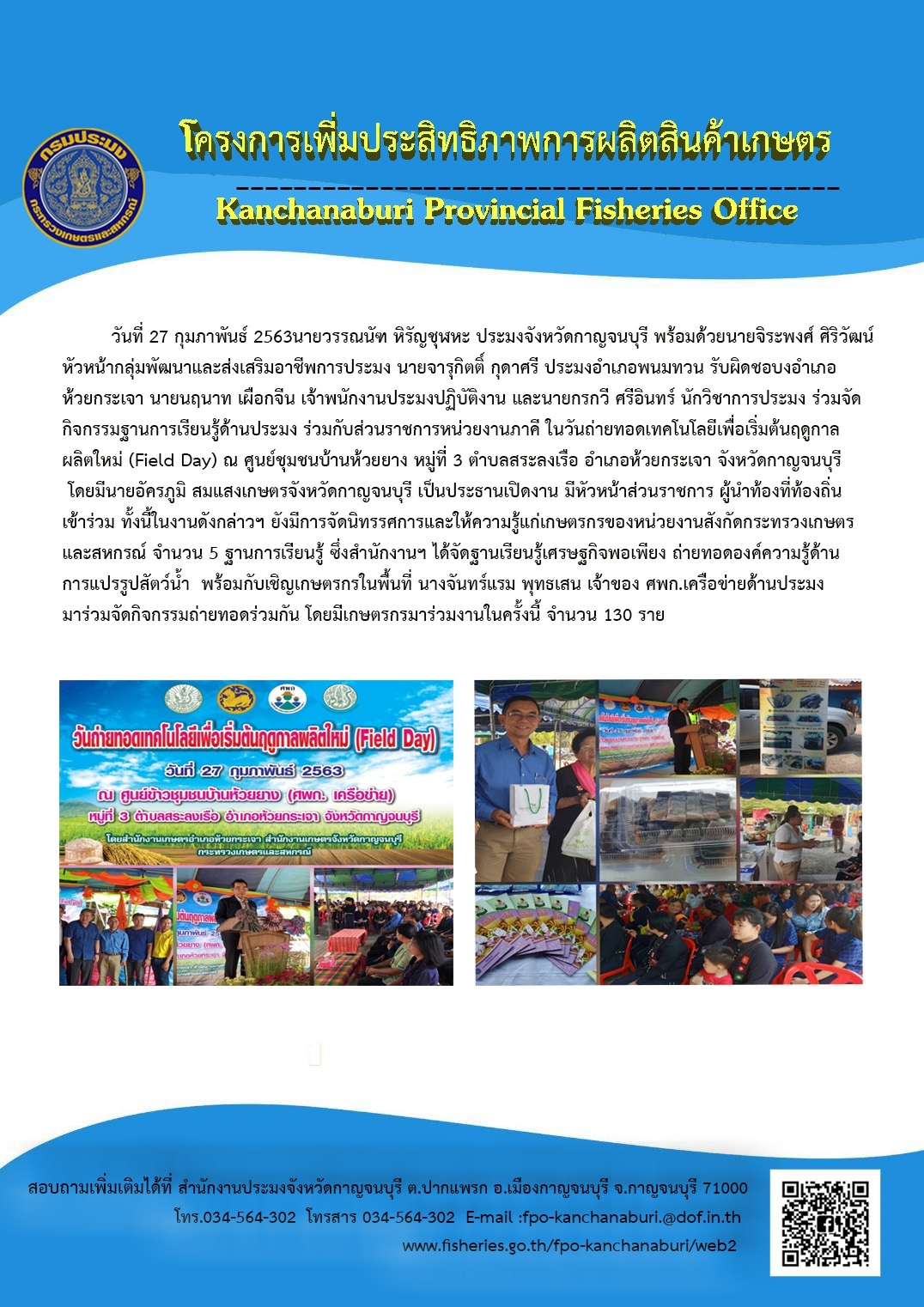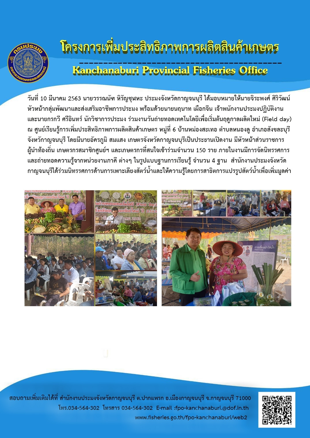 งานวันถ่ายทอดเทคโนโลยีเพื่อเริ่มต้นการผลิต (Field day) ในพื้นที่จังหวัดกาญจนบุรี ประจำปีงบประมาณ พ.ศ.2563