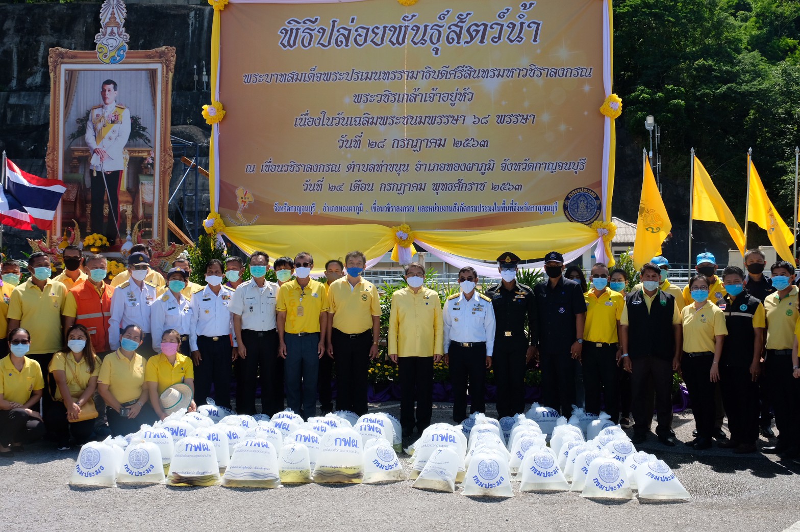 วันที่ 24 กรกฎาคม 2563 สำนักงานประมงจังหวัดกาญจนบุรี ร่วมกับอำเภอทองผาภูมิ เขื่อนท่าทุ่งนา จัดพิธีปล่อยพันธุ์สัตว์น้ำเนื่องในวันเฉลิมพระชนมพรรษา