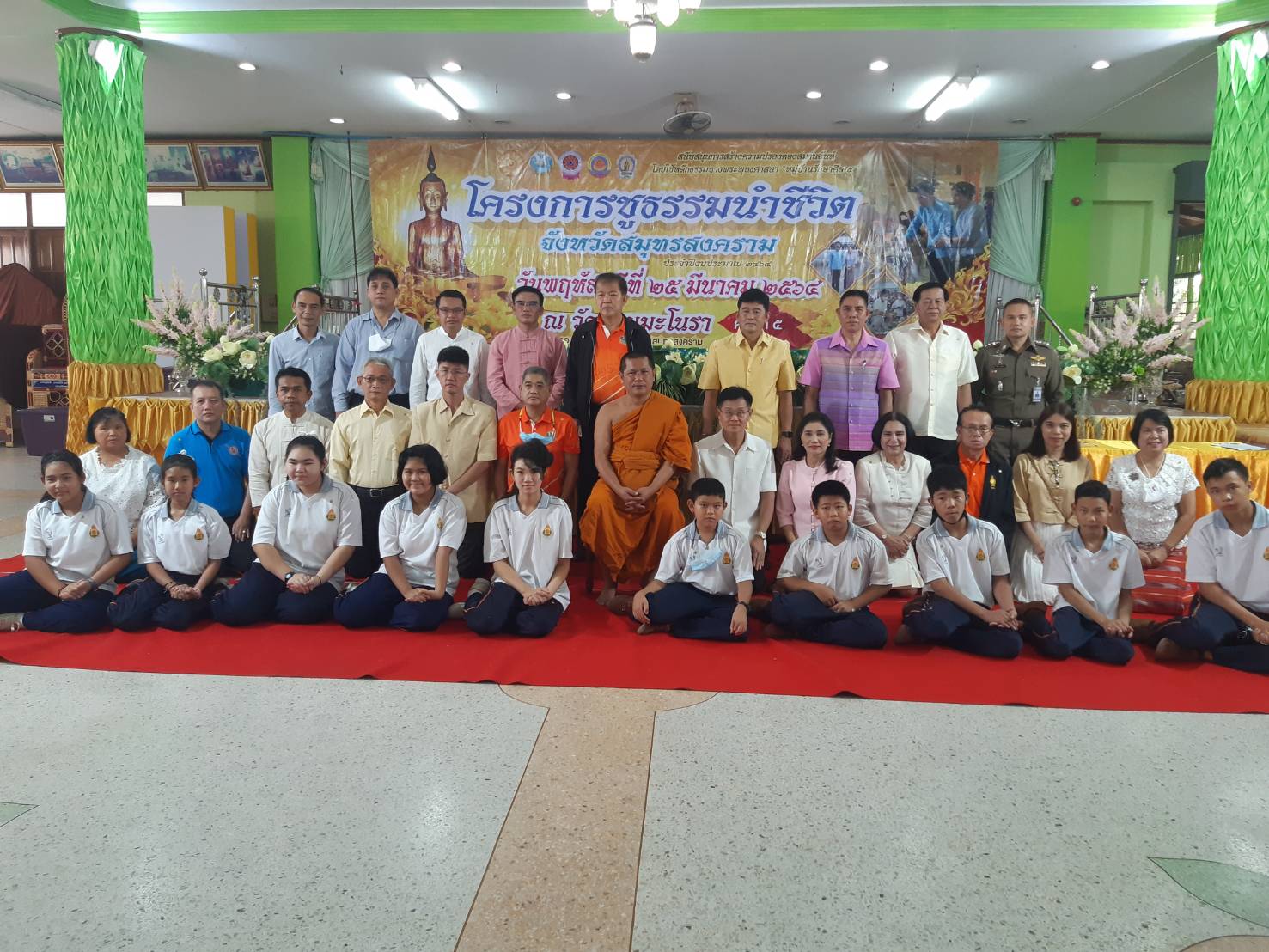 นาวาตรีสรรเสริญ  เสรีรักษ์ ประมงจังหวัดสมุทรสงคราม พร้อมด้วยนางสาวทัศนี  นิยมดุษดี เจ้าพนักงานธุรการปฏิบัติงาน และนางสาวศิรินันท์  พินิจ เจ้าหน้าที่ประมง ร่วมโครงการชูธรรมนำชีวิต จังหวัดสมุทรสงคราม ประจำปีงบประมาณ 2564 ครั้งที่ 5 ในวันที่ 25 มีนาคม 2564 ณ วัดดอนมะโนรา ตำบลดอนมะโนรา อำเภอบางคนที จังหวัดสมุทรสงคราม โดยมีนายชรัส  บุญณสะ ผู้ว่าราชการจังหวัดสมุทรสงครามเป็นประธานในพิธี