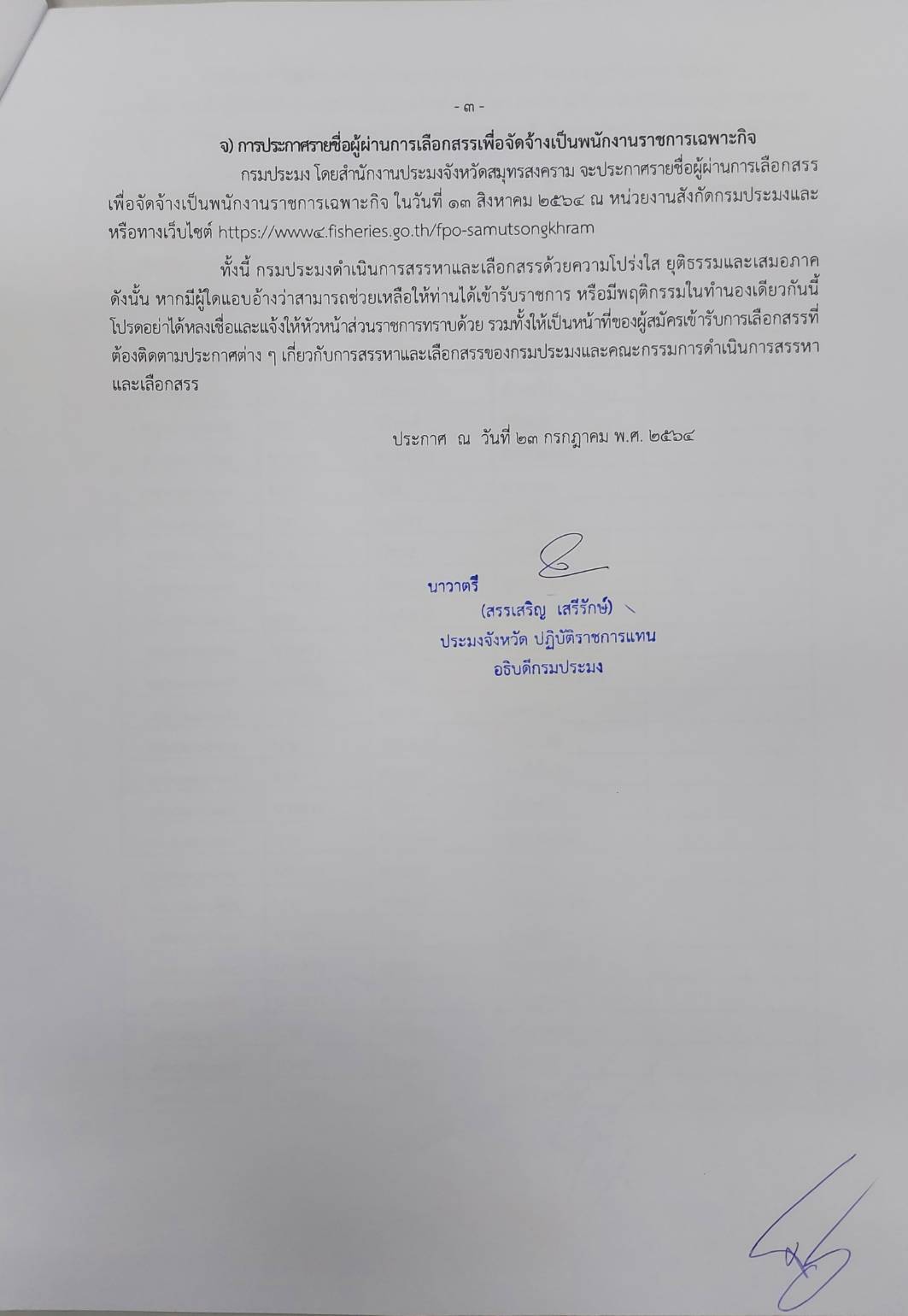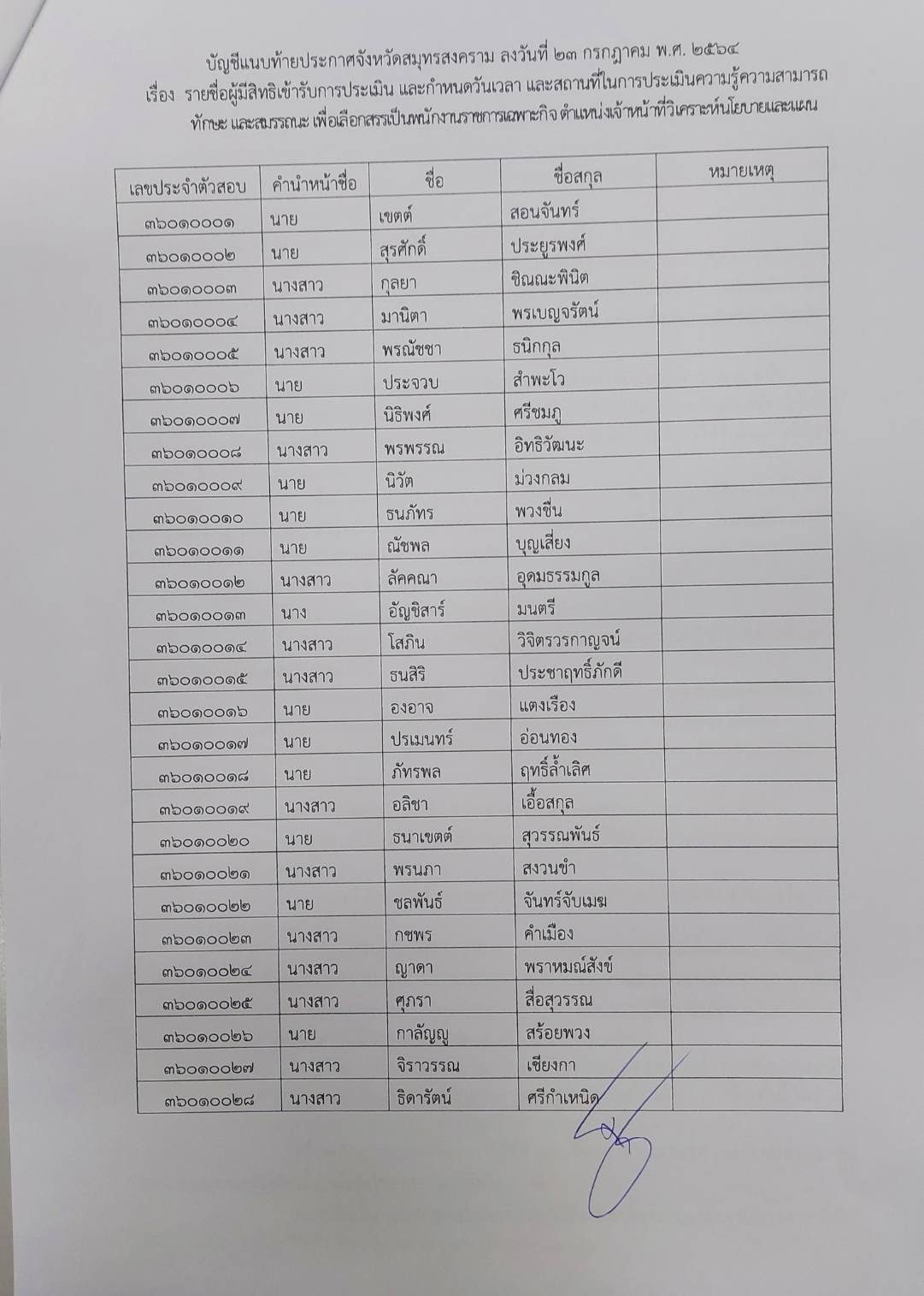 เรื่อง รายชื่อผู้มีสิทธิเข้ารับการประเมิน และกำหนดวันเวลา และสถานที่ในการประเมินความรู้ ความสามารถ ทักษะและสมรรถนะ เพื่อเลือกสรรเป็นพนักงานราชการเฉพาะกิจ ตำแหน่งเจ้าหน้าที่วิเคราะห์นโยบายและแผน (สำนักงานประมงจังหวัดสมุทรสงคราม)