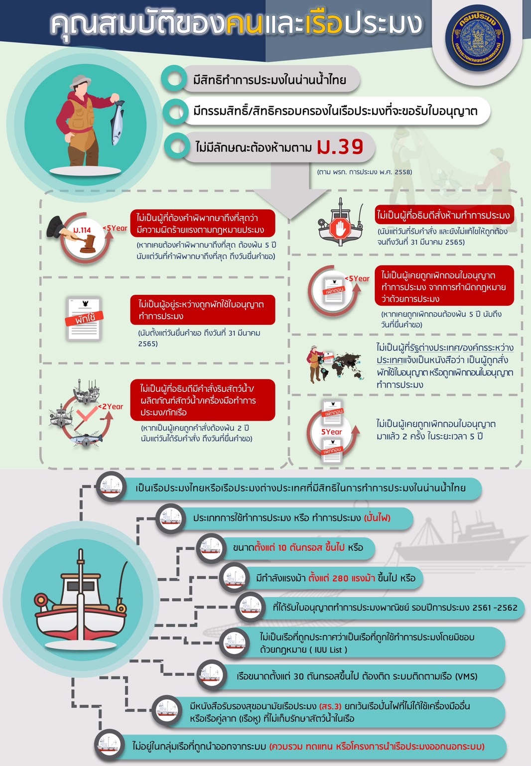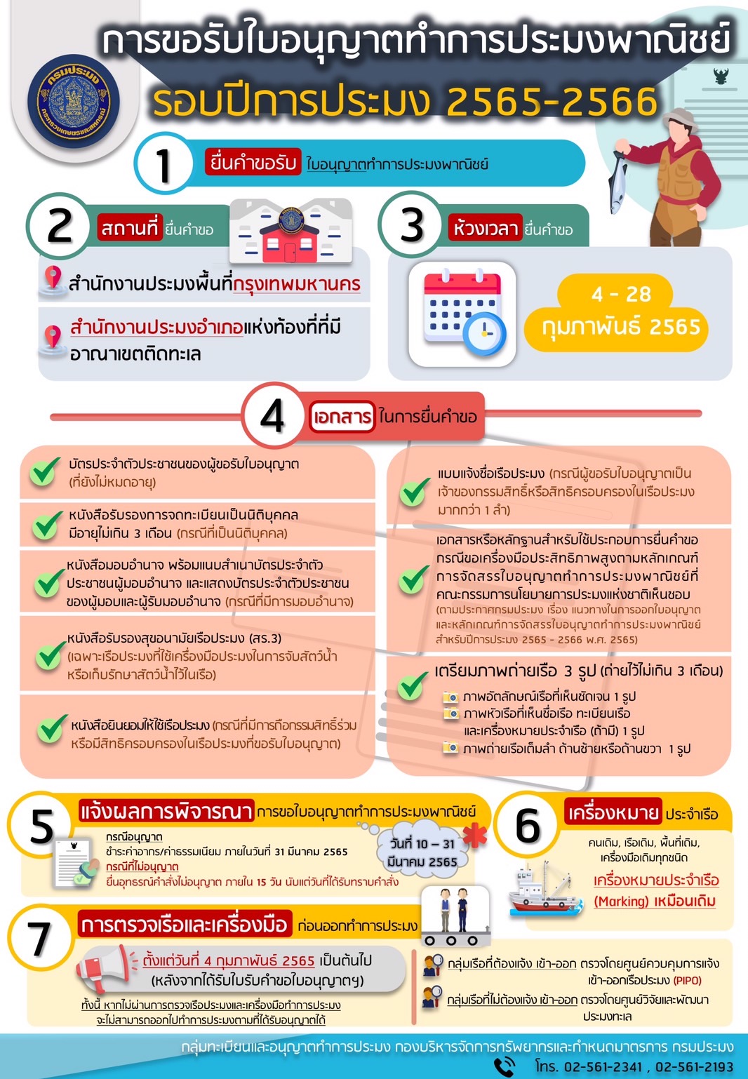 ประกาศกรมประมง เรื่อง กำหนดห้วงเวลา หลักเกณฑ์ วิธีการ ขั้นตอน และเงื่อนไขการขอรับใบอนุญาต ทำการประมงพาณิชย์ สำหรับปีการประมง ๒๕๖๕ – ๒๕๖๖ พ.ศ. ๒๕๖๕