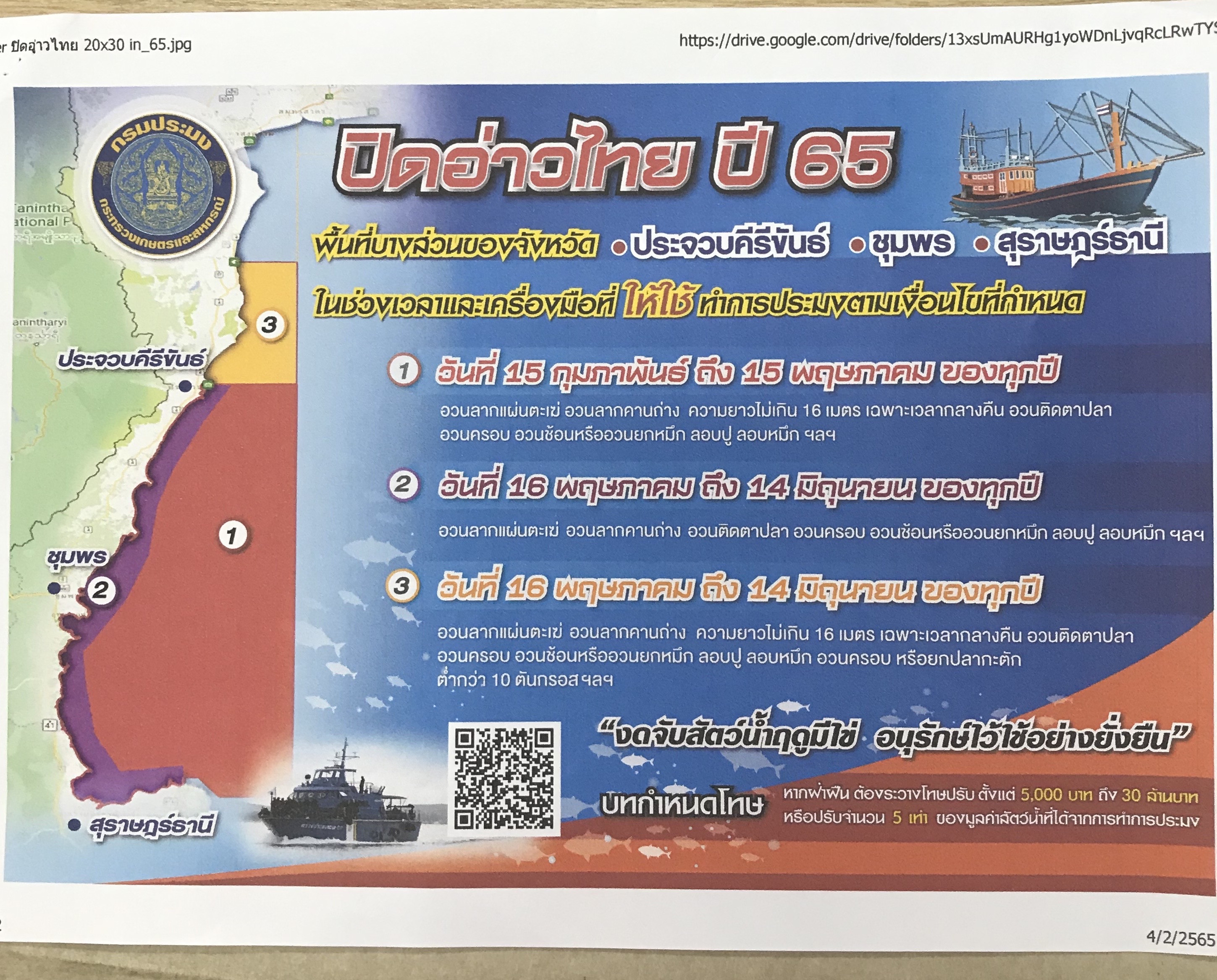 ประชาสัมพันธ์มาตรการบริหารจัดการทรัพยากรสัตว์น้ำมีไข่ วางไข่ เลี้ยงตัวอ่อน ทะเลอ่าวไทย ประจำปี  ๒๕๖๕