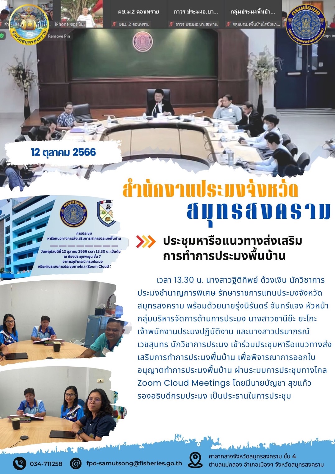 รายละเอียด ศาลากลางจังหวัดสมุทรสงคราม (หลังใหม่ ชั้น 4) ตำบลแม่กลอง  อำเภอเมืองฯ จังหวัดสมุทรสงคราม 75000  email  fpo-samutsong@fisheries.go.th  โทรศัพท์ 034-711258  FAX 034-711258