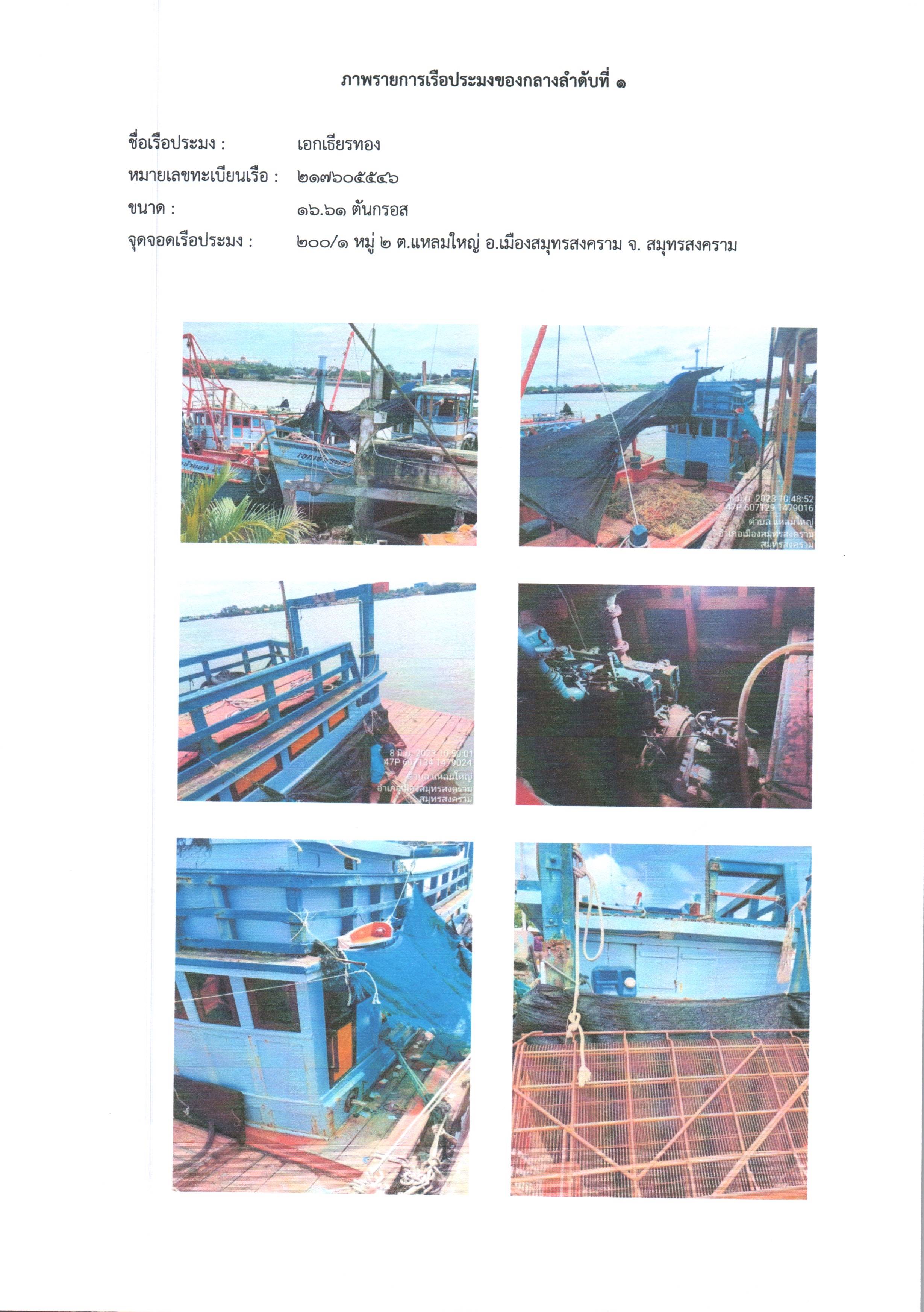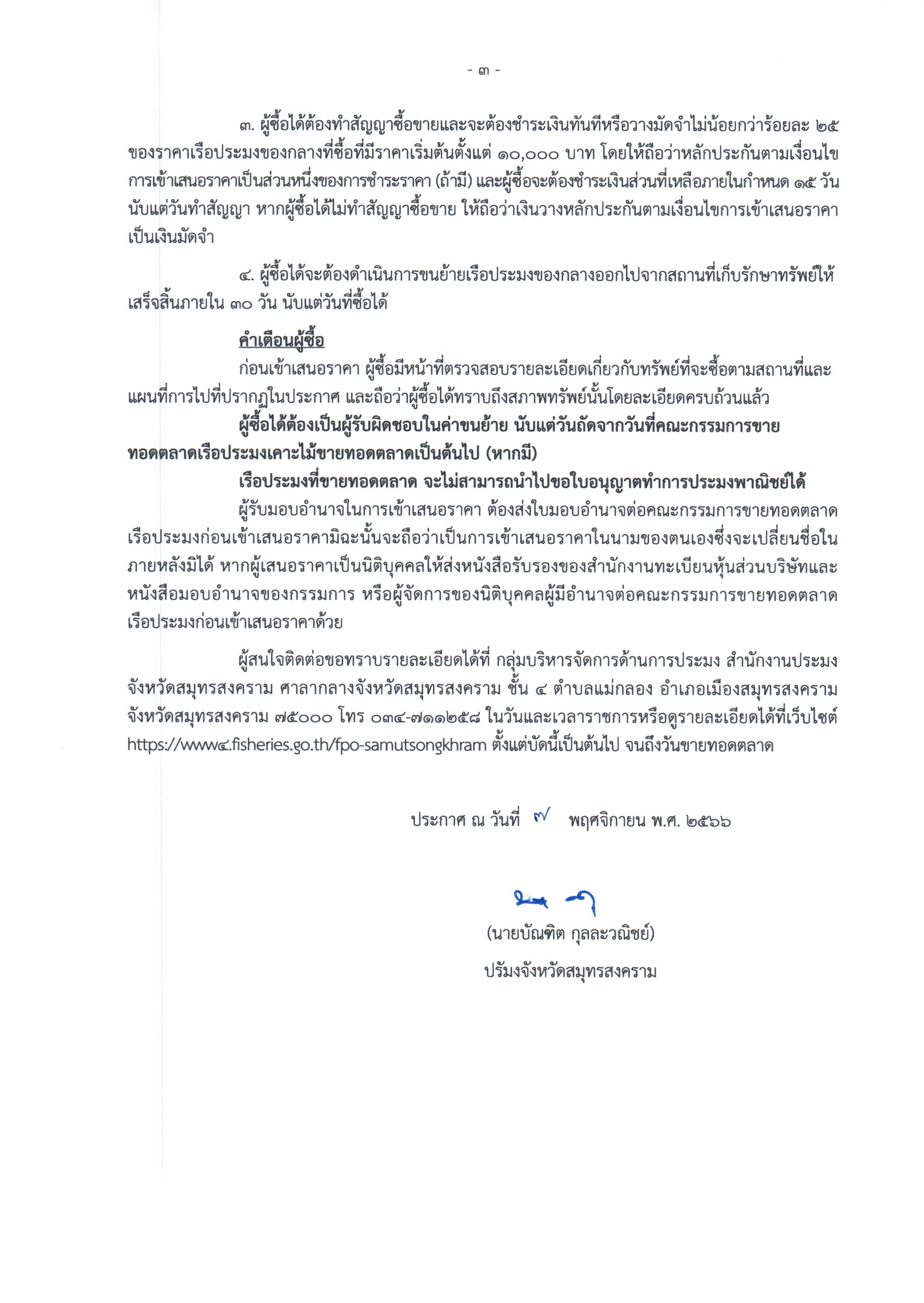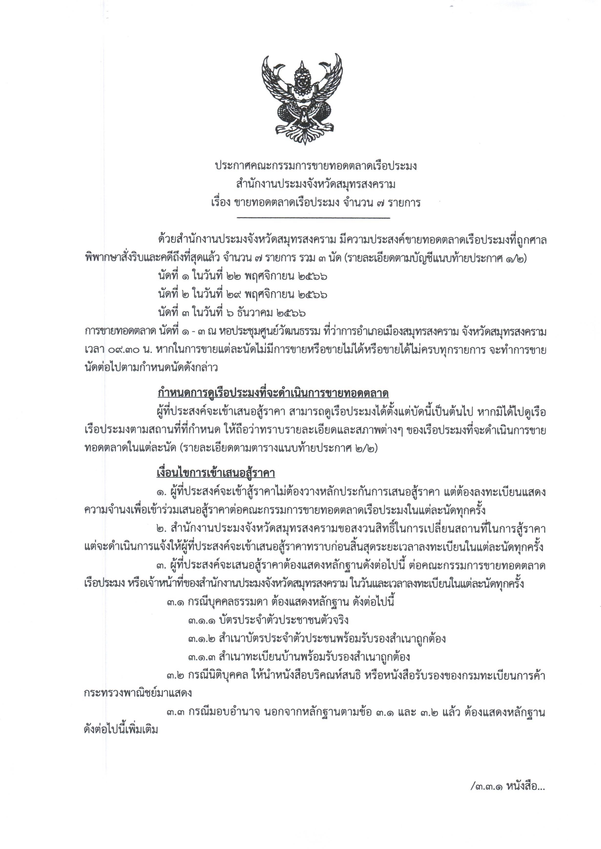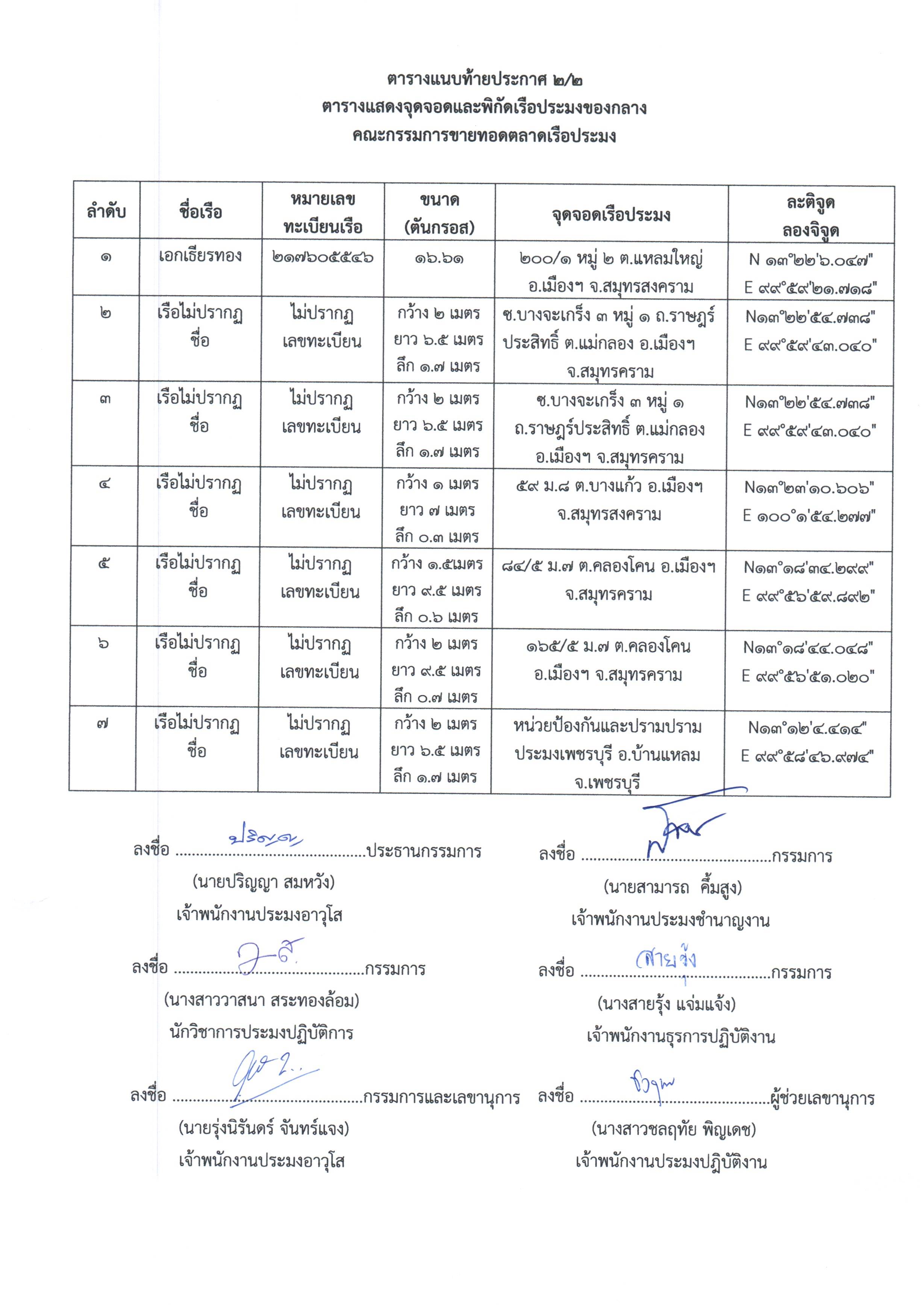 ประกาศคณะกรรมการขายทอดตลาดเรือประมง สำนักงานประมงจังหวัดสมุทรสงคราม เรื่อง ขายทอดตลาดเรือประมง จำนวน 7 รายการ