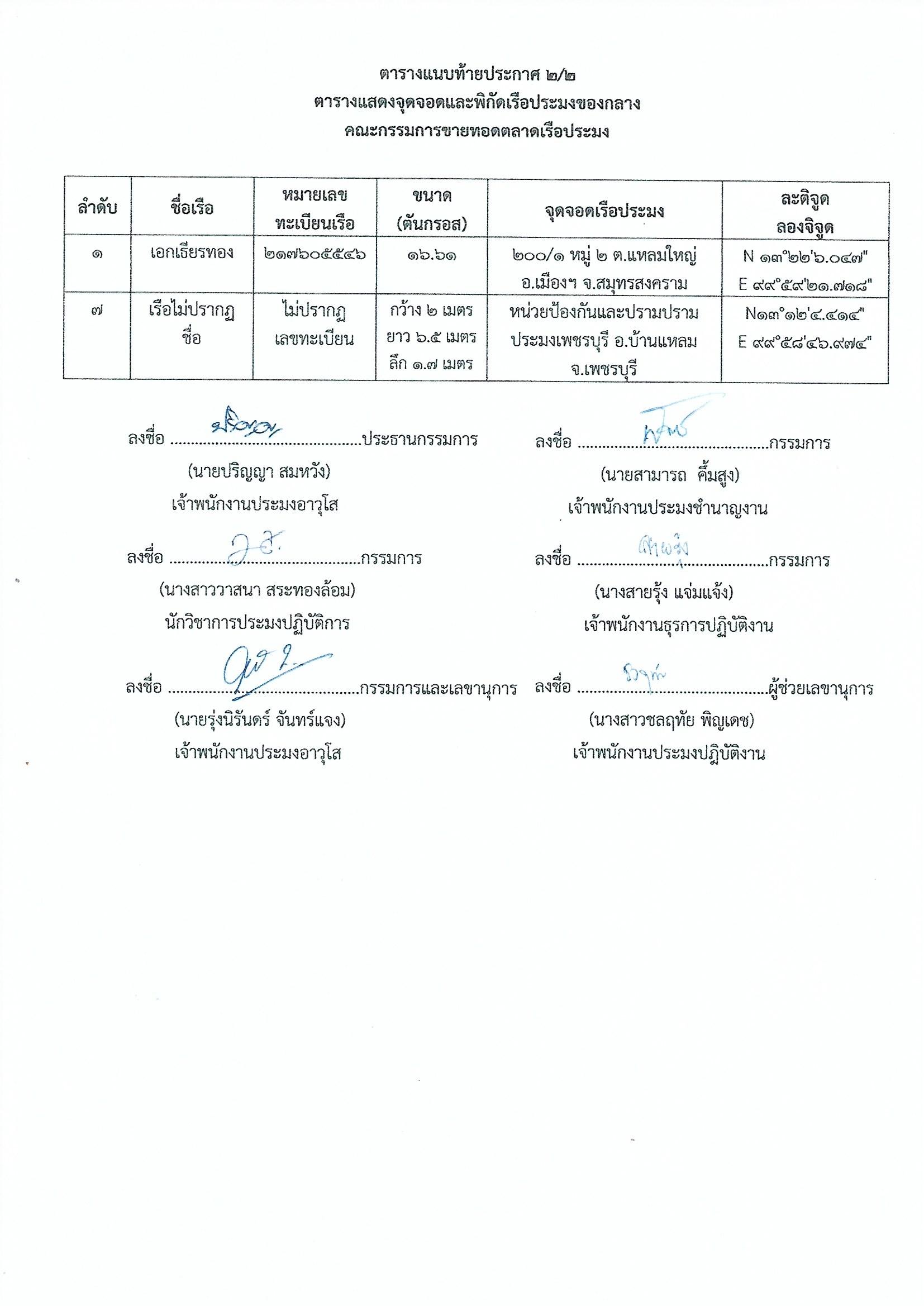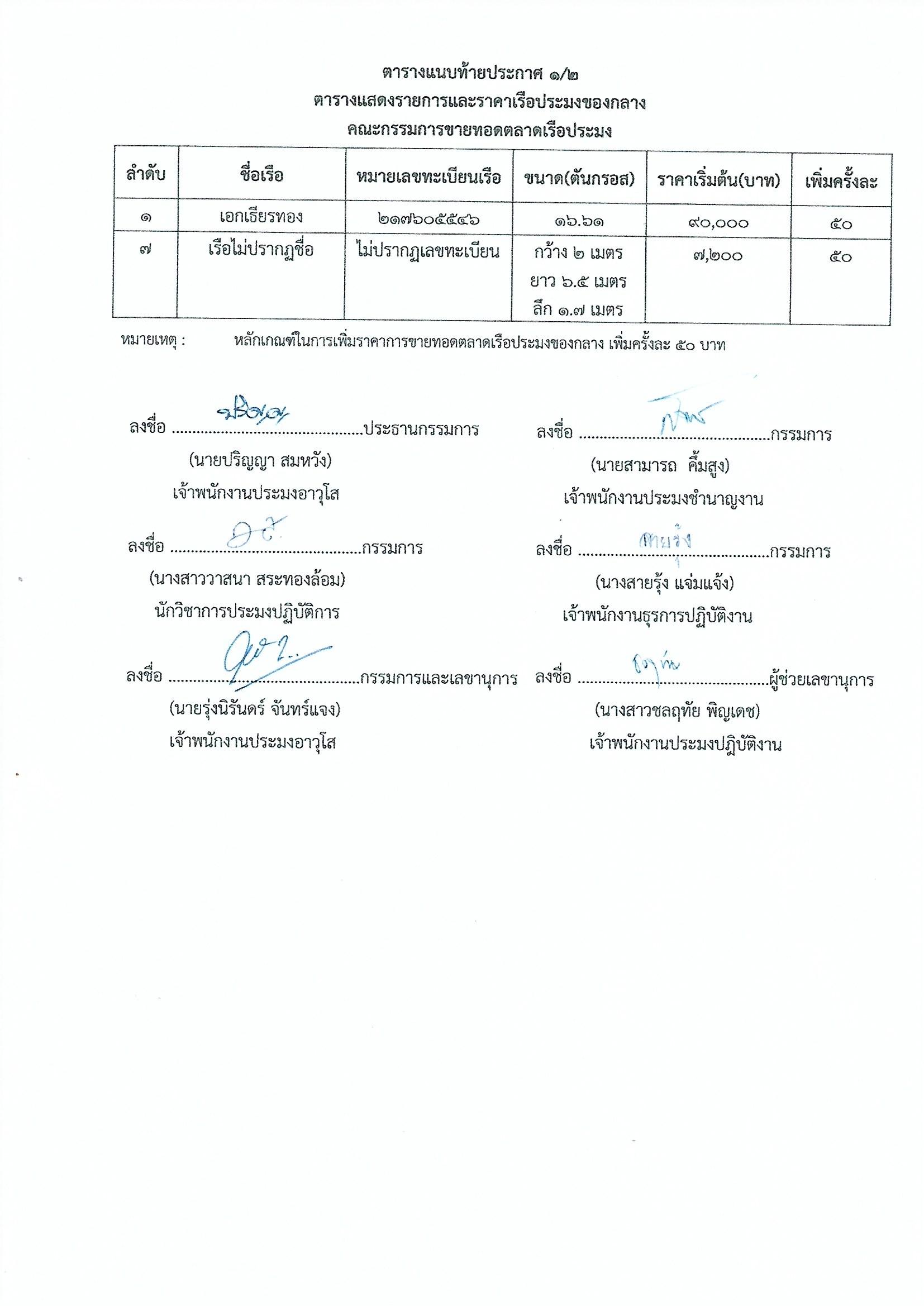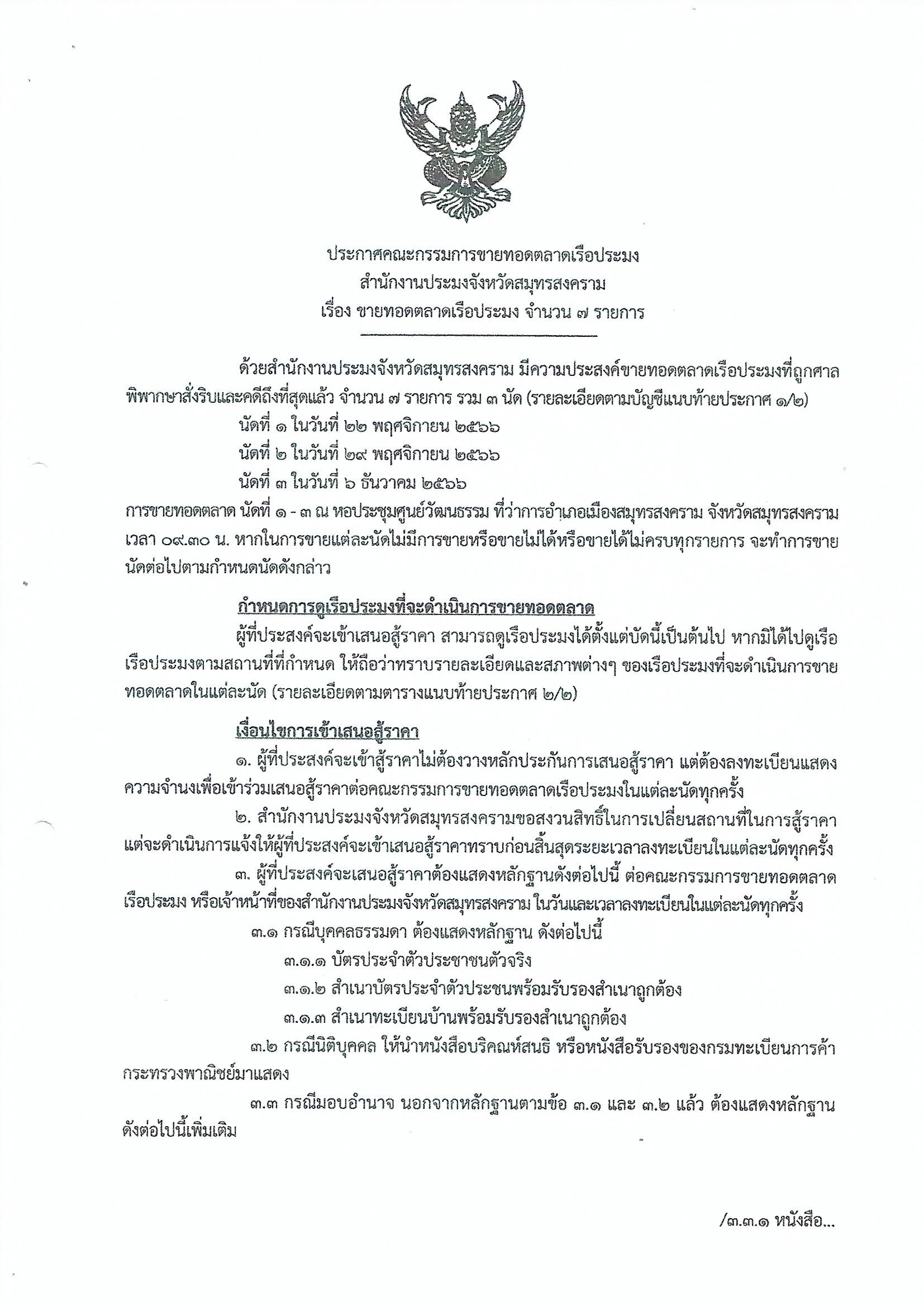 ประกาศคณะกรรมการขายทอดตลาดเรือประมง สำนักงานประมงจังหวัดสมุทรสงคราม เรื่อง ขายทอดตลาดเรือประมง จำนวน 7 รายการ นัดที่ 2