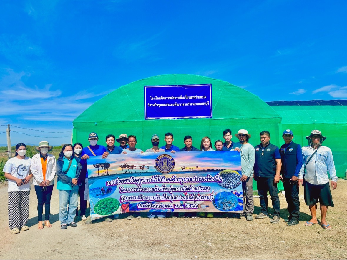 ส่งมอบโรงเรือนจัดการหลังการเก็บเกี่ยวสาหร่ายทะเล และวัสดุอุปกรณ์ทำความสะอาดสาหร่ายทะเล ให้กับองค์กรชุมชนประมงท้องถิ่น วิสาหกิจชุมชนประมงพัฒนาสาหร่ายทะเลเพชรบุรี หมู่ที่ 1 ตำบลแหลมผักเบี้ย อำเภอบ้านแหลม จังหวัดเพชรบุรี