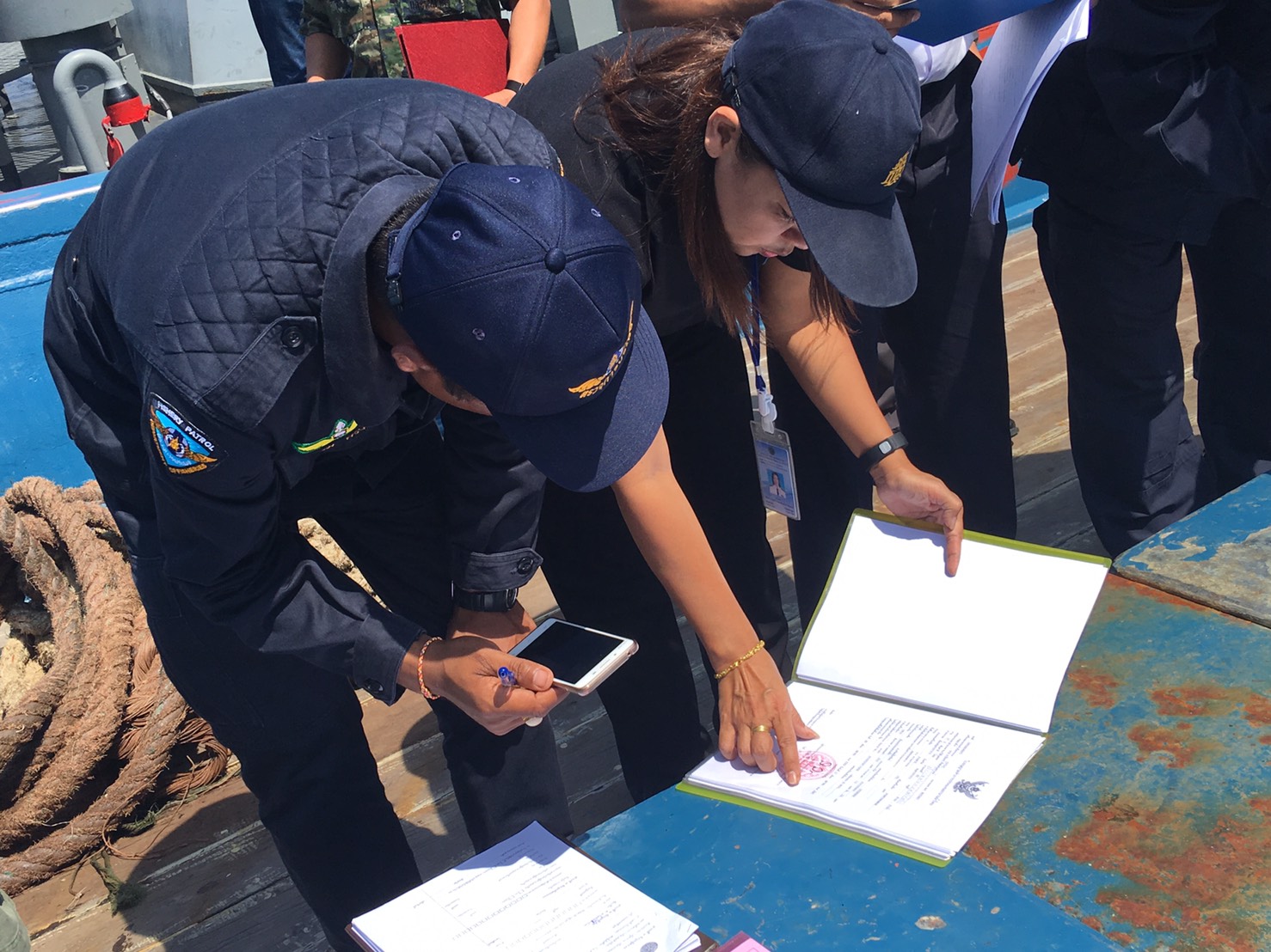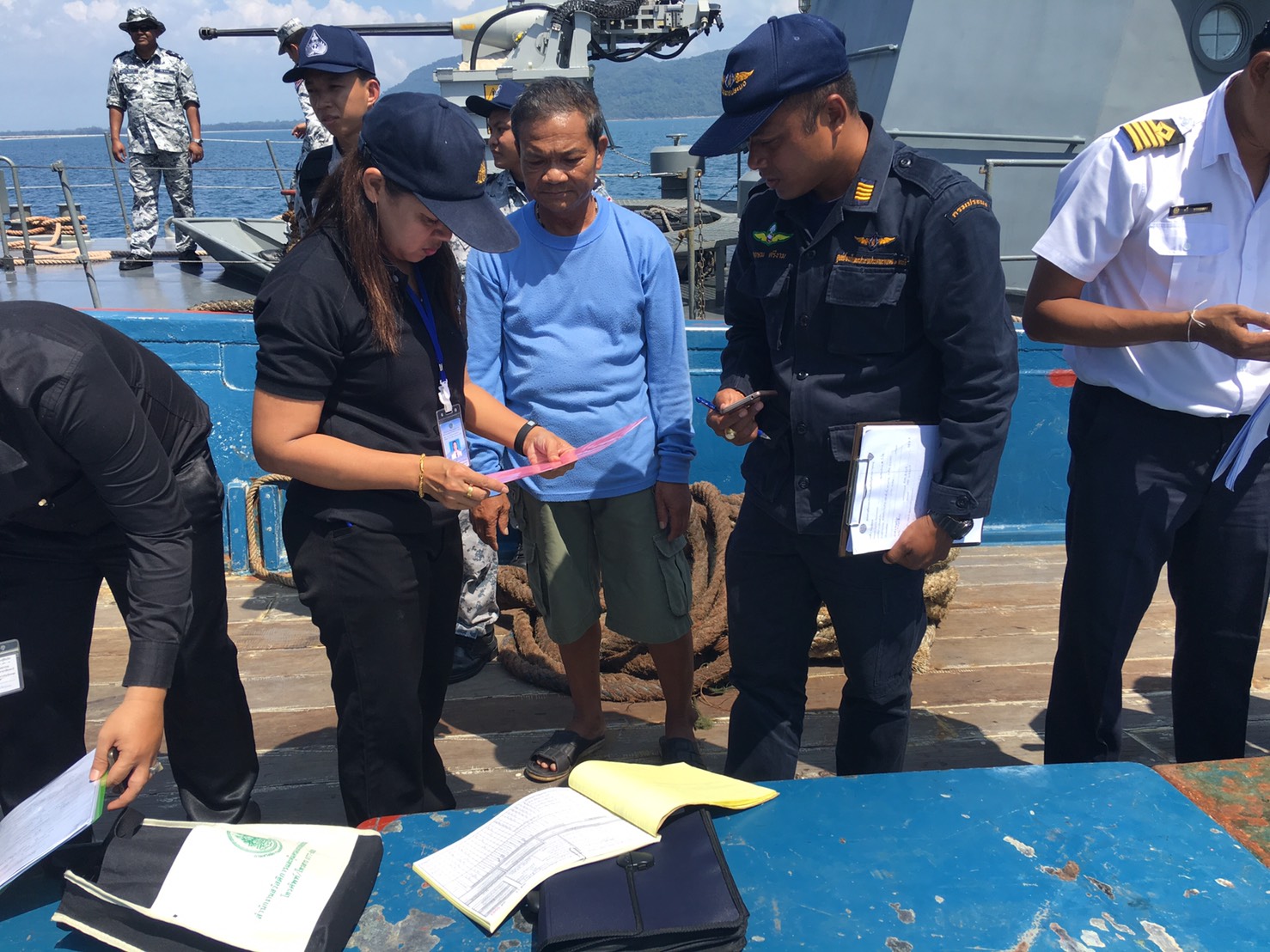 ผลการตรวจสอบ พบเรือประมง จำนวน 5 ลำ  ลูกจ้างรวมทั้งสิ้น 40 คน (คนไทย จำนวน 9 คน และแรงงานต่างด้าวสัญชาติเมียนมา จำนวน 31 คน ) และมอบยาสามัญประจำเรือ ให้กับเรือทั้ง 5 ลำ