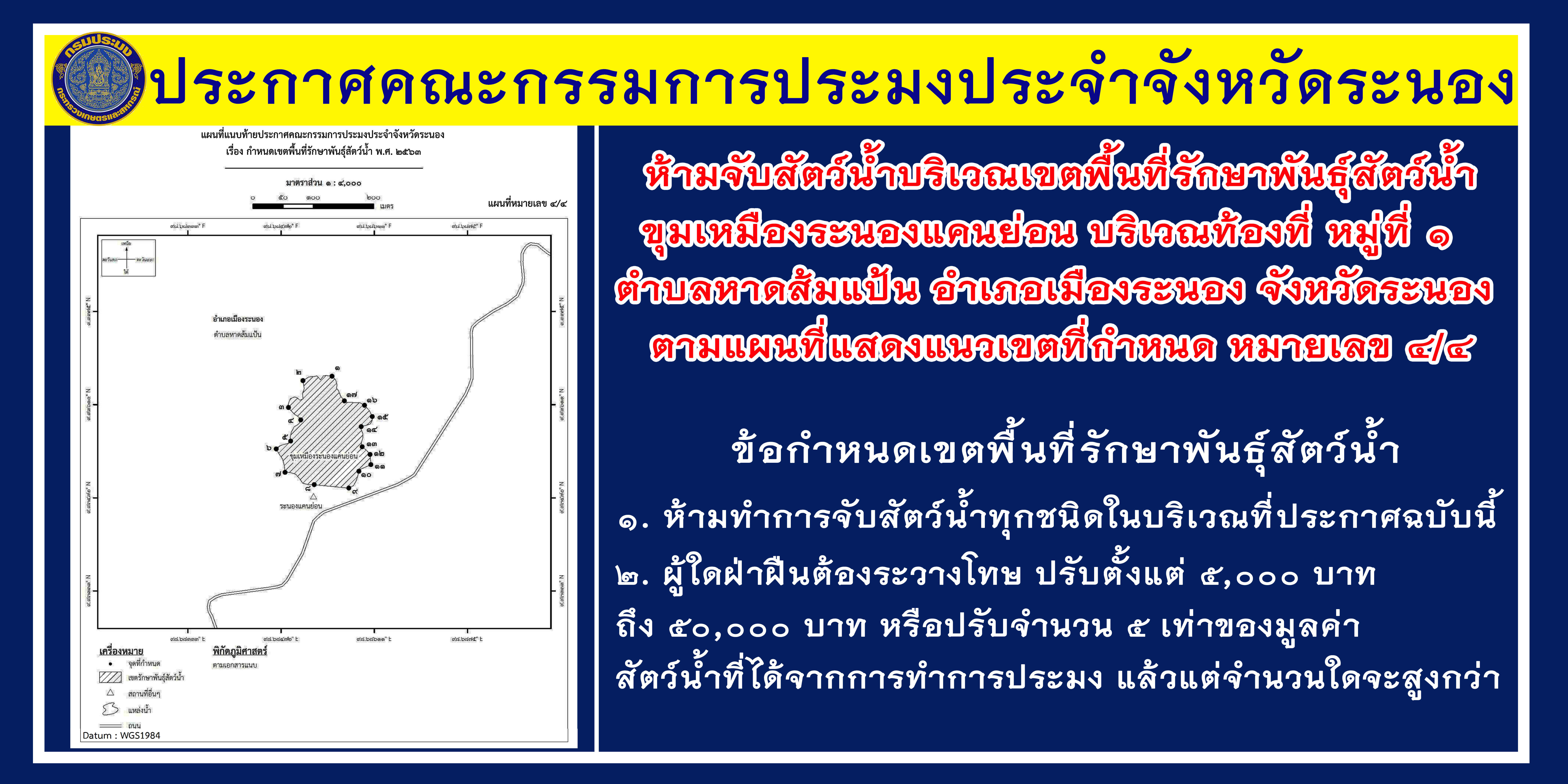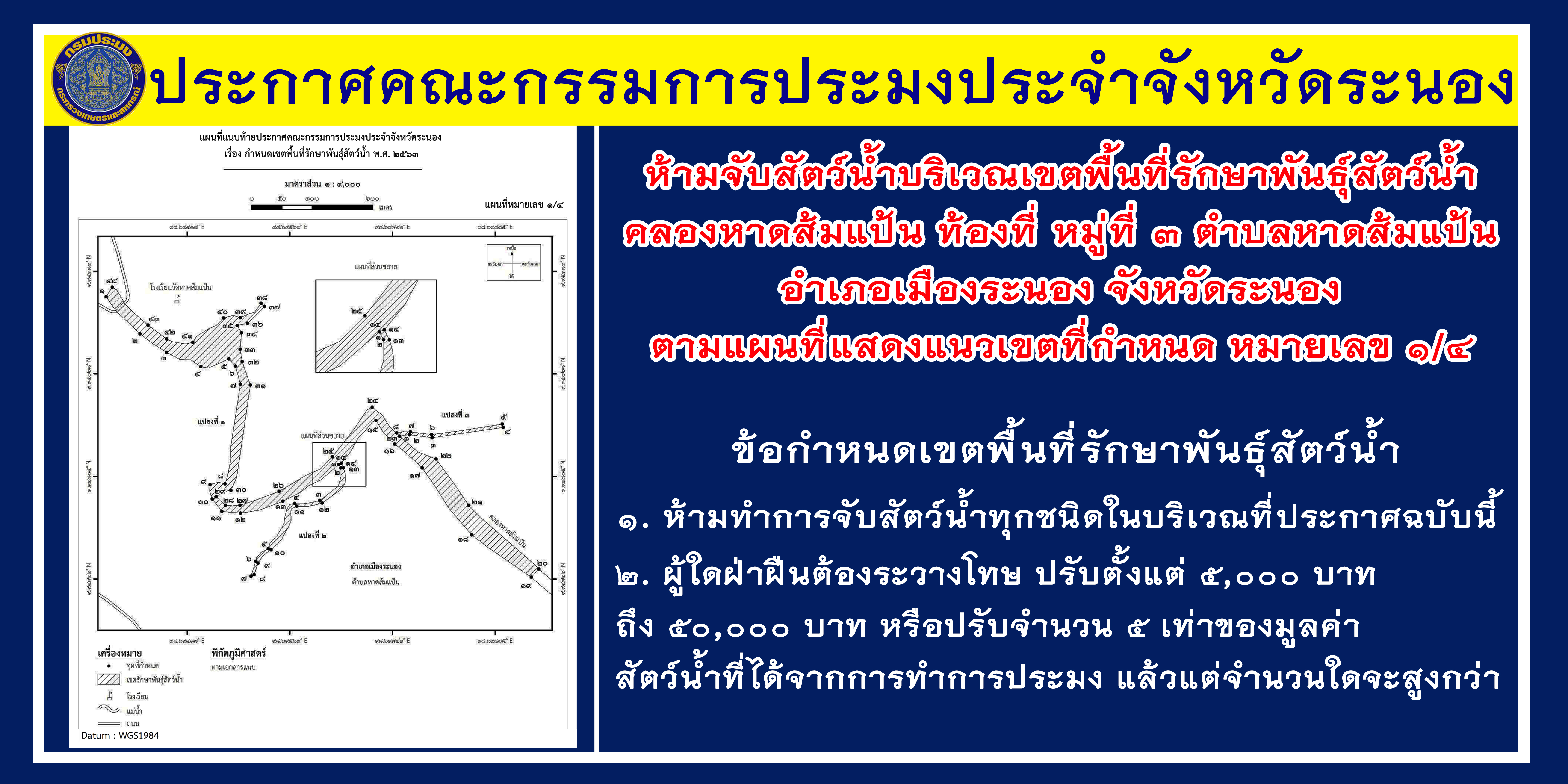 (1) ประกาศจังหวัดระนอง เรื่อง กำหนดที่จับสัตว์น้ำประเภทที่รักษาพืชพันธุ์ ลงวันที่