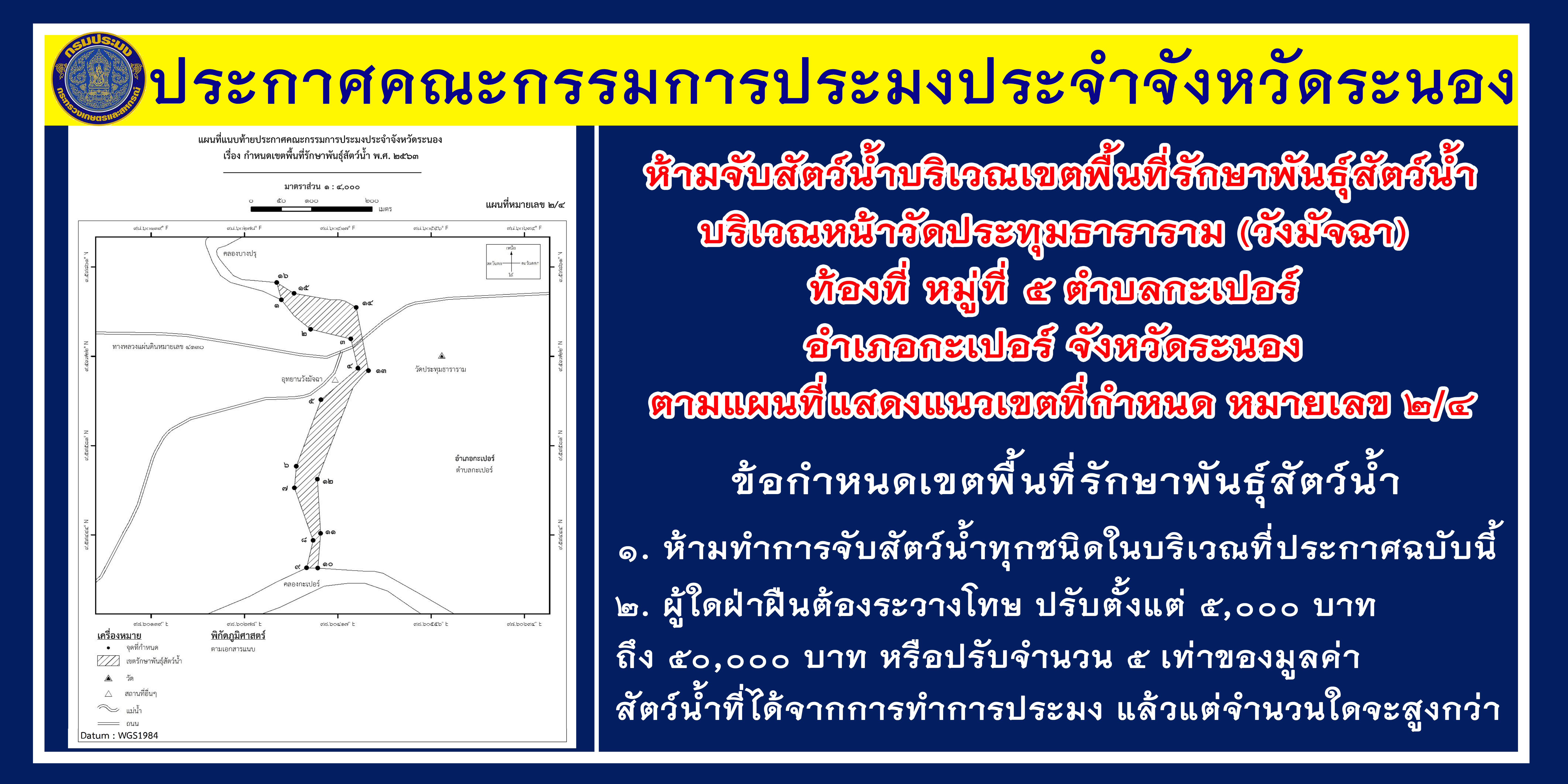 (2) ประกาศจังหวัดระนอง เรื่อง กำหนดที่จับสัตว์น้ำประเภทที่รักษาพืชพันธุ์ ลงวันที่