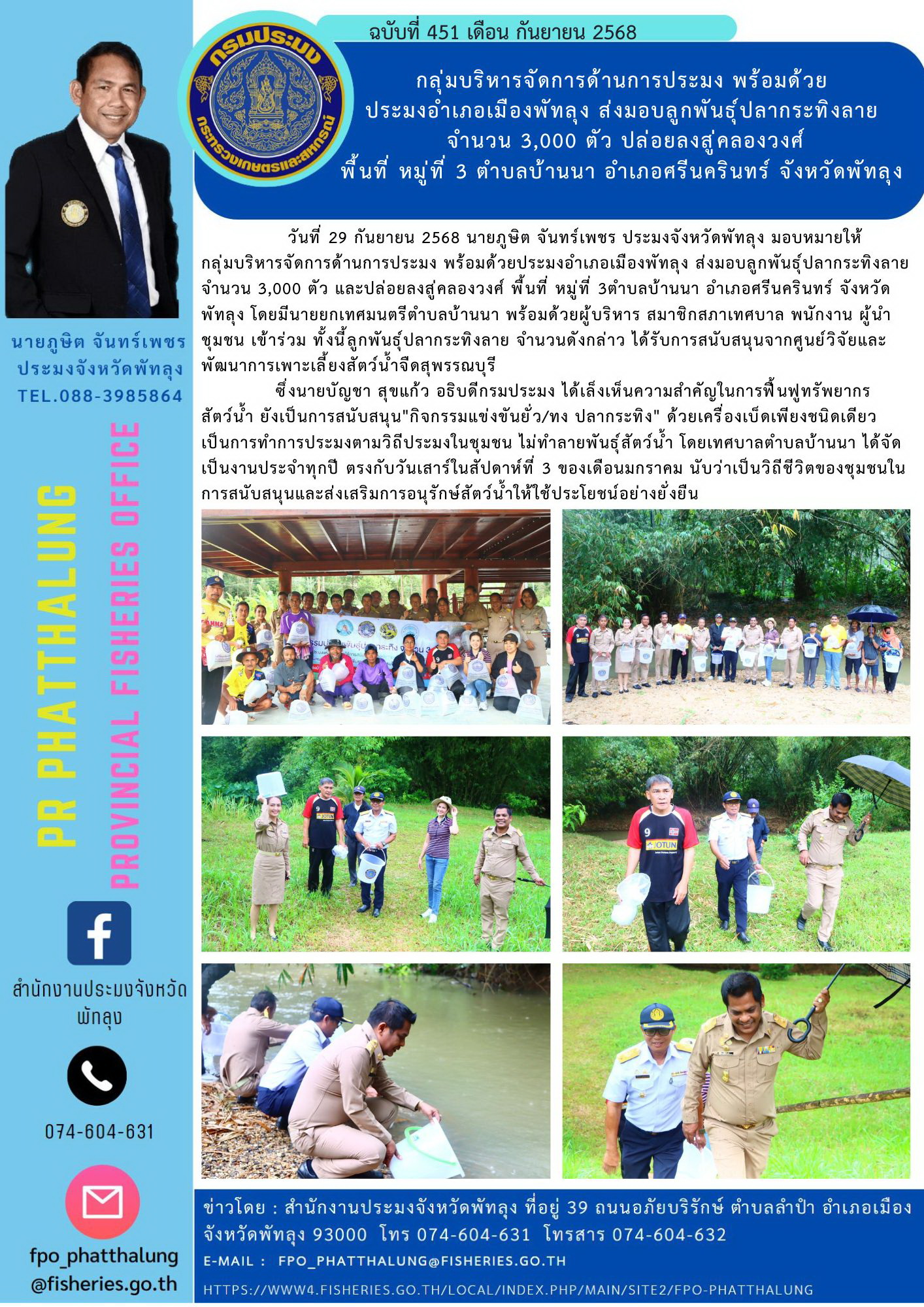 NEW กลุ่มบริหารจัดการด้านการประมง พร้อมด้วย ประมงอำเภอเมืองพัทลุง ส่งมอบลูกพันธุ์ปลากระทิงลาย   จำนวน 3,000 ตัว ปล่อยลงสู่คลองวงศ์  พื้นที่ หมู่ที่ 3 ตำบลบ้านนา อำเภอศรีนครินทร์ จังหวัดพัทลุง..คลิก