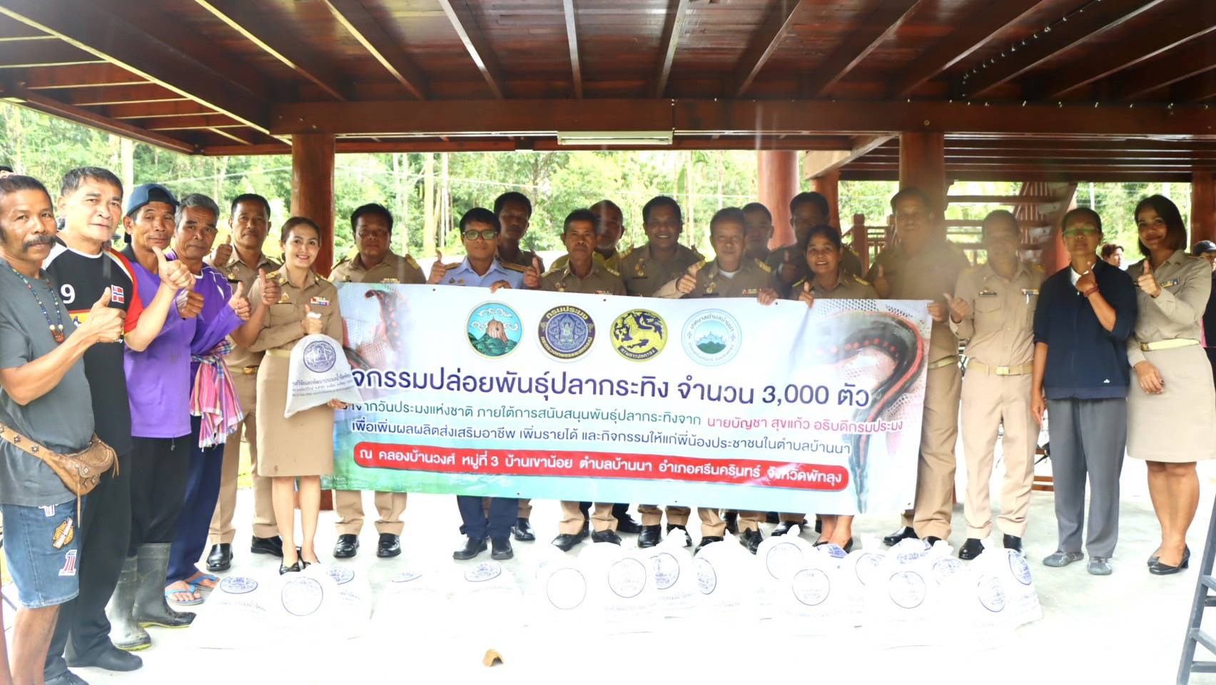 กลุ่มบริหารจัดการด้านการประมง พร้อมด้วย ประมงอำเภอเมืองพัทลุง ส่งมอบลูกพันธุ์ปลากระทิงลาย จำนวน 3,000 ตัว ปล่อยลงสู่คลองวงศ์ พื้นที่ หมู่ที่ 3 ตำบลบ้านนา อำเภอศรีนครินทร์ จังหวัดพัทลุง