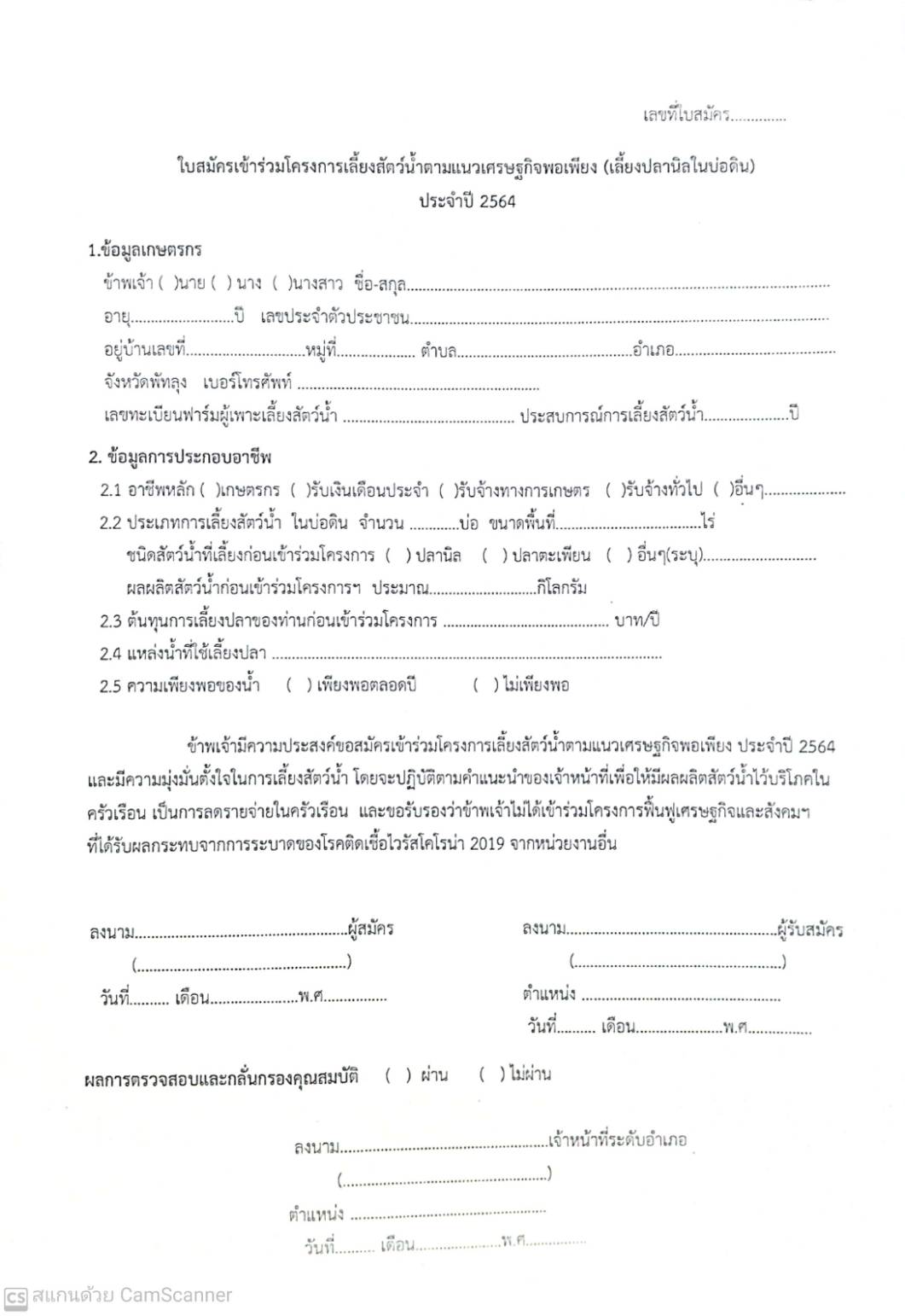 ใบสมัครเข้าร่วมโครงการเลี้ยงสัตว์น้ำตามแนวเศรษฐกิจพอเพียง (เลี้ยงปลานิลในบ่อดิน) ประจำปี 2564