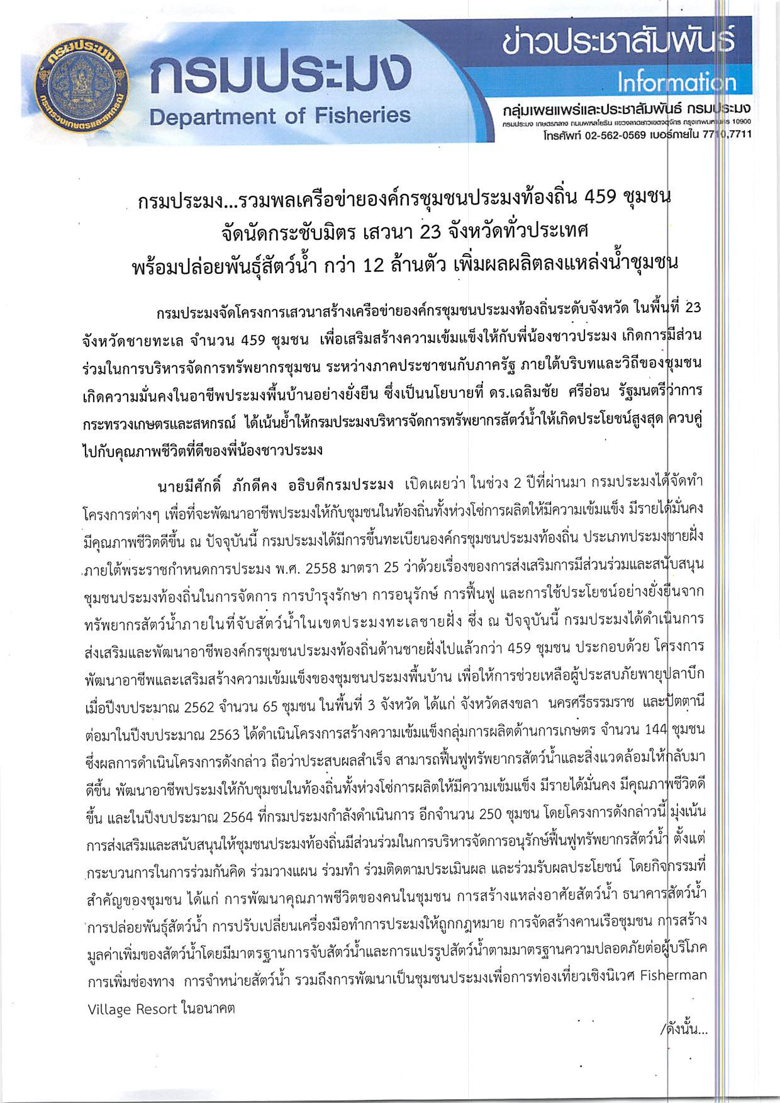 กรมประมง...รวมพลเครือข่ายองค์กรชุมชนประมงท้องถิ่น 459 ชุมชน นัดกระชับมิตร เสวนา 23 จังหวัดทั่วประเทศ...