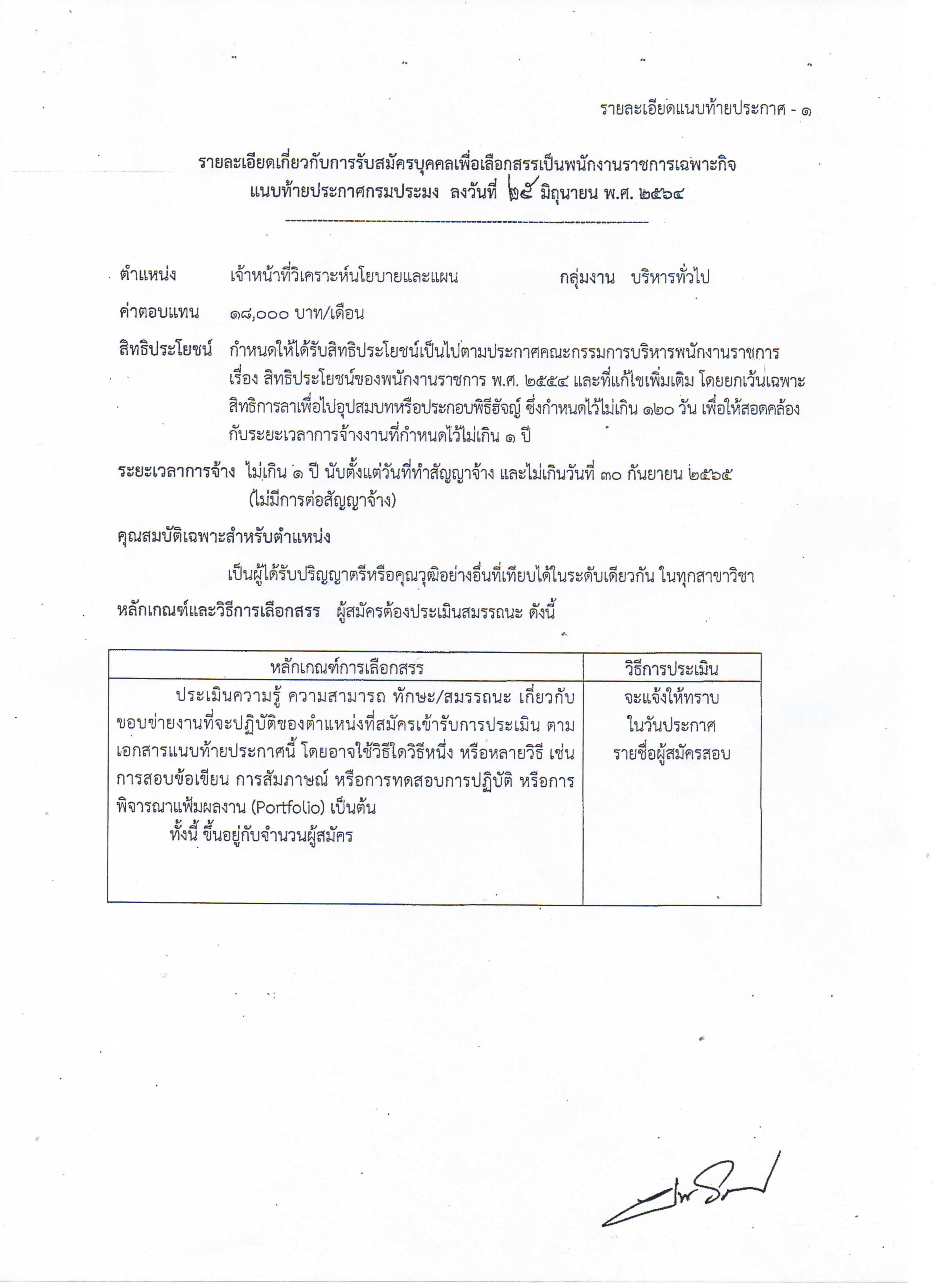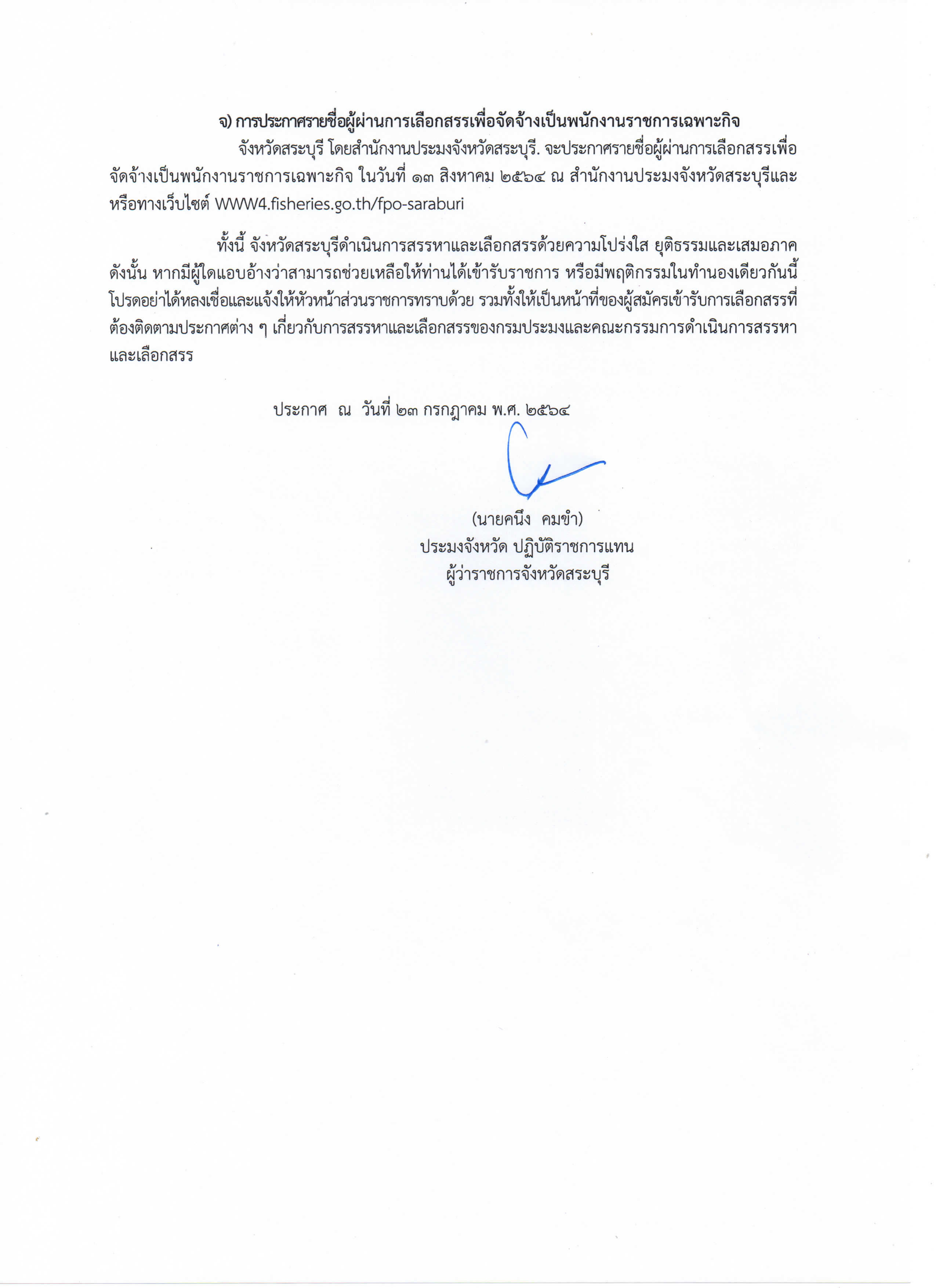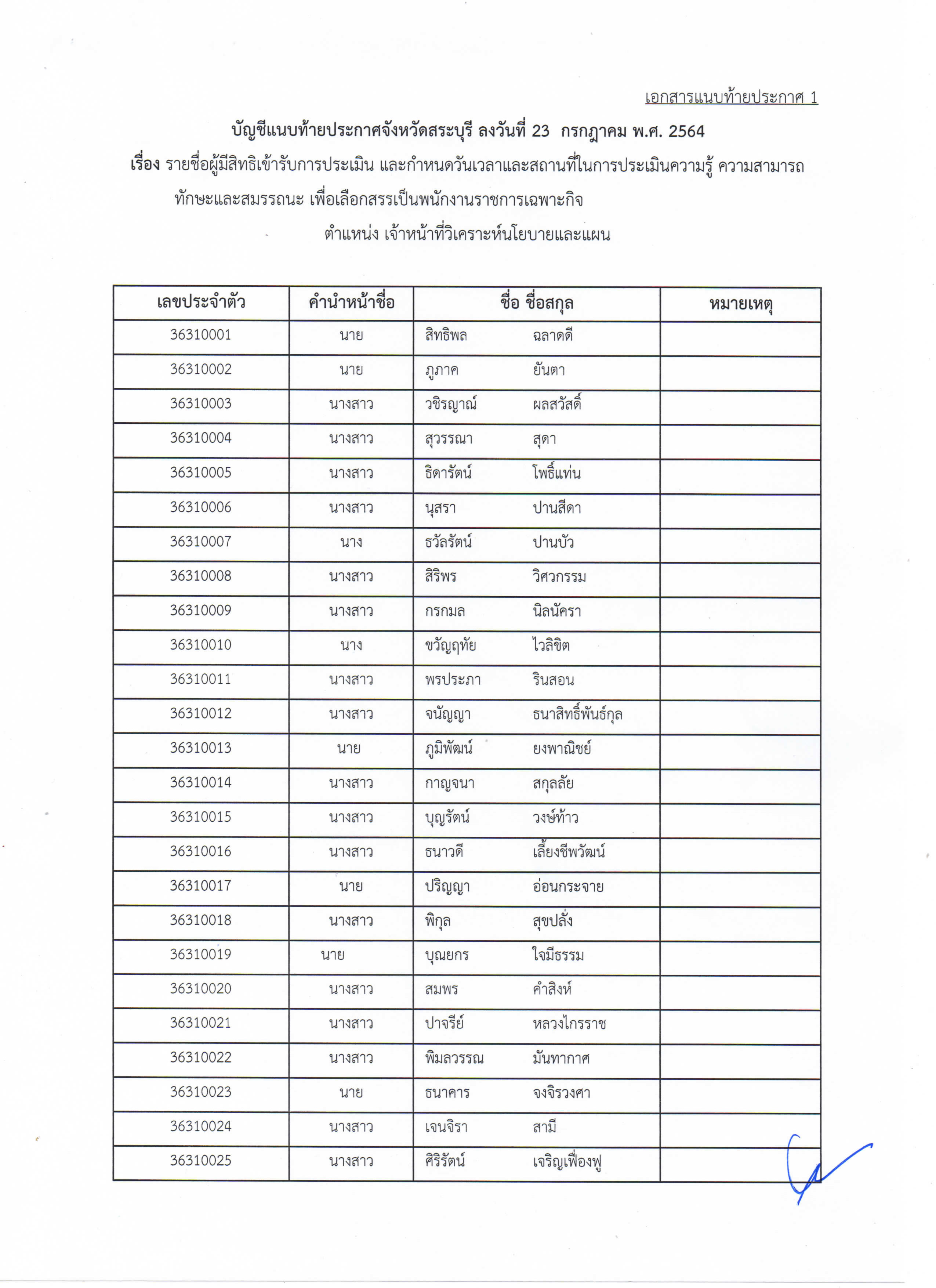 ประกาศจังหวัดสระบุรี เรื่อง รายชื่อผู้มีสิทธิเข้ารับการประเมิน และกำหนดวันเวลา และสถานที่ในการประเมินความรู้ ความสามารถ ทักษะและสมรรถนะ เพื่อเลือกสรรเป็นพนักงานราชการเฉพาะกิจ ตำแหน่งเจ้าหน้าที่วิเคราะห์นโยบายและแผน