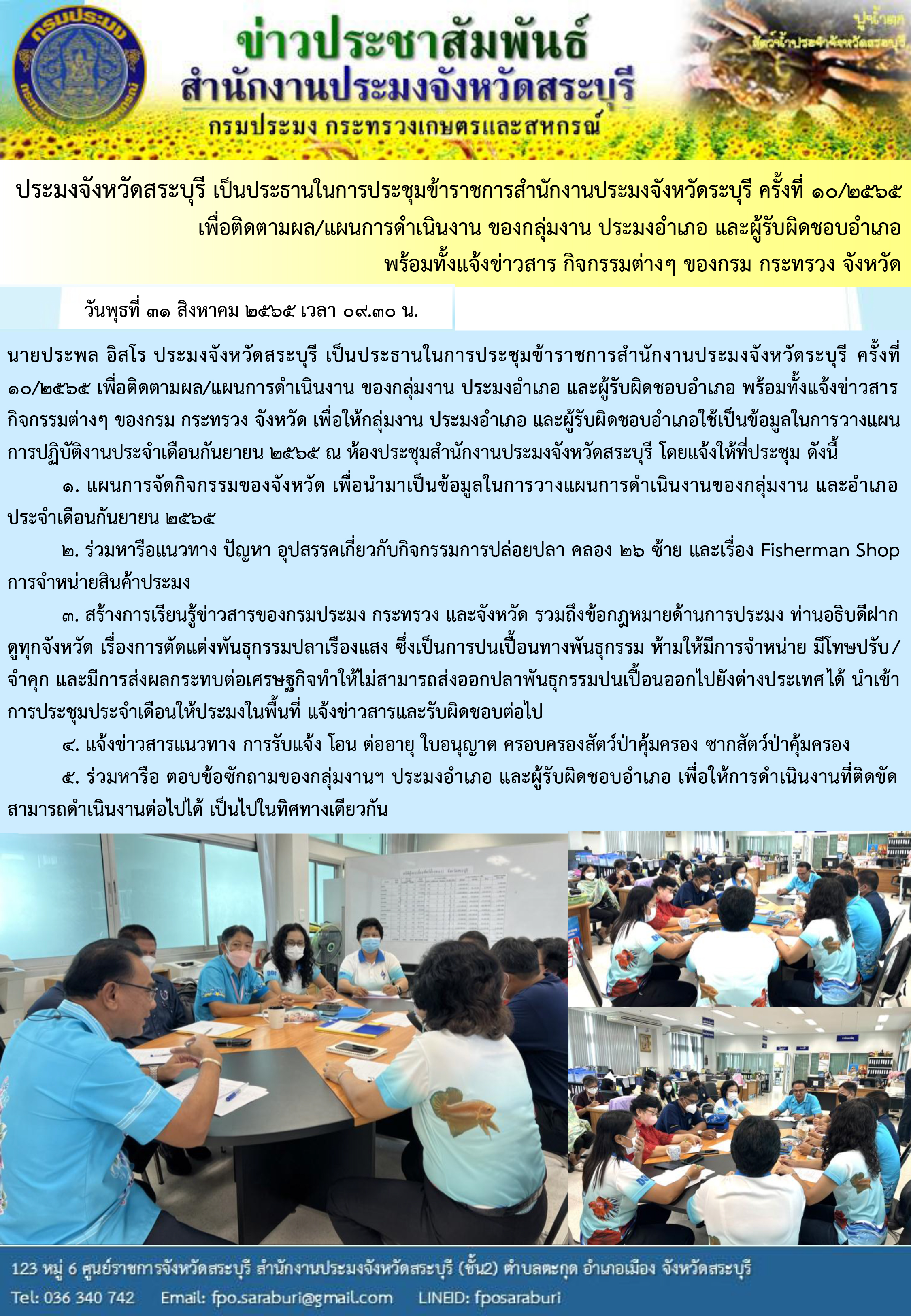 ภารกิจประจำวันที่ 31 สิงหาคม 2565 สำนักงานประมงจังหวัดสระบุรี