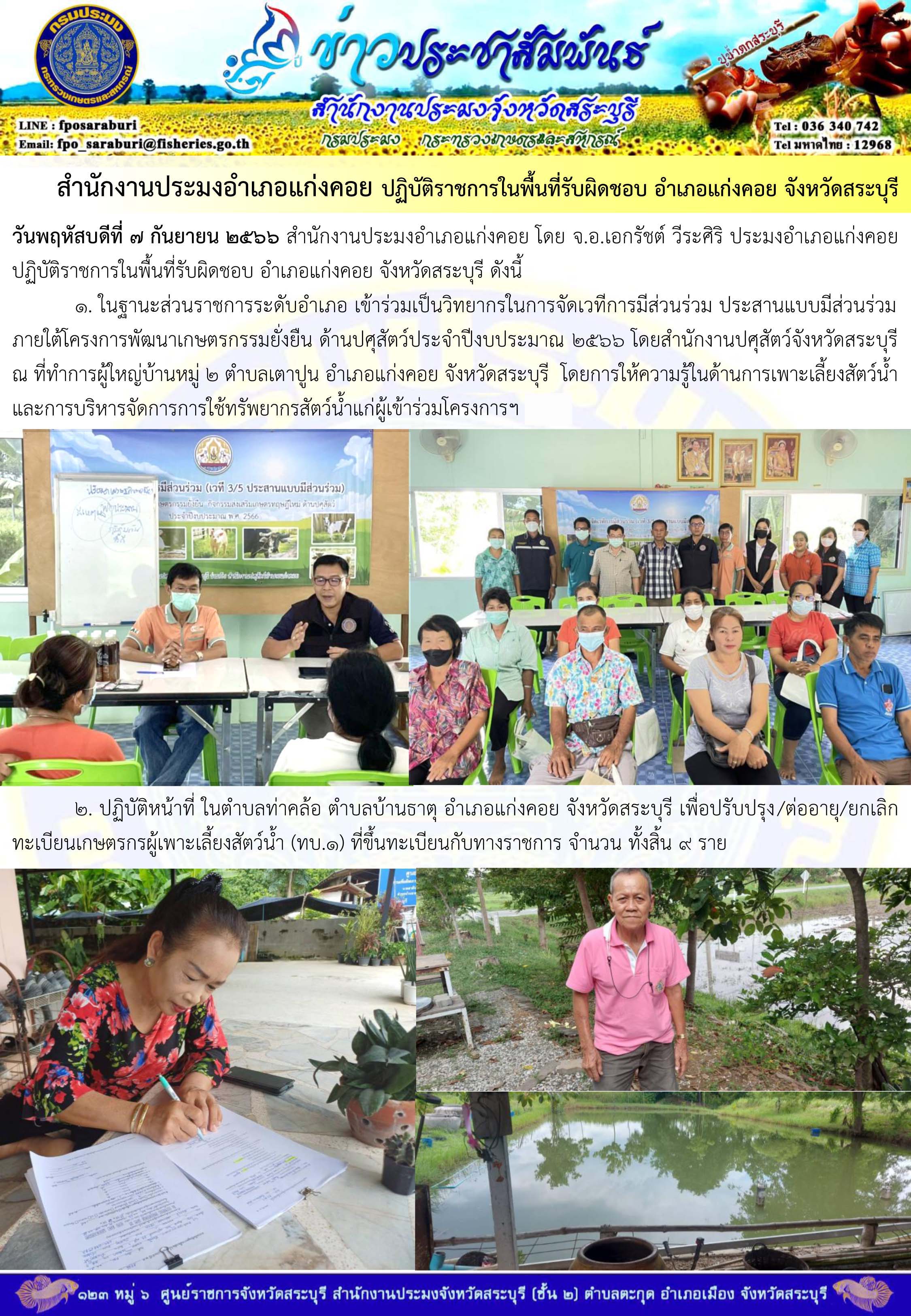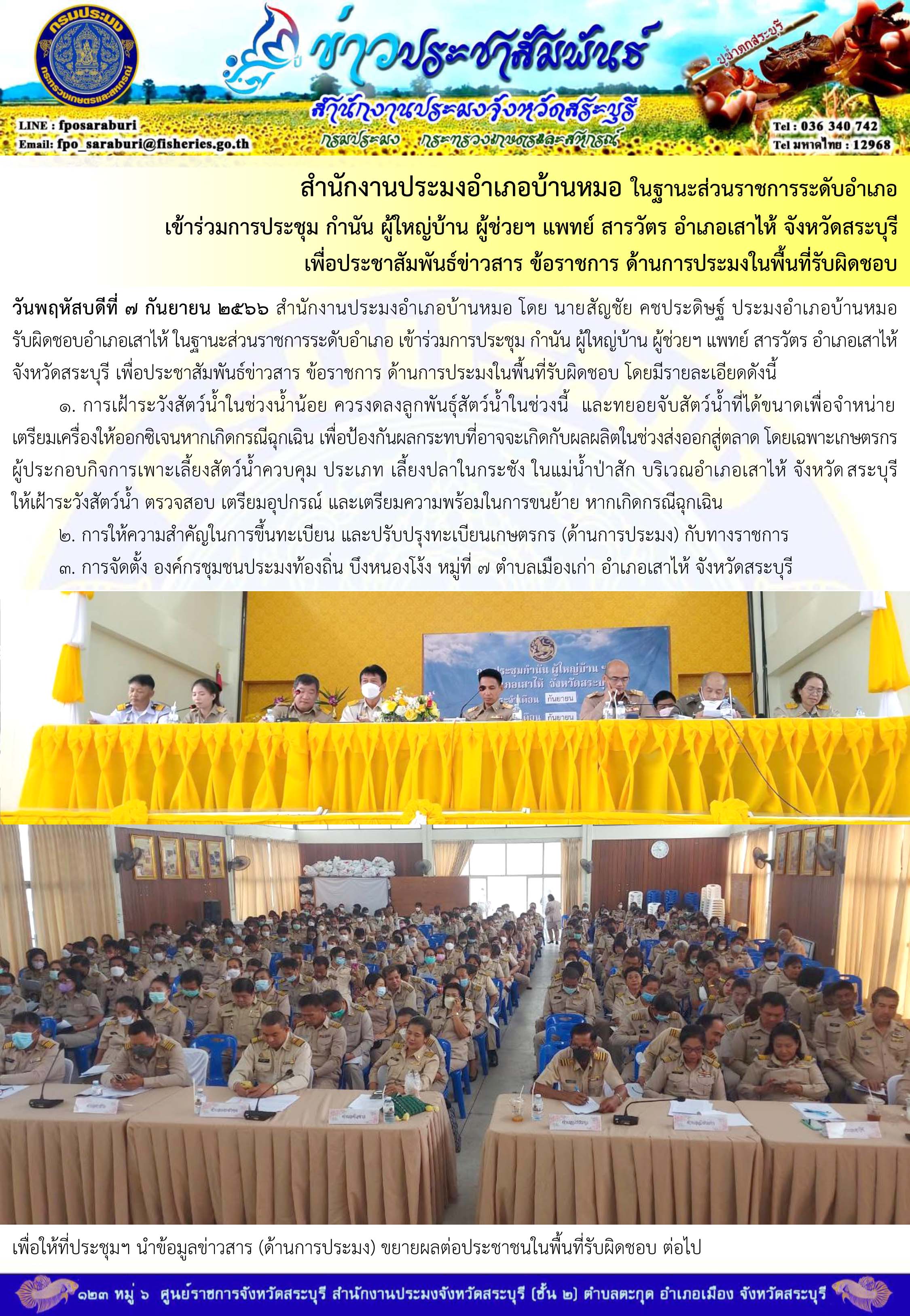 ภารกิจประจำวันที่ 7 กันยายน 2566 สำนักงานประมงจังหวัดสระบุรี