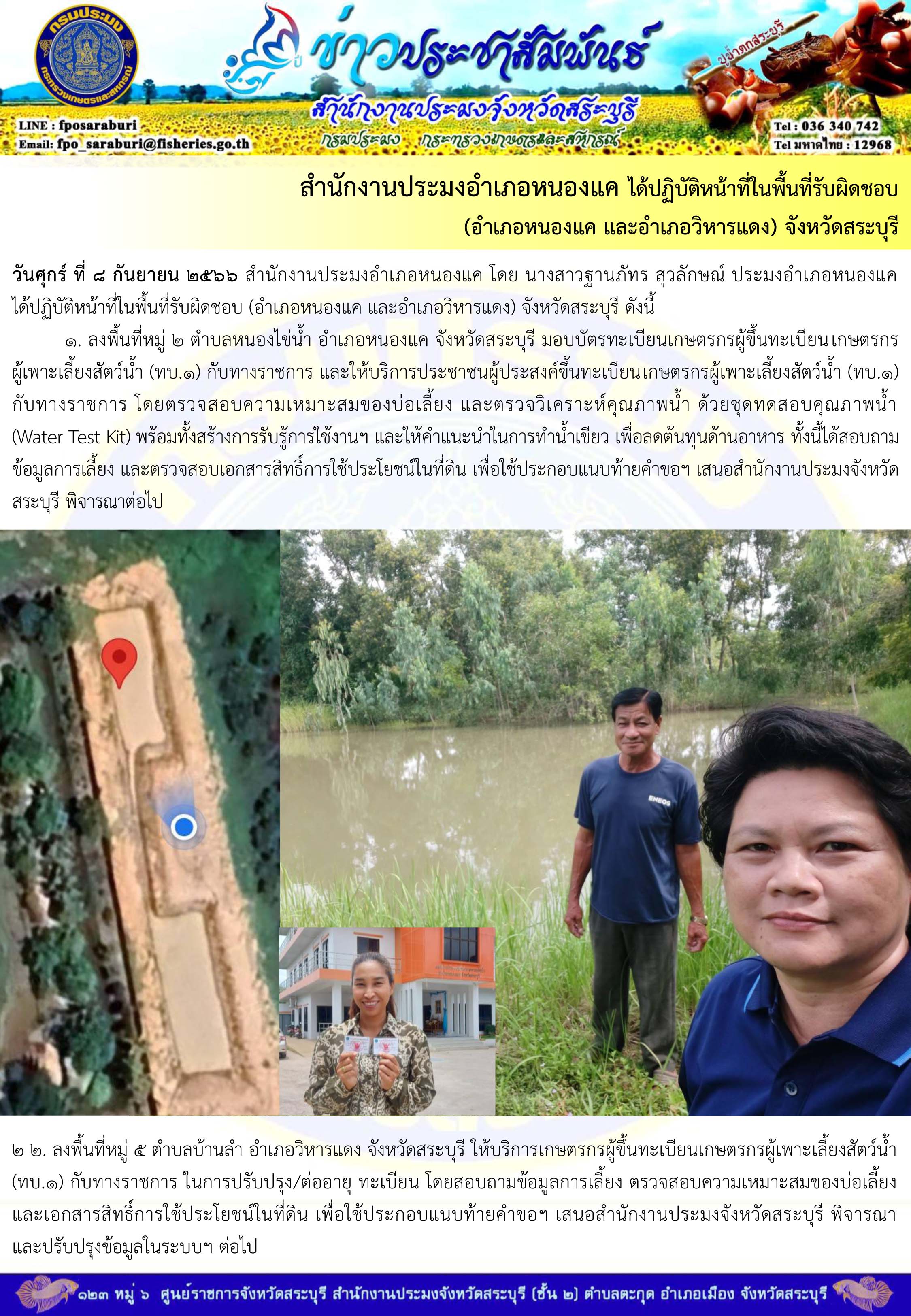 ภารกิจประจำวันที่ 8 กันยายน 2566 สำนักงานประมงจังหวัดสระบุรี