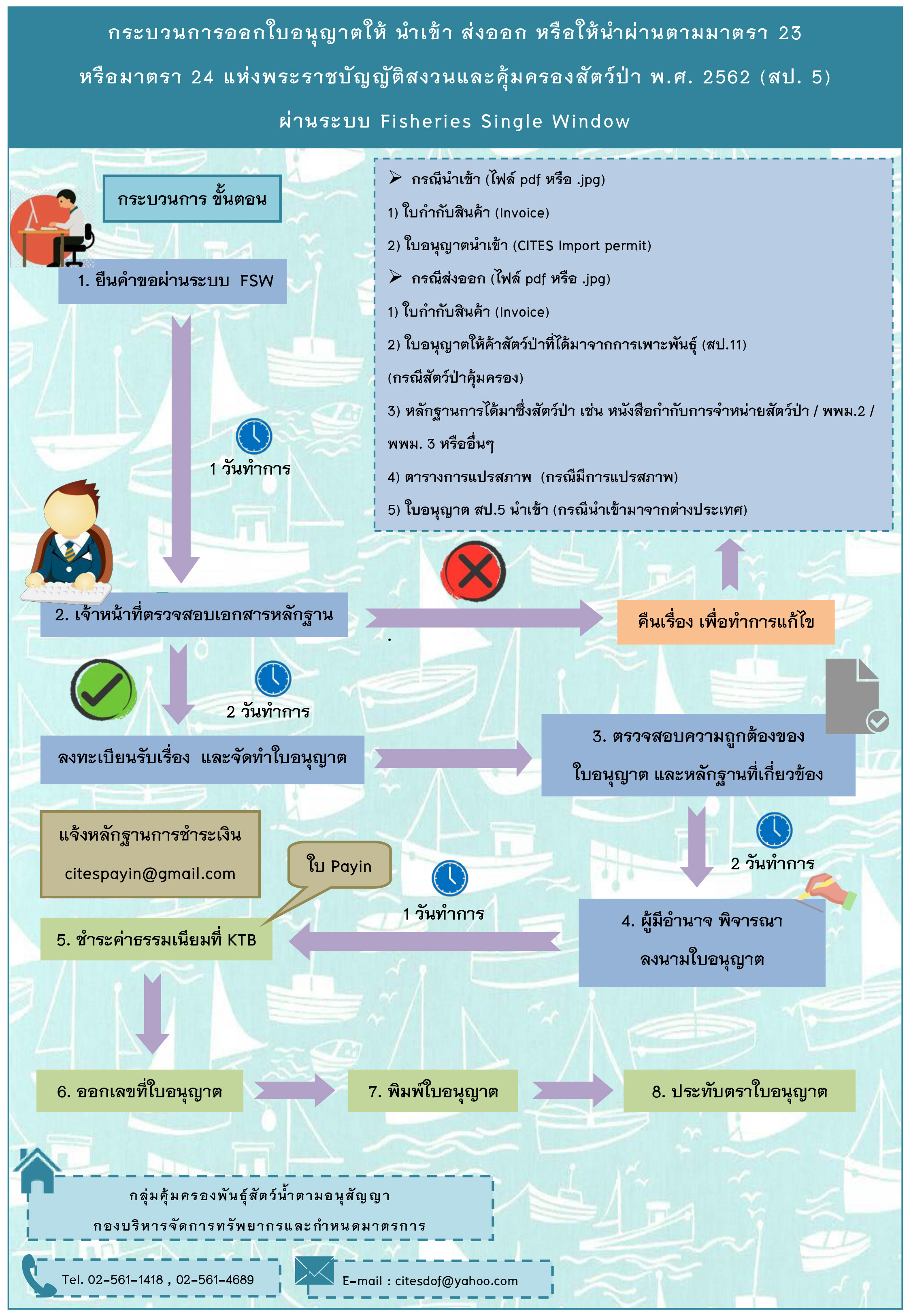 กระบวนการออกใบอนุญาตให้ นำเข้า ส่งออก หรือให้นำผ่านตามาตรา 23 หรือมาตร 24 แห่งพระราชบัญญัติสงวนและคุ้มครองสัตว์ป่า พ.ศ. 2562 (สป.5) ผ่านระบบ Fisheries Single Window