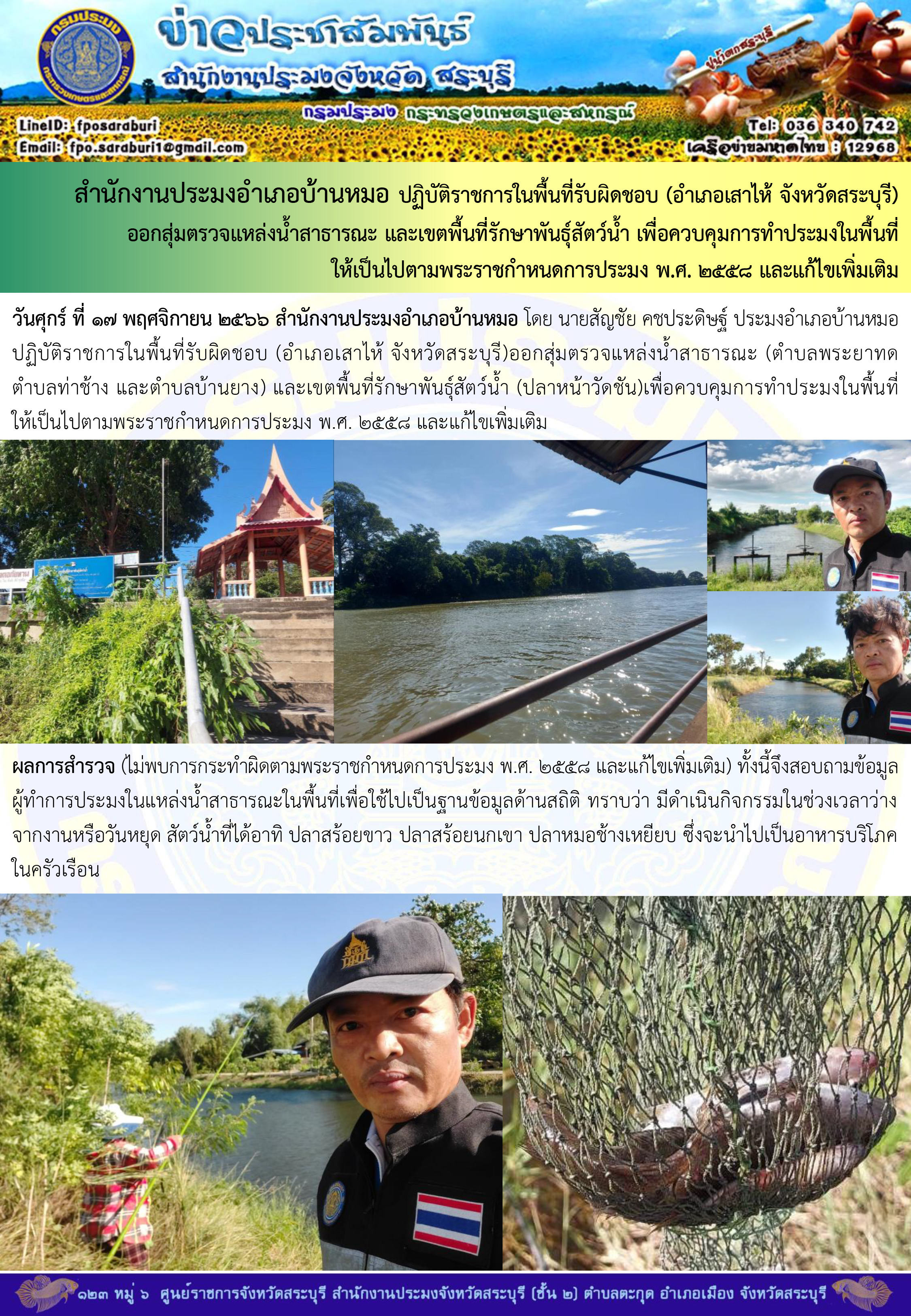 ภารกิจประจำวันที่ 17 พฤศจิกายน 2566 สำนักงานประมงจังหวัดสระบุรี