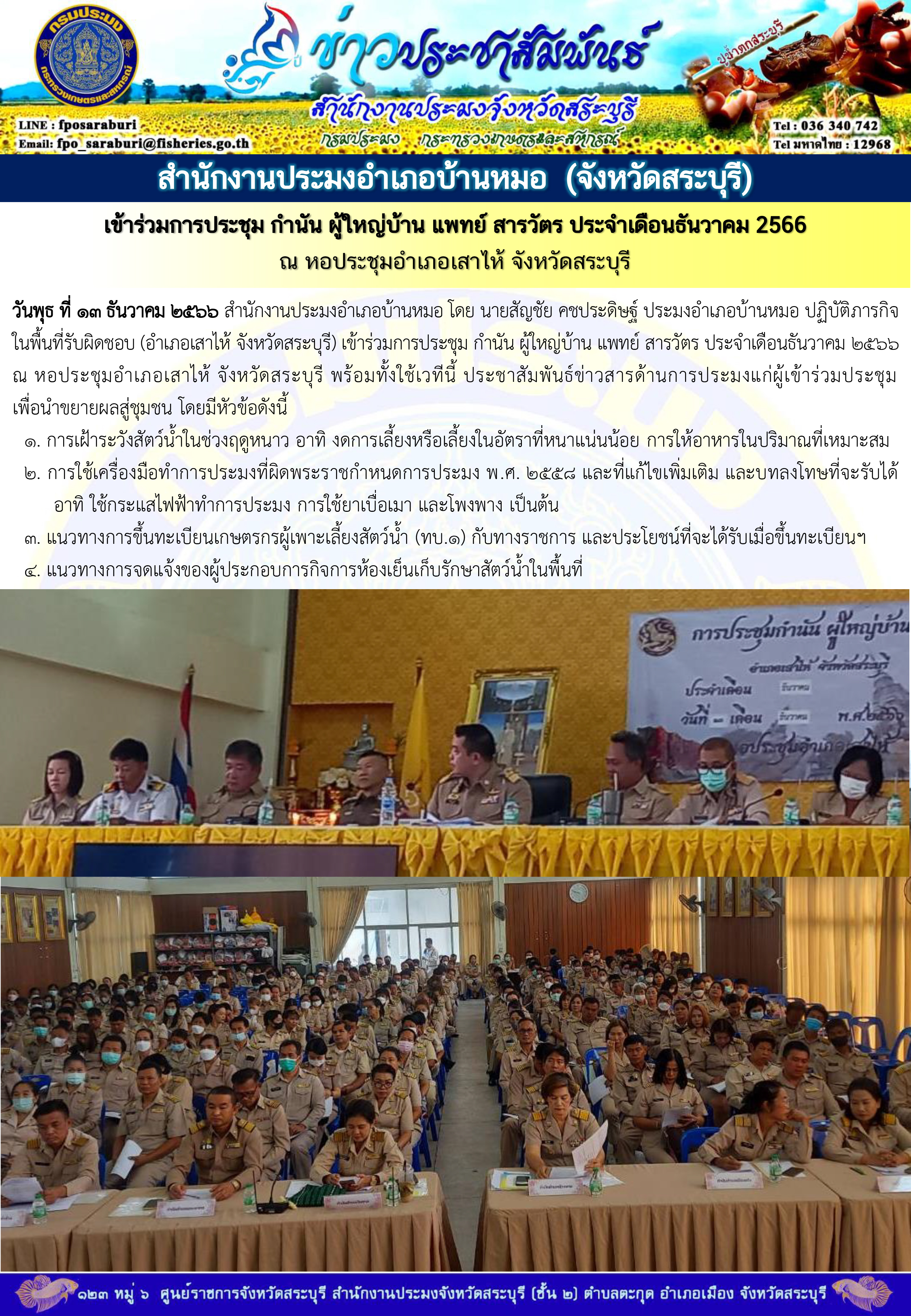 ภารกิจประจำวันที่ 13 ธันวาคม 2566 สำนักงานประมงจังหวัดสระบุรี