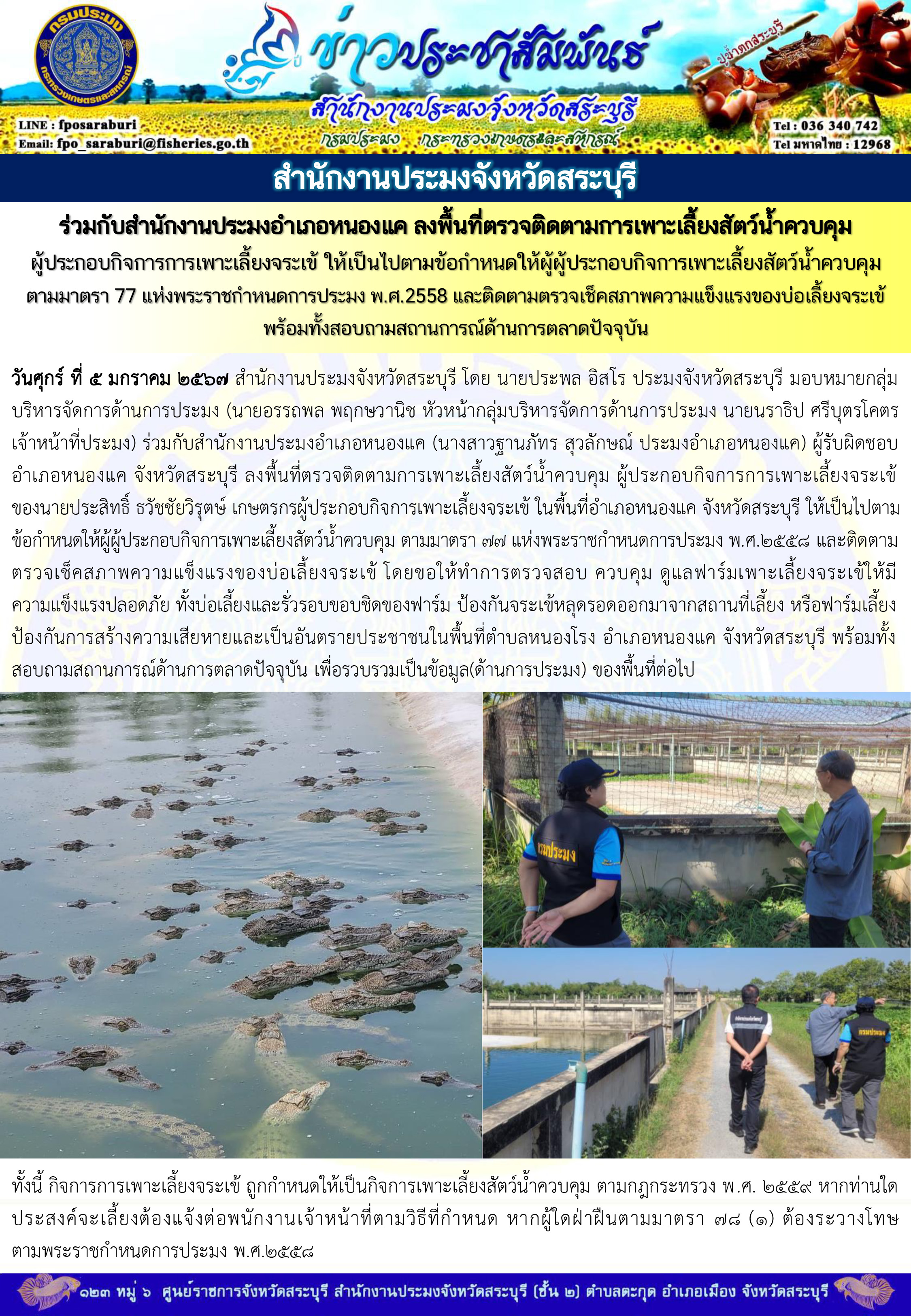 สำนักงานประมงจังหวัดสระบุรี ร่วมกับสำนักงานประมงอำเภอหนองแค ลงพื้นที่ตรวจติดตามการเพาะเลี้ยงสัตว์น้ำควบคุม ผู้ประกอบกิจการการเพาะเลี้ยงจระเข้ ให้เป็นไปตามข้อกำหนดให้ผู้ผู้ประกอบกิจการเพาะเลี้ยงสัตว์น้ำควบคุม ตามมาตรา 77 แห่งพระราชกำหนดการประมง พ.ศ.2558 และติดตามตรวจเช็คสภาพความแข็งแรงของบ่อเลี้ยงจระเข้ พร้อมทั้งสอบถามสถานการณ์ด้านการตลาดปัจจุบัน