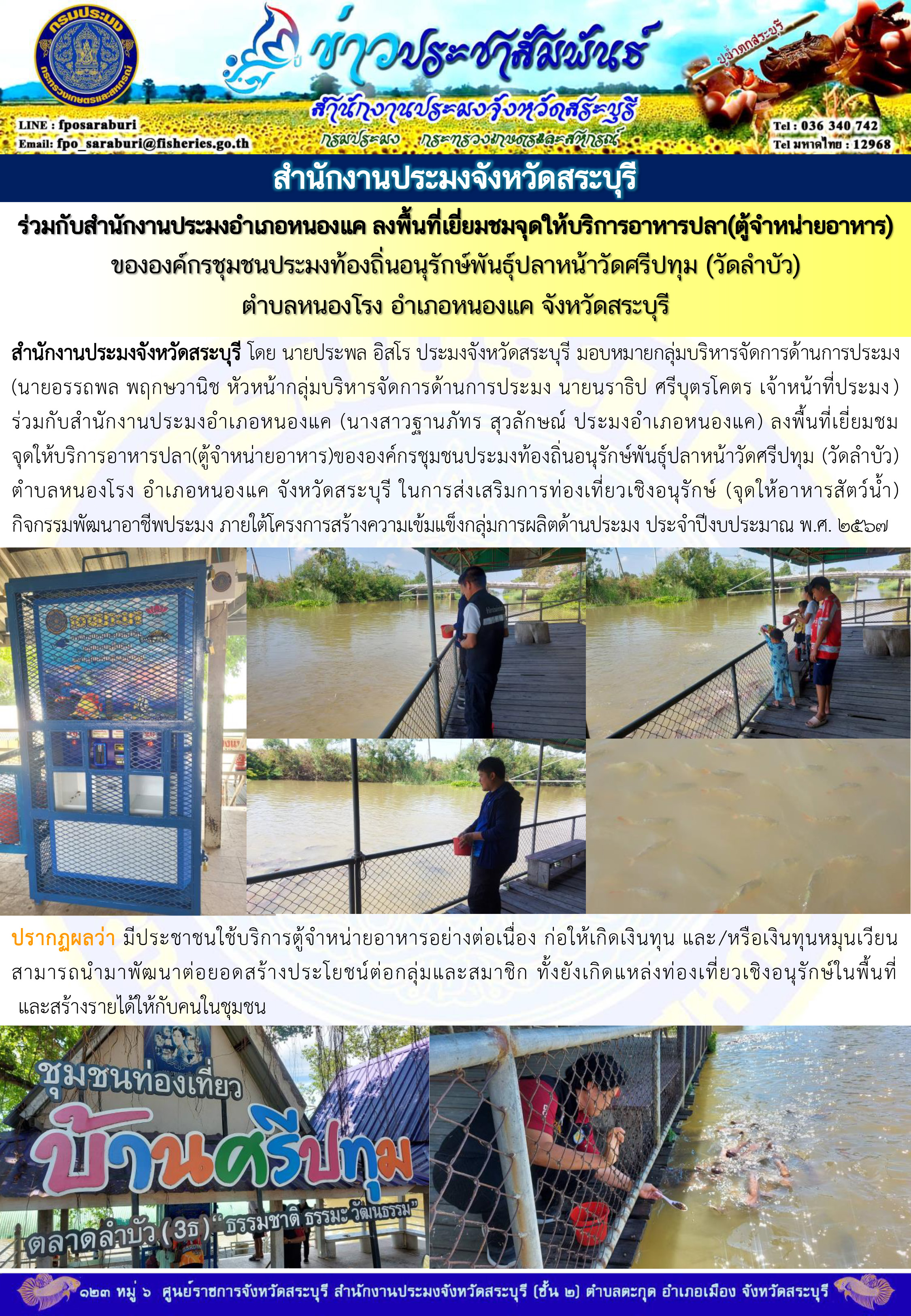 สำนักงานประมงจังหวัดสระบุรี ร่วมกับสำนักงานประมงอำเภอหนองแค ลงพื้นที่เยี่ยมชมจุดให้บริการอาหารปลา(ตู้จำหน่ายอาหาร)ขององค์กรชุมชนประมงท้องถิ่นอนุรักษ์พันธุ์ปลาหน้าวัดศรีปทุม (วัดลำบัว) ตำบลหนองโรง อำเภอหนองแค จังหวัดสระบุรี
