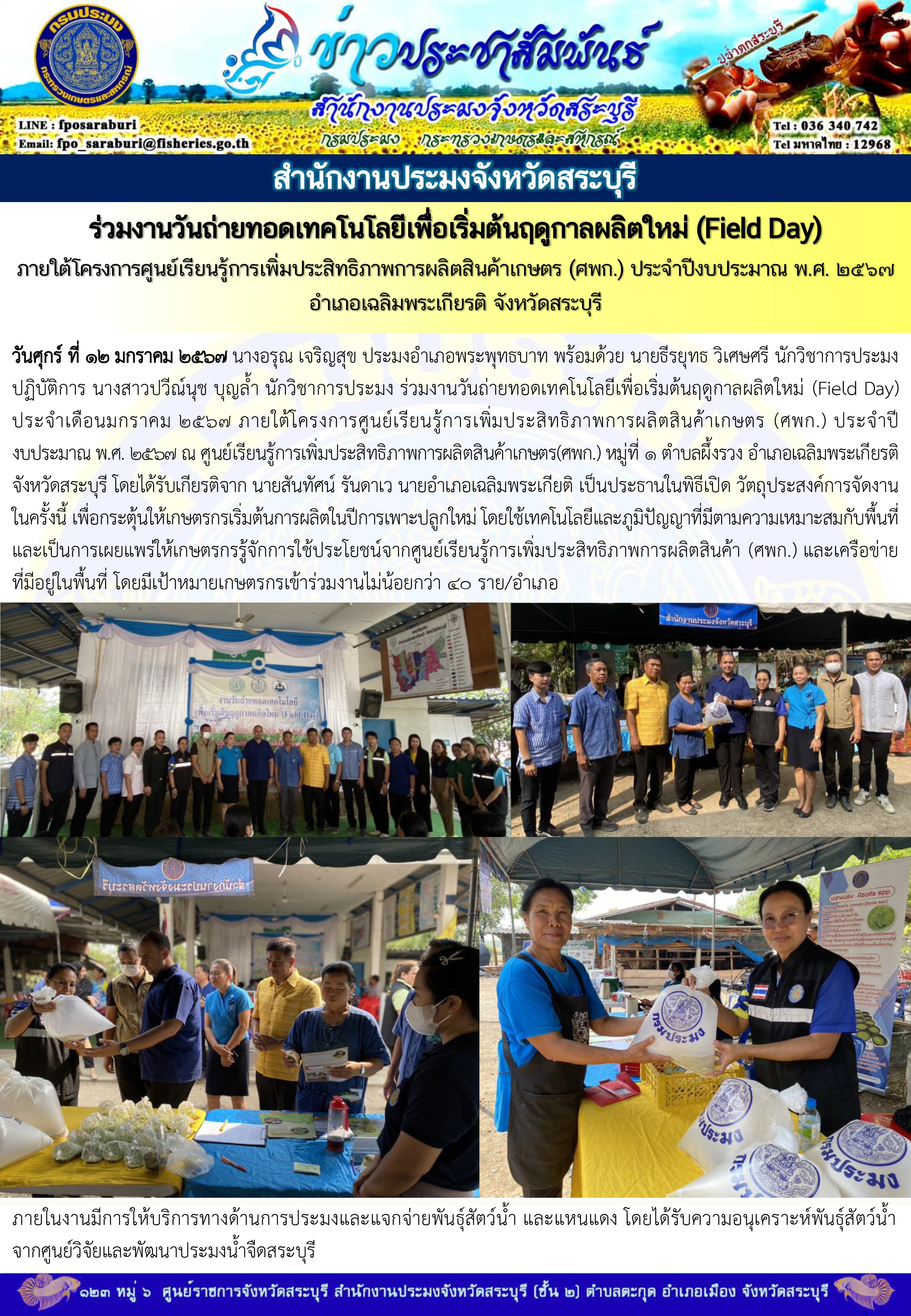 วันศุกร์ ที่ 12 มกราคม 2567 นางอรุณ เจริญสุข ประมงอำเภอพระพุทธบาทพร้อมด้วย นายธีรยุทธ วิเศษศรี นักวิชาการประมงปฏิบัติการ นางสาวปวีณ์นุช บุญล้ำ นักวิชาการประมง ร่วมงานวันถ่ายทอดเทคโนโลยีเพื่อเริ่มต้นฤดูกาลผลิตใหม่ (Field Day) ประจำเดือนมกราคม 2567 ภายใต้โครงการศูนย์เรียนรู้การเพิ่มประสิทธิภาพการผลิตสินค้าเกษตร (ศพก.) ประจำปีงบประมาณ พ.ศ. 2567 ณ ศูนย์เรียนรู้การเพิ่มประสิทธิภาพการผลิตสินค้าเกษตร(ศพก.) หมู่ที่ 1 ตำบลผึ้งรวง อำเภอเฉลิมพระเกียรติ จังหวัดสระบุรี โดยได้รับเกียรติจาก นายสันทัศน์ รันดาเว นายอำเภอเฉลิมพระเกียติ เป็นประธานในพิธีเปิด วัตถุประสงค์การจัดงานในครั้งนี้ เพื่อกระตุ้นให้เกษตรกรเริ่มต้นการผลิตในปีการเพาะปลูกใหม่ โดยใช้เทคโนโลยีและภูมิปัญญาที่มีตามความเหมาะสมกับพื้นที่ และเป็นการเผยแพร่ให้เกษตรกรรู้จักการใช้ประโยชน์จากศูนย์เรียนรู้การเพิ่มประสิทธิภาพการผลิตสินค้า (ศพก.) และเครือข่ายที่มีอยู่ในพื้นที่ โดยมีเป้าหมายเกษตรกรเข้าร่วมงานไม่น้อยกว่า 40 ราย/อำเภอ