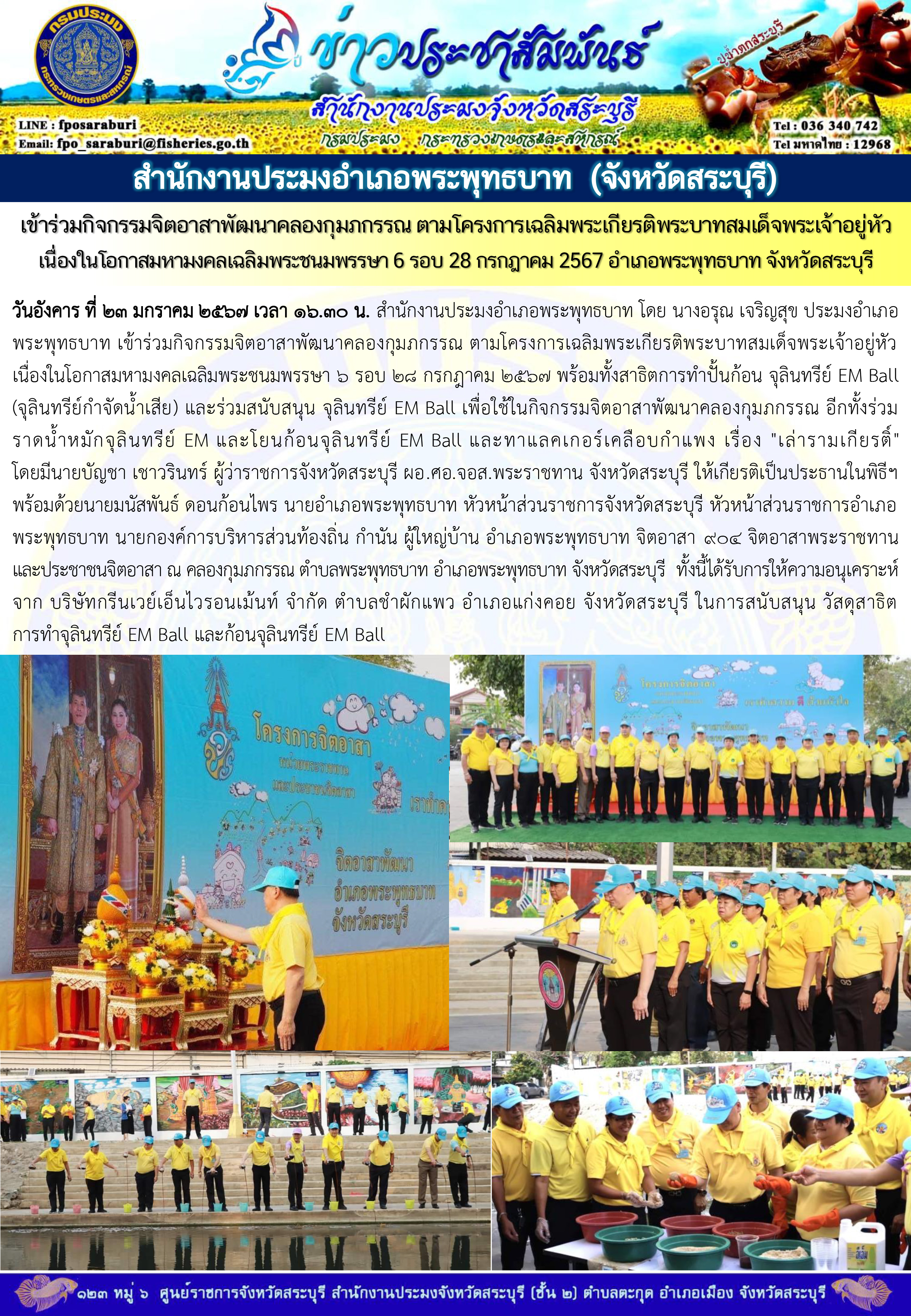 วันอังคาร ที่ 23 มกราคม 2567 เวลา 16.30 น. สำนักงานประมงอำเภอพระพุทธบาท โดย นางอรุณ เจริญสุข ประมงอำเภอพระพุทธบาท เข้าร่วมกิจกรรมจิตอาสาพัฒนาคลองกุมภกรรณ ตามโครงการเฉลิมพระเกียรติพระบาทสมเด็จพระเจ้าอยู่หัว เนื่องในโอกาสมหามงคลเฉลิมพระชนมพรรษา 6 รอบ 28 กรกฎาคม 2567 พร้อมทั้งสาธิตการทำปั้นก้อน จุลินทรีย์ EM Ball (จุลินทรีย์กำจัดน้ำเสีย) และร่วมสนับสนุน จุลินทรีย์ EM Ball เพื่อใช้ในกิจกรรมจิตอาสาพัฒนาคลองกุมภกรรณ อีกทั้งร่วมราดน้ำหมักจุลินทรีย์ EM และโยนก้อนจุลินทรีย์ EM Ball และทาแลคเกอร์เคลือบกำแพง เรื่อง "เล่ารามเกียรติ์" โดยมีนายบัญชา เชาวรินทร์ ผู้ว่าราชการจังหวัดสระบุรี ผอ.ศอ.จอส.พระราชทาน จังหวัดสระบุรี ให้เกียรติเป็นประธานในพิธีฯ พร้อมด้วยนายมนัสพันธ์ ดอนก้อนไพร นายอำเภอพระพุทธบาท หัวหน้าส่วนราชการจังหวัดสระบุรี หัวหน้าส่วนราชการอำเภอพระพุทธบาท นายกองค์การบริหารส่วนท้องถิ่น กำนัน ผู้ใหญ่บ้าน อำเภอพระพุทธบาท จิตอาสา 904 จิตอาสาพระราชทาน และประชาชนจิตอาสา ณ คลองกุมภกรรณ ตำบลพระพุทธบาท อำเภอพระพุทธบาท จังหวัดสระบุรี ทั้งนี้ได้รับการให้ความอนุเคราะห์จาก บริษัทกรีนเวย์เอ็นไวรอนเม้นท์ จำกัด ตำบลชำผักแพว อำเภอแก่งคอย จังหวัดสระบุรี ในการสนับสนุน วัสดุสาธิต การทำจุลินทรีย์ EM Ball และก้อนจุลินทรีย์ EM Ball