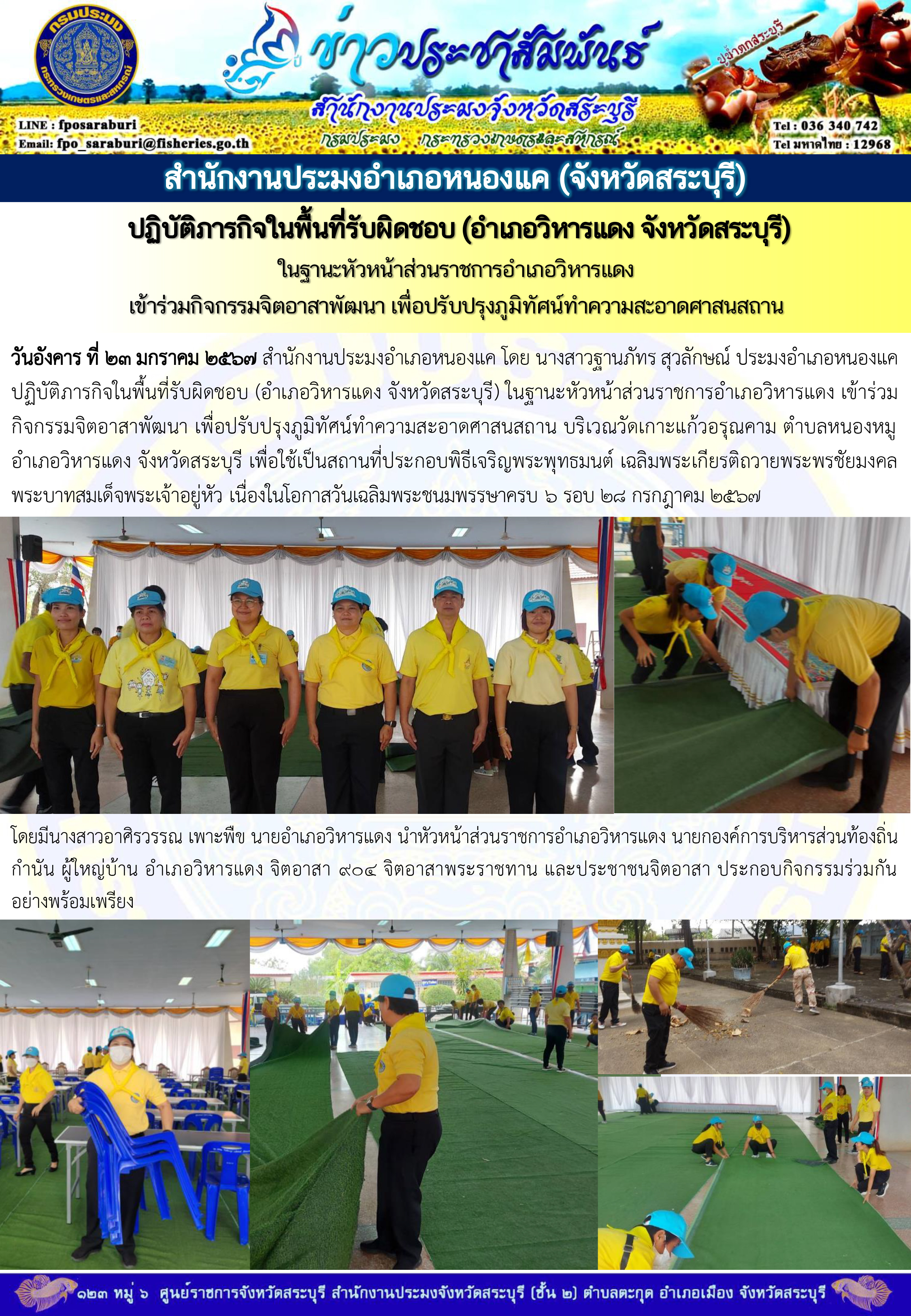 สำนักงานประมงอำเภอหนองแค ปฏิบัติภารกิจในพื้นที่รับผิดชอบ (อำเภอวิหารแดง จังหวัดสระบุรี) ในฐานะหัวหน้าส่วนราชการอำเภอวิหารแดง เข้าร่วมกิจกรรมจิตอาสาพัฒนา เพื่อปรับปรุงภูมิทัศน์ทำความสะอาดศาสนสถาน