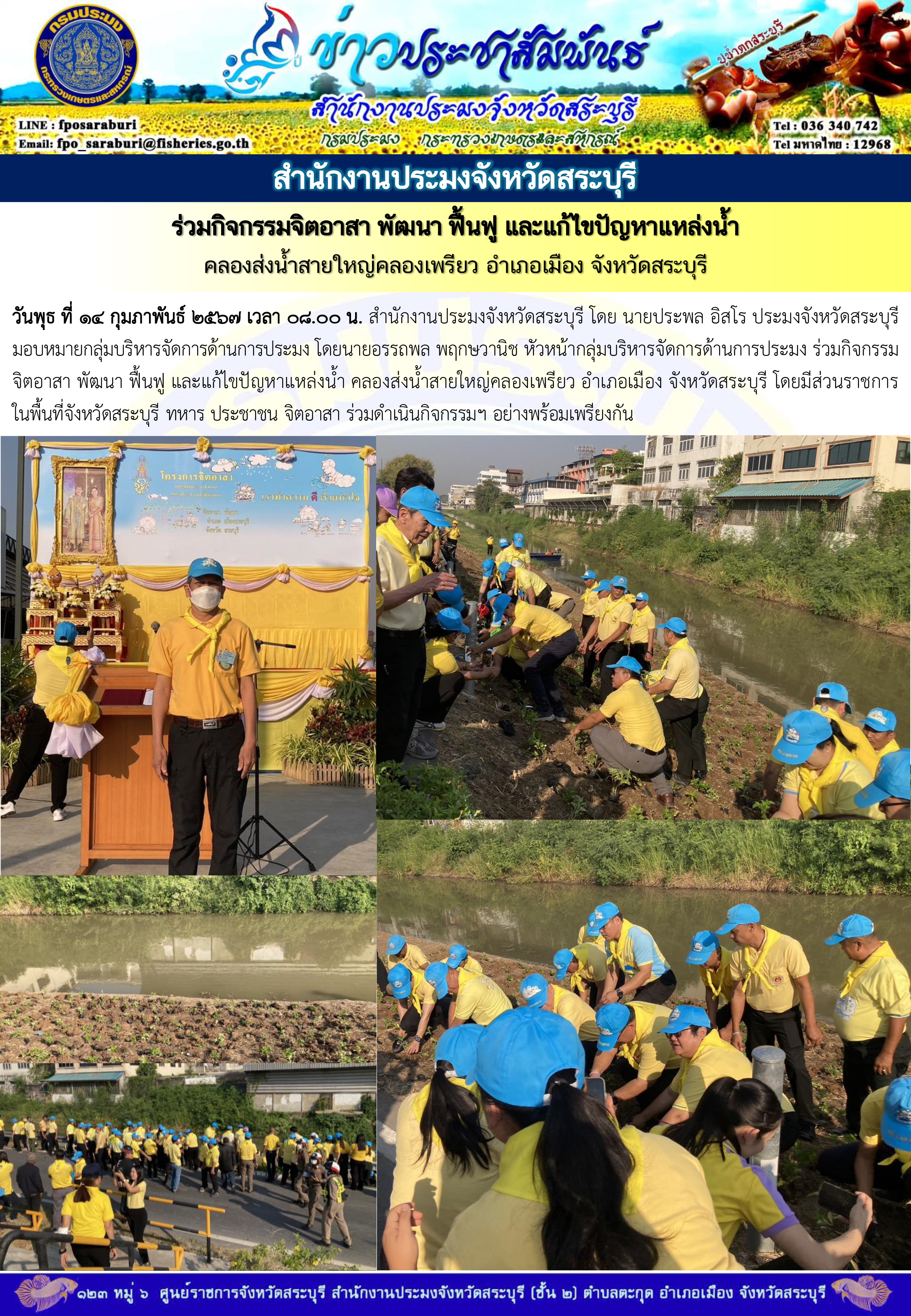 วันพุธ ที่ 14 กุมภาพันธ์ 2567 เวลา 08.00 น. สำนักงานประมงจังหวัดสระบุรี โดย นายประพล อิสโร ประมงจังหวัดสระบุรี มอบหมายกลุ่มบริหารจัดการด้านการประมง โดยนายอรรถพล พฤกษวานิช หัวหน้ากลุ่มบริหารจัดการด้านการประมง ร่วมกิจกรรมจิตอาสา พัฒนา ฟื้นฟู และแก้ไขปัญหาแหล่งน้ำ คลองส่งน้ำสายใหญ่คลองเพรียว อำเภอเมือง จังหวัดสระบุรี โดยมีส่วนราชการในพื้นที่จังหวัดสระบุรี ทหาร ประชาชน จิตอาสา ร่วมดำเนินกิจกรรมฯ อย่างพร้อมเพรียงกัน