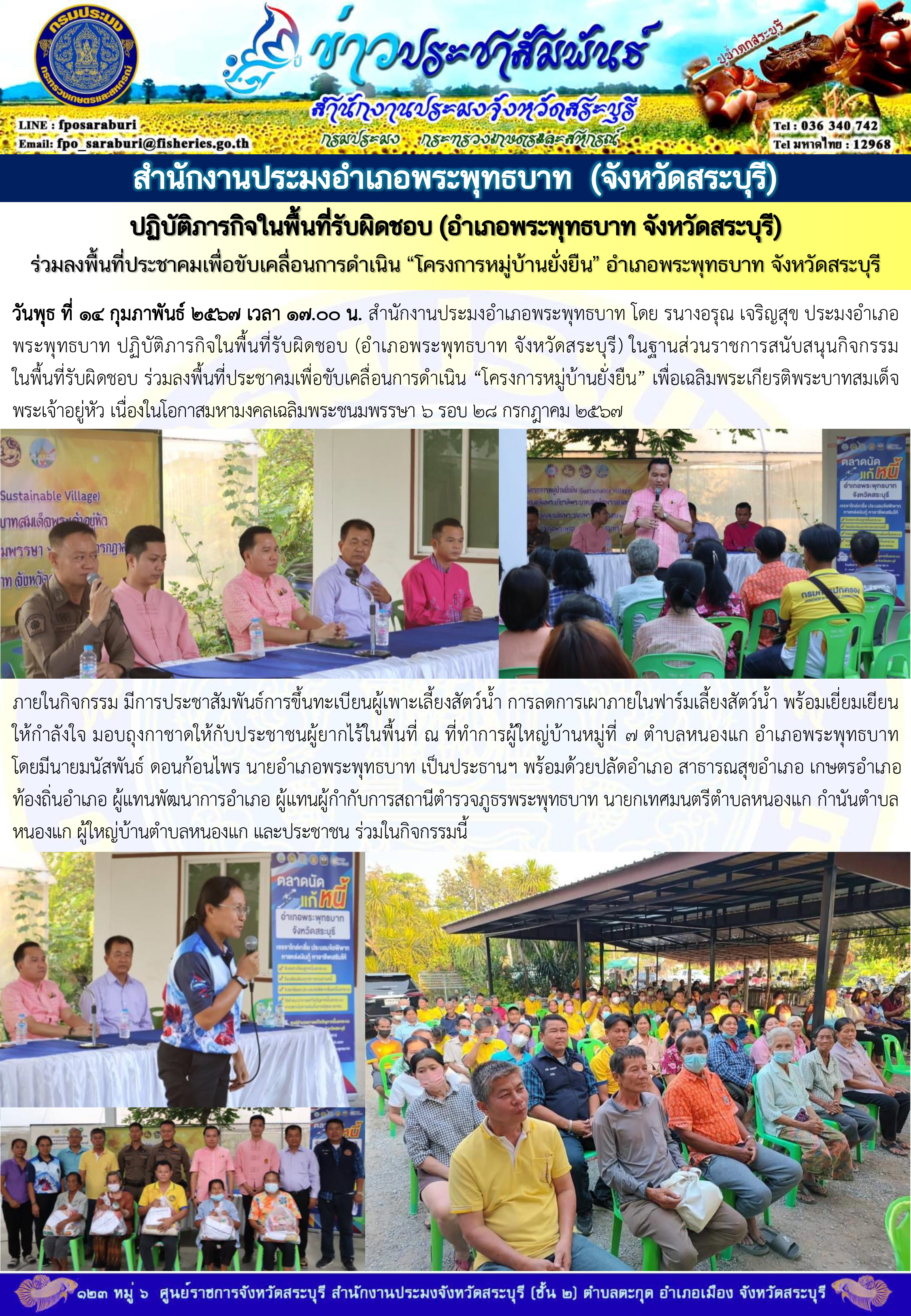 สำนักงานประมงอำเภอพระพุทธบาท ปฏิบัติภารกิจในพื้นที่รับผิดชอบ (อำเภอพระพุทธบาท จังหวัดสระบุรี) ในฐานส่วนราชการสนับสนุนกิจกรรมในพื้นที่รับผิดชอบ ร่วมลงพื้นที่ประชาคมเพื่อขับเคลื่อนการดำเนิน “โครงการหมู่บ้านยั่งยืน” อำเภอพระพุทธบาท จังหวัดสระบุรี