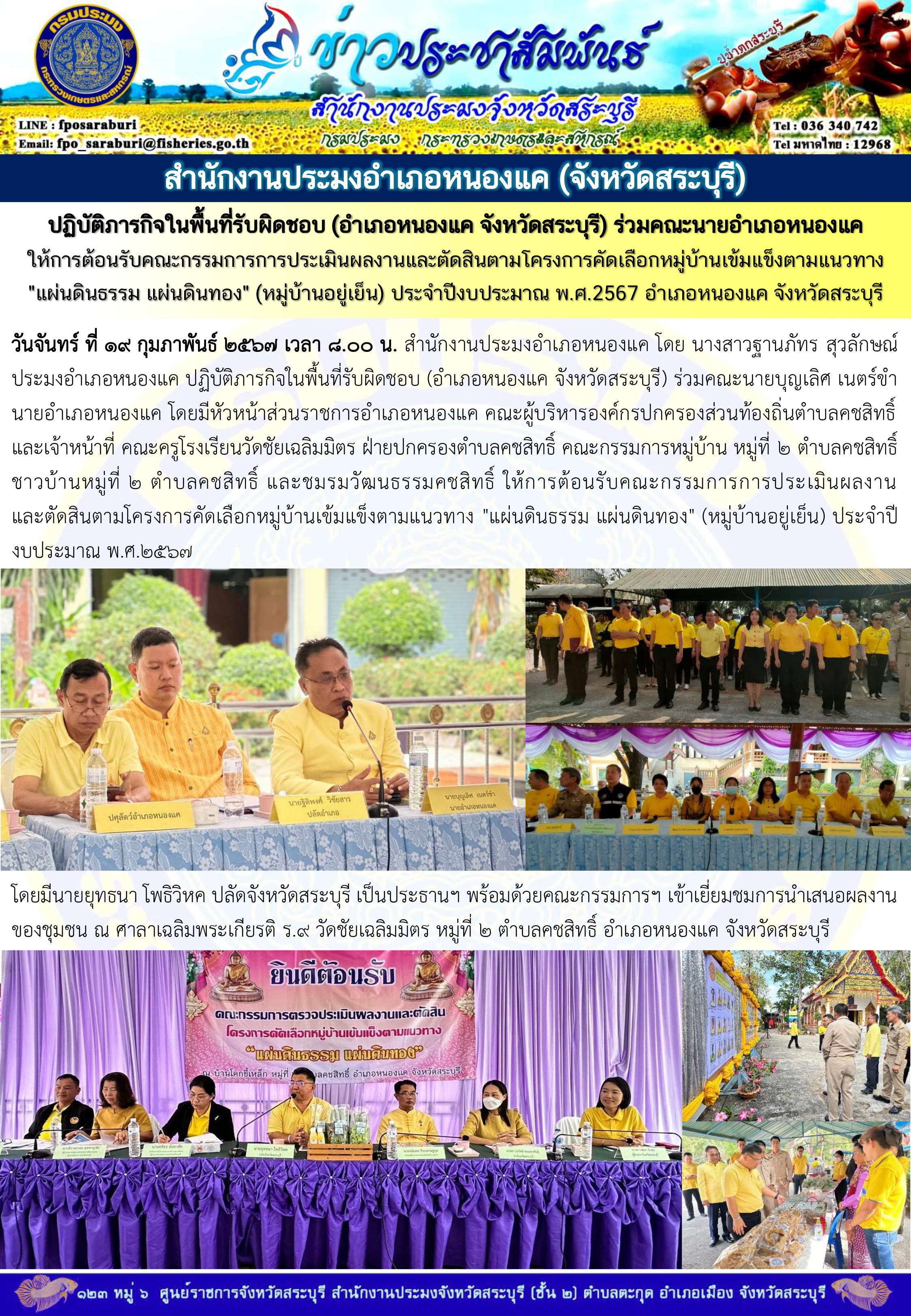 สำนักงานประมงอำเภอหนองแค ปฏิบัติภารกิจในพื้นที่รับผิดชอบ (อำเภอหนองแค จังหวัดสระบุรี) ร่วมคณะนายอำเภอหนองแค ให้การต้อนรับคณะกรรมการการประเมินผลงานและตัดสินตามโครงการคัดเลือกหมู่บ้านเข้มแข็งตามแนวทาง "แผ่นดินธรรม แผ่นดินทอง" (หมู่บ้านอยู่เย็น) ประจำปีงบประมาณ พ.ศ.2567 อำเภอหนองแค จังหวัดสระบุรี