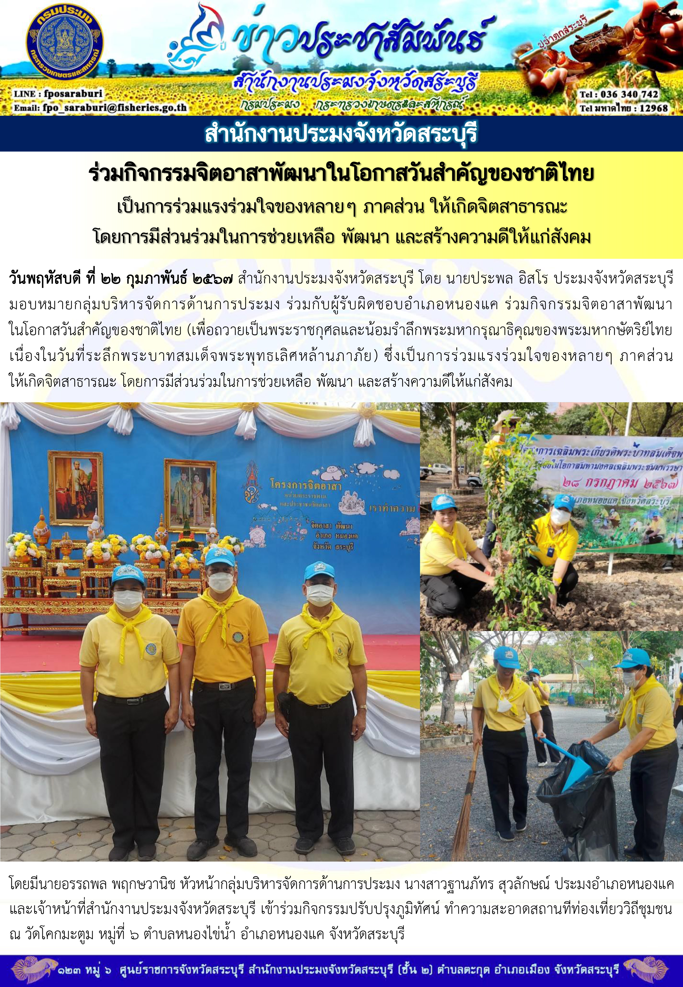 วันพฤหัสบดี ที่ 22 กุมภาพันธ์ 2567 สำนักงานประมงจังหวัดสระบุรี โดย นายประพล อิสโร ประมงจังหวัดสระบุรี มอบหมายกลุ่มบริหารจัดการด้านการประมง ร่วมกับผู้รับผิดชอบอำเภอหนองแค ร่วมกิจกรรมจิตอาสาพัฒนา ในโอกาสวันสำคัญของชาติไทย (เพื่อถวายเป็นพระราชกุศลและน้อมรำลึกพระมหากรุณาธิคุณของพระมหากษัตริย์ไทย เนื่องในวันที่ระลึกพระบาทสมเด็จพระพุทธเลิศหล้านภาภัย) ซึ่งเป็นการร่วมแรงร่วมใจของหลายๆ ภาคส่วน ให้เกิดจิตสาธารณะ โดยการมีส่วนร่วมในการช่วยเหลือ พัฒนา และสร้างความดีให้แก่สังคม