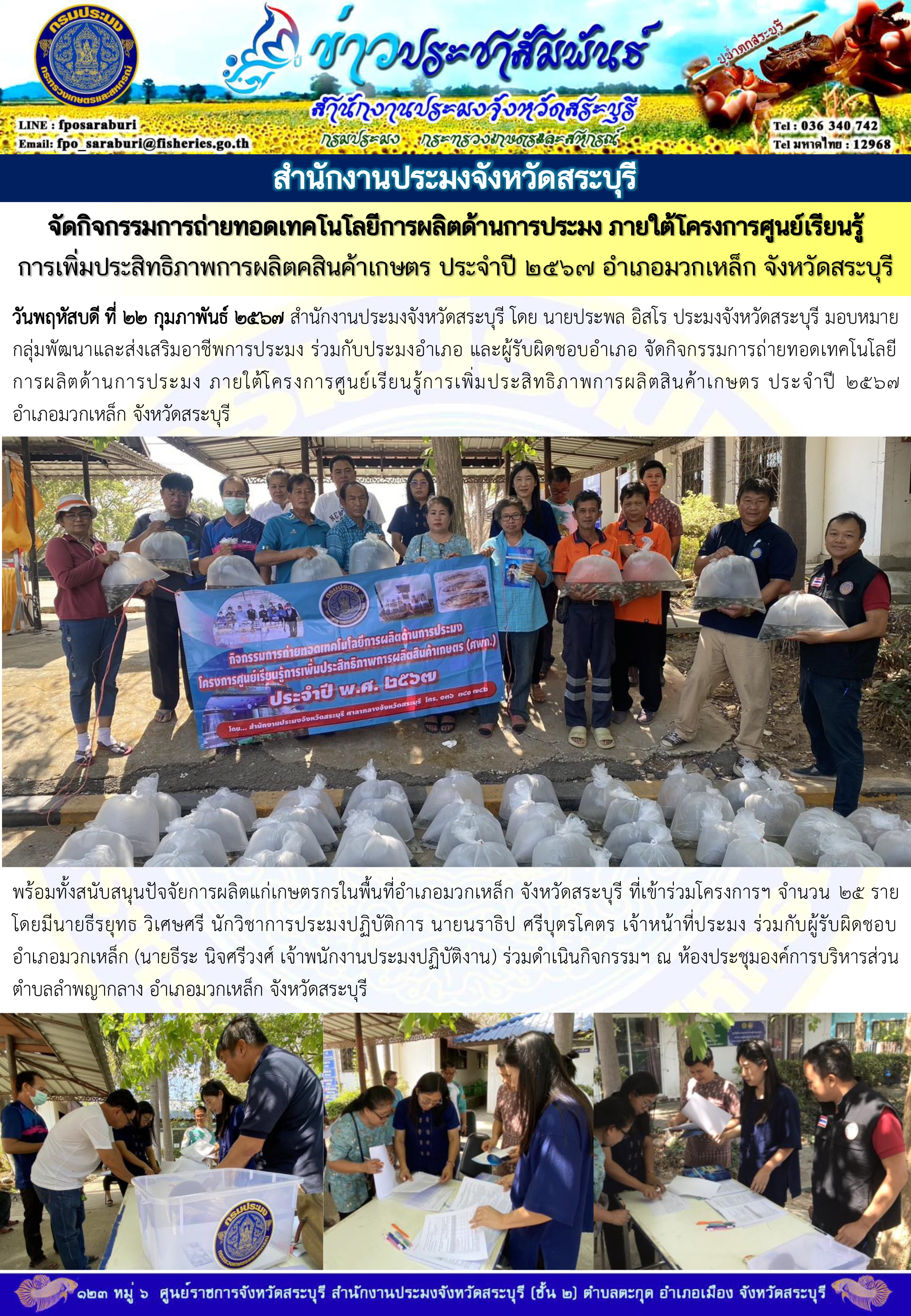 ภารกิจประจำวันที่ 22 กุมภาพันธ์ 2567 สำนักงานประมงจังหวัดสระบุรี
