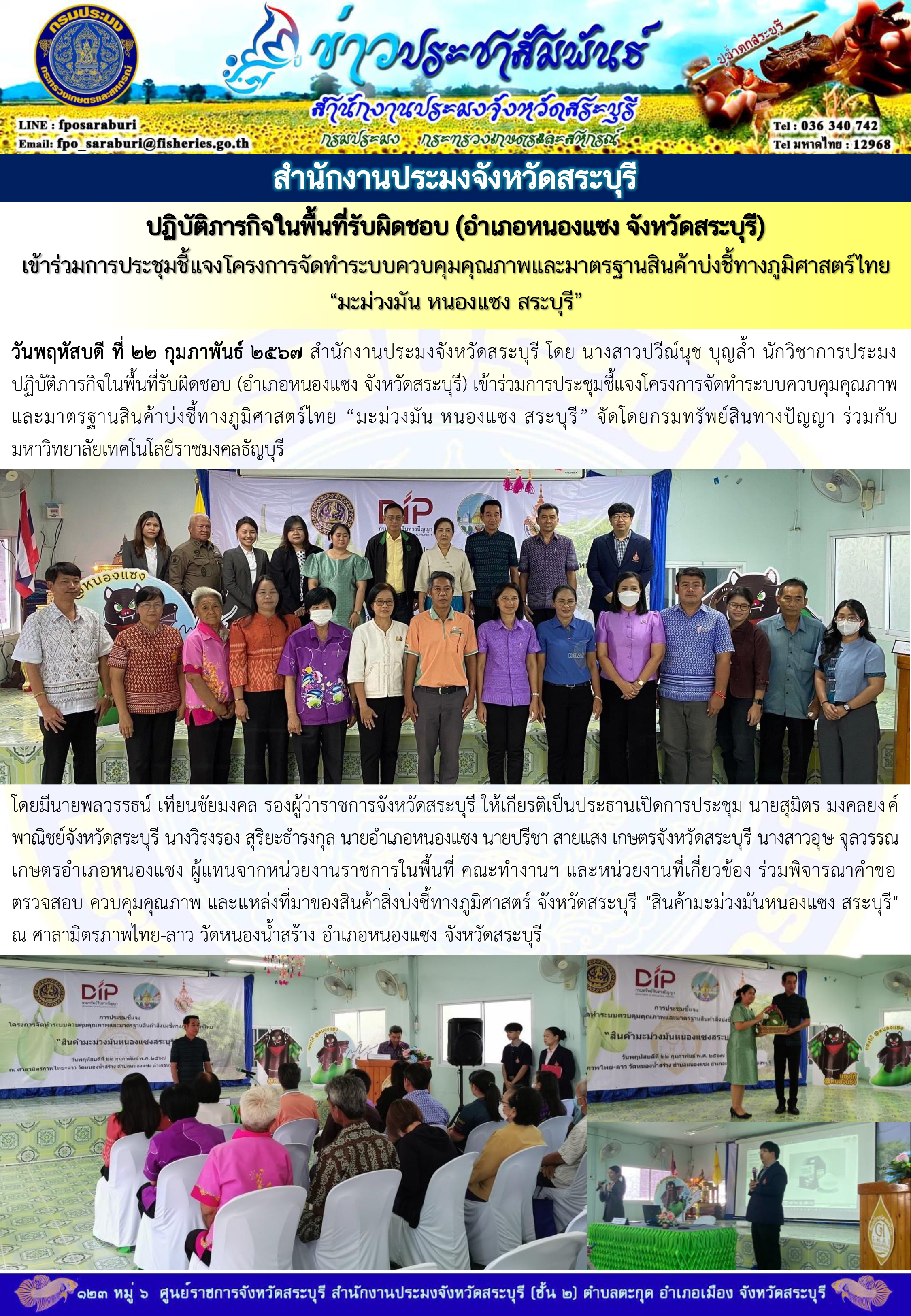 วันพฤหัสบดี ที่ 22 กุมภาพันธ์ 2567 สำนักงานประมงจังหวัดสระบุรี โดย นางสาวปวีณ์นุช บุญล้ำ นักวิชาการประมง ปฏิบัติภารกิจในพื้นที่รับผิดชอบ (อำเภอหนองแซง จังหวัดสระบุรี) เข้าร่วมการประชุมชี้แจงโครงการจัดทำระบบควบคุมคุณภาพและมาตรฐานสินค้าบ่งชี้ทางภูมิศาสตร์ไทย “มะม่วงมัน หนองแซง สระบุรี” จัดโดยกรมทรัพย์สินทางปัญญา ร่วมกับมหาวิทยาลัยเทคโนโลยีราชมงคลธัญบุรี