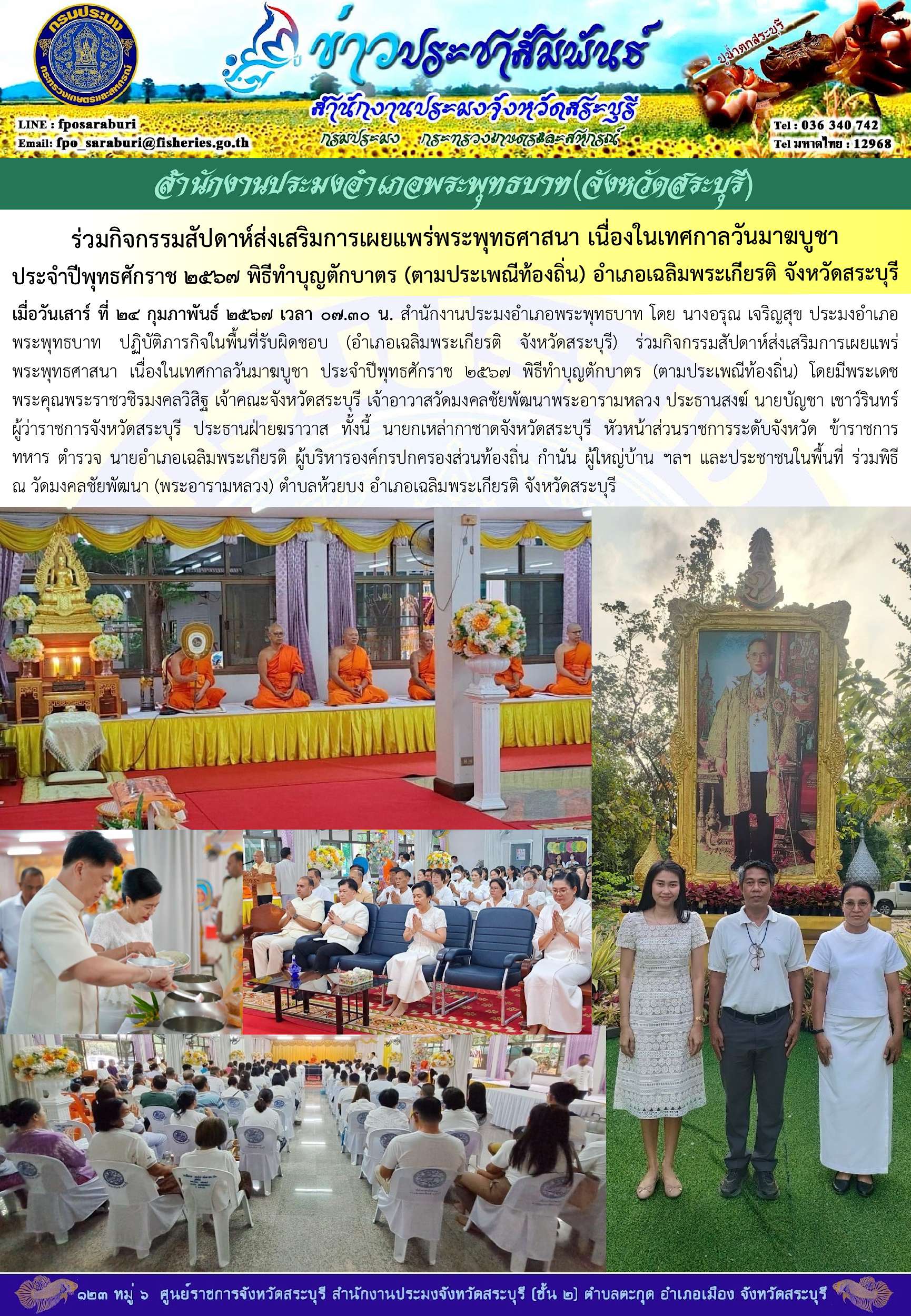 เมื่อวันเสาร์ ที่ ๒๔ กุมภาพันธ์ ๒๕๖๗ เวลา ๐๗.๓๐ น. สำนักงานประมงอำเภอพระพุทธบาท โดย นางอรุณ เจริญสุข ประมงอำเภอพระพุทธบาท ปฏิบัติภารกิจในพื้นที่รับผิดชอบ (อำเภอเฉลิมพระเกียรติ จังหวัดสระบุรี) ร่วมกิจกรรมสัปดาห์ส่งเสริมการเผยแพร่พระพุทธศาสนา เนื่องในเทศกาลวันมาฆบูชา ประจำปีพุทธศักราช ๒๕๖๗ พิธีทำบุญตักบาตร (ตามประเพณีท้องถิ่น) โดยมีพระเดชพระคุณพระราชวชิรมงคลวิสิฐ เจ้าคณะจังหวัดสระบุรี เจ้าอาวาสวัดมงคลชัยพัฒนาพระอารามหลวง ประธานสงฆ์ นายบัญชา เชาว์รินทร์ ผู้ว่าราชการจังหวัดสระบุรี ประธานฝ่ายฆราวาส ทั้งนี้ นายกเหล่ากาชาดจังหวัดสระบุรี หัวหน้าส่วนราชการระดับจังหวัด ข้าราชการ ทหาร ตำรวจ นายอำเภอเฉลิมพระเกียรติ ผู้บริหารองค์กรปกครองส่วนท้องถิ่น กำนัน ผู้ใหญ่บ้าน ฯลฯ และประชาชนในพื้นที่ ร่วมพิธี  ณ วัดมงคลชัยพัฒนา (พระอารามหลวง) ตำบลห้วยบง อำเภอเฉลิมพระเกียรติ จังหวัดสระบุรี