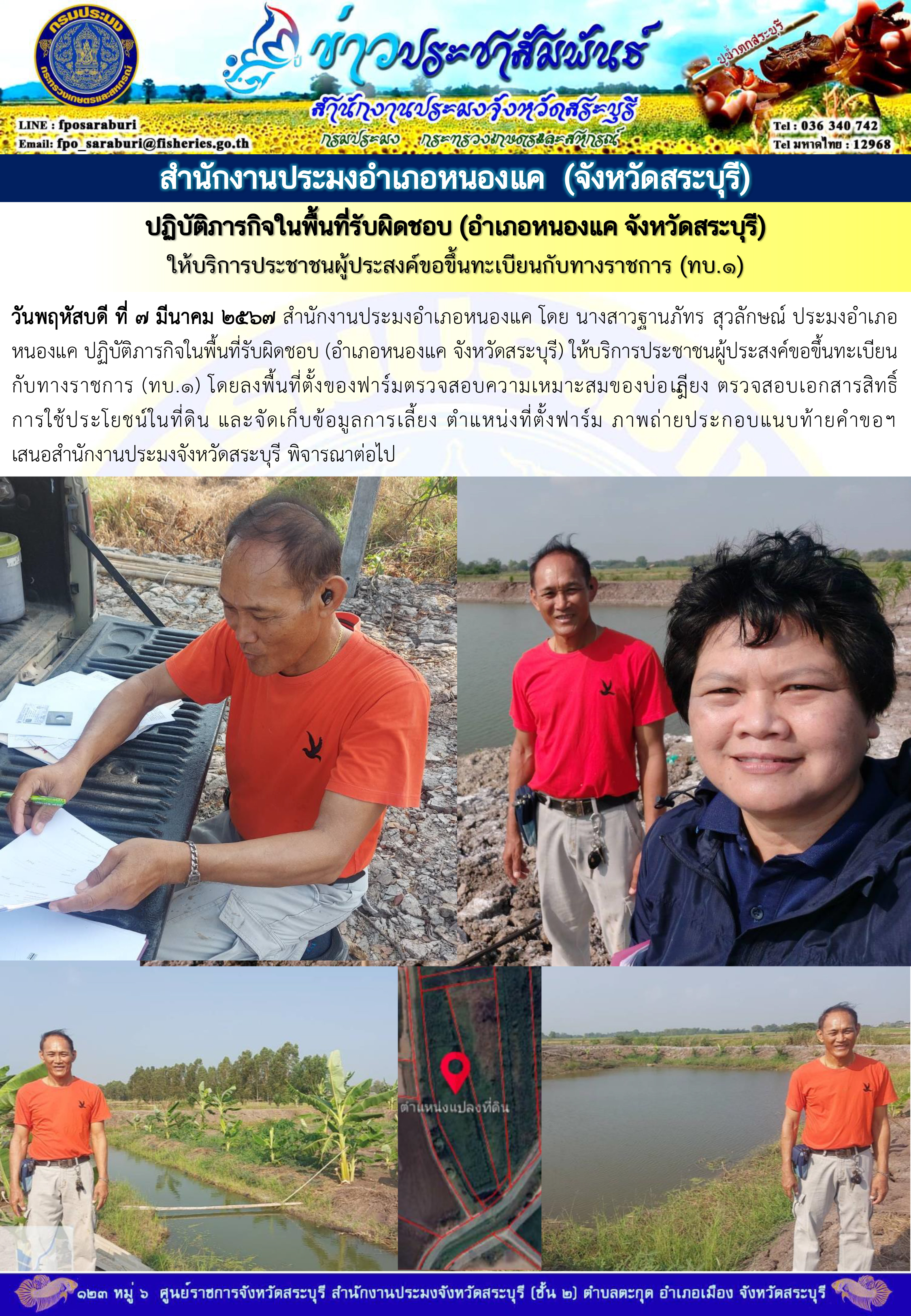 วันพฤหัสบดี ที่ 7 มีนาคม 2567 สำนักงานประมงอำเภอหนองแค โดย นางสาวฐานภัทร สุวลักษณ์ ประมงอำเภอหนองแค ปฏิบัติภารกิจในพื้นที่รับผิดชอบ (อำเภอหนองแค จังหวัดสระบุรี) ให้บริการประชาชนผู้ประสงค์ขอขึ้นทะเบียนกับทางราชการ (ทบ.1) โดยลงพื้นที่ตั้งของฟาร์มตรวจสอบความเหมาะสมของบ่อเลีั้ยง ตรวจสอบเอกสารสิทธิ์การใช้ประโยชน์ในที่ดิน และจัดเก็บข้อมูลการเลี้ยง ตำแหน่งที่ตั้งฟาร์ม ภาพถ่ายประกอบแนบท้ายคำขอฯ เสนอสำนักงานประมงจังหวัดสระบุรี พิจารณาต่อไป