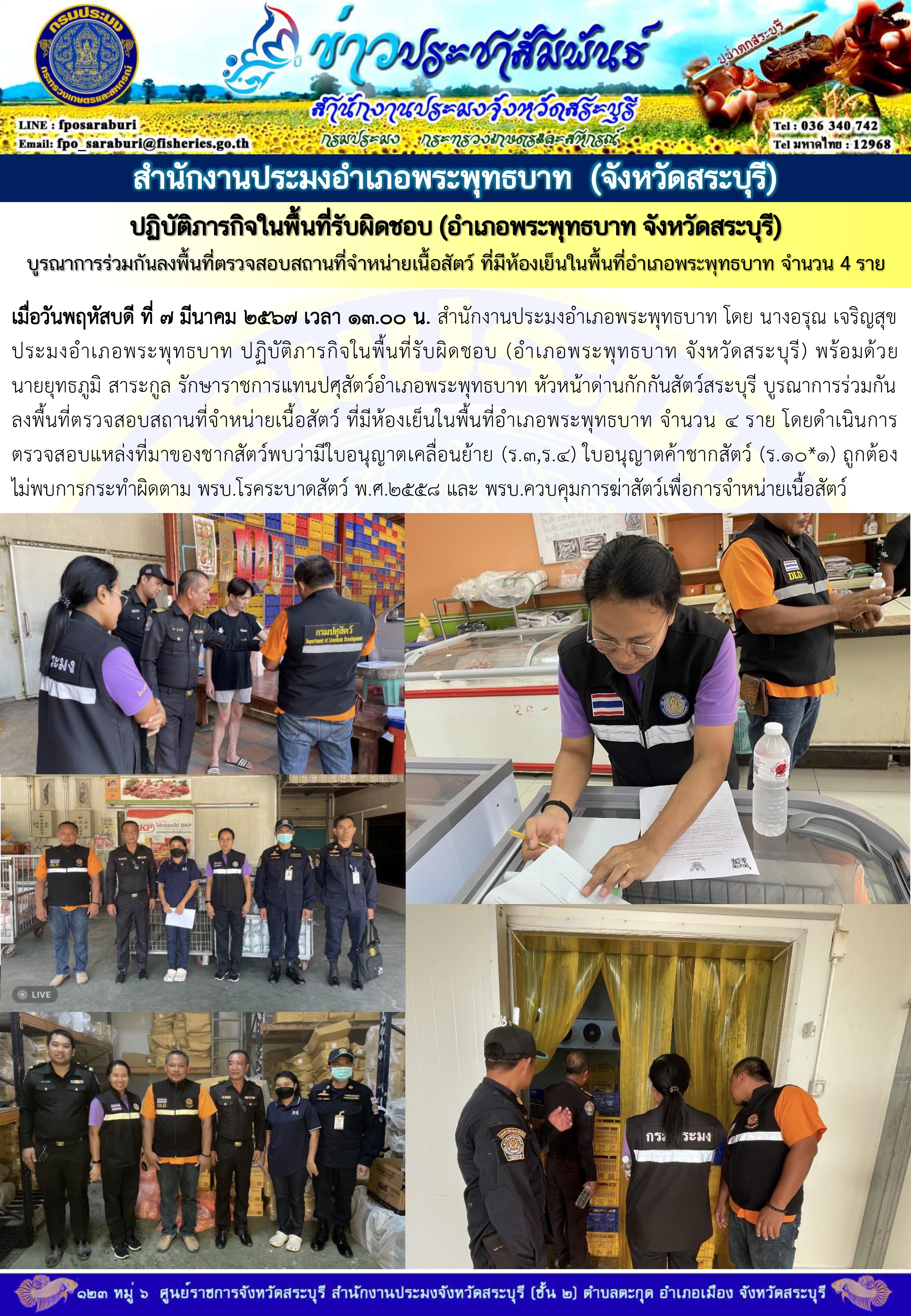 เมื่อวันพฤหัสบดี ที่ 7 มีนาคม 2567 เวลา 13.00 น. สำนักงานประมงอำเภอพระพุทธบาท โดย นางอรุณ เจริญสุข ประมงอำเภอพระพุทธบาท ปฏิบัติภารกิจในพื้นที่รับผิดชอบ (อำเภอพระพุทธบาท จังหวัดสระบุรี) พร้อมด้วยนายยุทธภูมิ สาระกูล รักษาราชการแทนปศุสัตว์อำเภอพระพุทธบาท หัวหน้าด่านกักกันสัตว์สระบุรี บูรณาการร่วมกันลงพื้นที่ตรวจสอบสถานที่จำหน่ายเนื้อสัตว์ ที่มีห้องเย็นในพื้นที่อำเภอพระพุทธบาท จำนวน 4 ราย โดยดำเนินการตรวจสอบแหล่งที่มาของชากสัตว์พบว่ามีใบอนุญาตเคลื่อนย้าย (ร.3,ร.4) ใบอนุญาตค้าชากสัตว์ (ร.10*1) ถูกต้อง ไม่พบการกระทำผิดตาม พรบ.โรคระบาดสัตว์ พ.ศ.2558 และ พรบ.ควบคุมการฆ่าสัตว์เพื่อการจำหน่ายเนื้อสัตว์