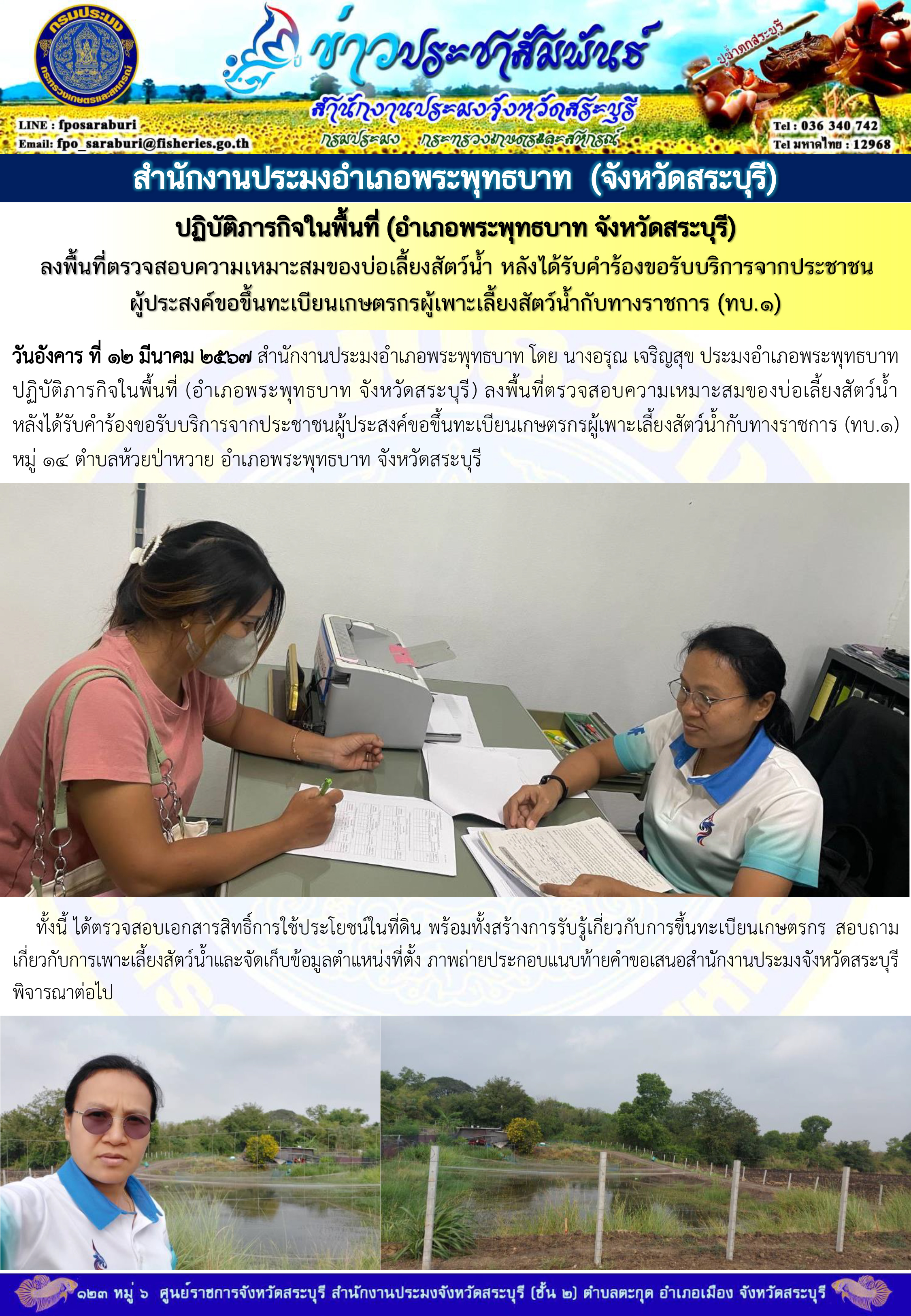 วันอังคาร ที่ 12 มีนาคม 2567 สำนักงานประมงอำเภอพระพุทธบาท โดย นางอรุณ เจริญสุข ประมงอำเภอพระพุทธบาท ปฏิบัติภารกิจในพื้นที่ (อำเภอพระพุทธบาท จังหวัดสระบุรี) ลงพื้นที่ตรวจสอบความเหมาะสมของบ่อเลี้ยงสัตว์น้ำ หลังได้รับคำร้องขอรับบริการจากประชาชนผู้ประสงค์ขอขึ้นทะเบียนเกษตรกรผู้เพาะเลี้ยงสัตว์น้ำกับทางราชการ (ทบ.1) หมู่ 14 ตำบลห้วยป่าหวาย อำเภอพระพุทธบาท จังหวัดสระบุรี