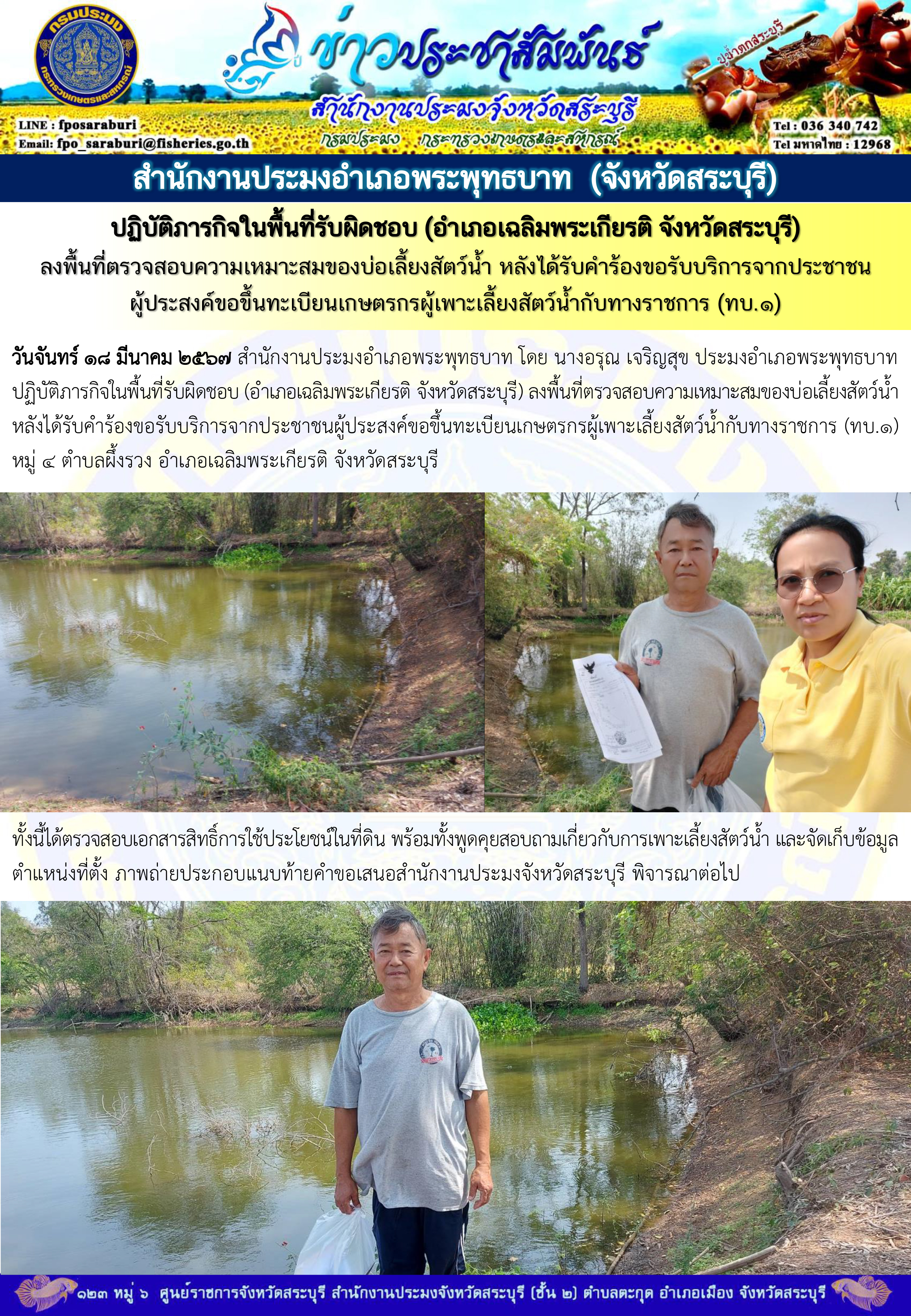 วันจันทร์ 18 มีนาคม 2567 สำนักงานประมงอำเภอพระพุทธบาท โดย นางอรุณ เจริญสุข ประมงอำเภอพระพุทธบาท ปฏิบัติภารกิจในพื้นที่รับผิดชอบ (อำเภอเฉลิมพระเกียรติ จังหวัดสระบุรี) ลงพื้นที่ตรวจสอบความเหมาะสมของบ่อเลี้ยงสัตว์น้ำ หลังได้รับคำร้องขอรับบริการจากประชาชนผู้ประสงค์ขอขึ้นทะเบียนเกษตรกรผู้เพาะเลี้ยงสัตว์น้ำกับทางราชการ (ทบ.1) หมู่ 4 ตำบลผึ้งรวง อำเภอเฉลิมพระเกียรติ จังหวัดสระบุรี