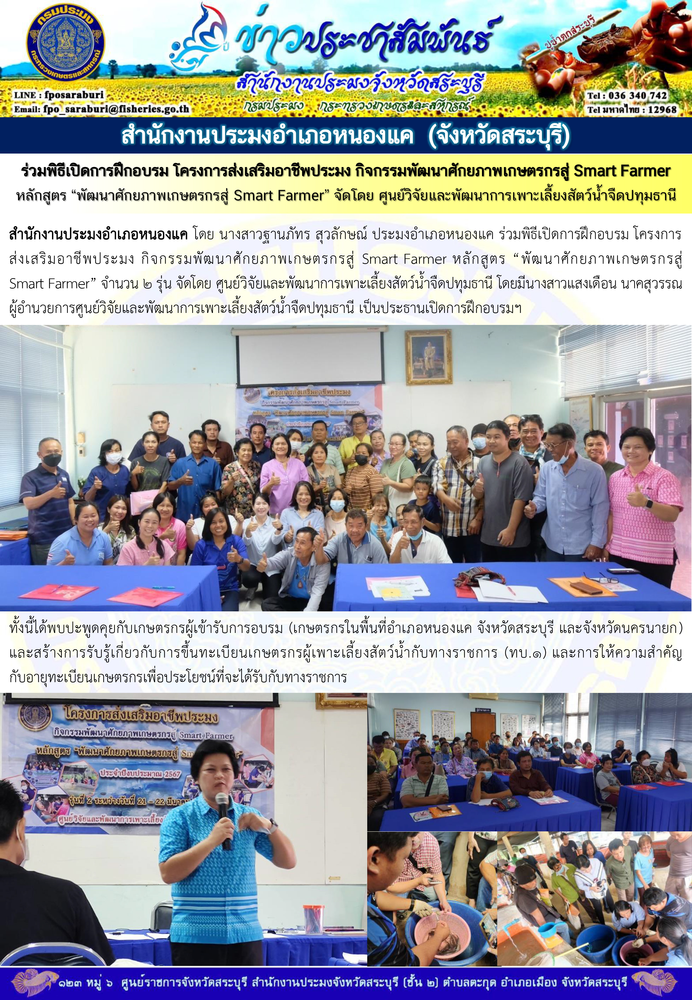 สำนักงานประมงอำเภอหนองแค ร่วมพิธีเปิดการฝึกอบรม โครงการส่งเสริมอาชีพประมง กิจกรรมพัฒนาศักยภาพเกษตรกรสู่ Smart Fammer หลักสูตร “พัฒนาศักยภาพเกษตรกรสู่ Smart Fammer” จัดโดย ศูนย์วิจัยและพัฒนาการเพาะเลี้ยงสัตว์น้ำจืดปทุมธานี