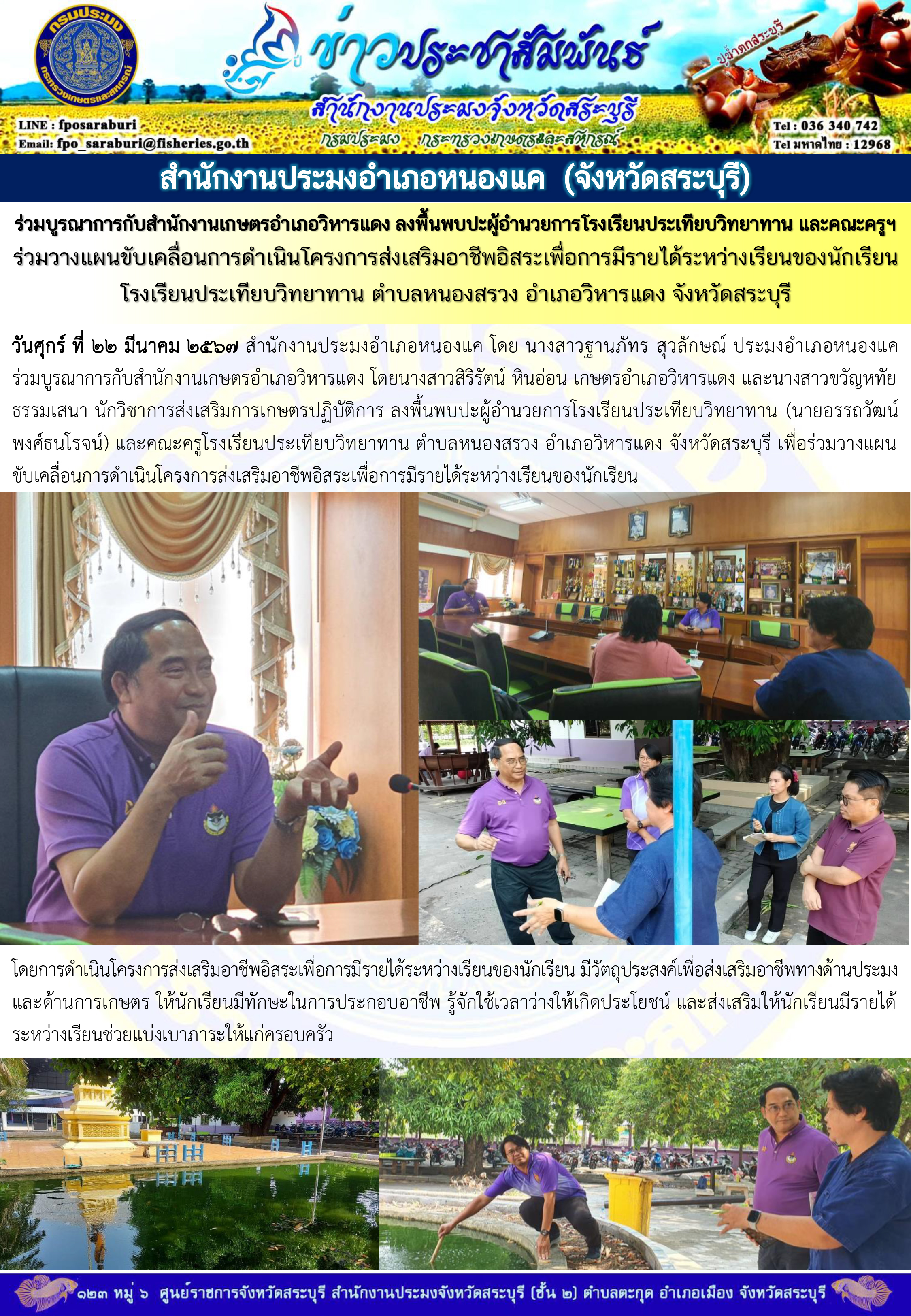สำนักงานประมงอำเภอหนองแค ร่วมบูรณาการกับสำนักงานเกษตรอำเภอวิหารแดง ลงพื้นพบปะผู้อำนวยการโรงเรียนประเทียบวิทยาทาน และคณะครูฯ ร่วมวางแผนขับเคลื่อนการดำเนินโครงการส่งเสริมอาชีพอิสระเพื่อการมีรายได้ระหว่างเรียนของนักเรียน โรงเรียนประเทียบวิทยาทาน ตำบลหนองสรวง อำเภอวิหารแดง จังหวัดสระบุรี