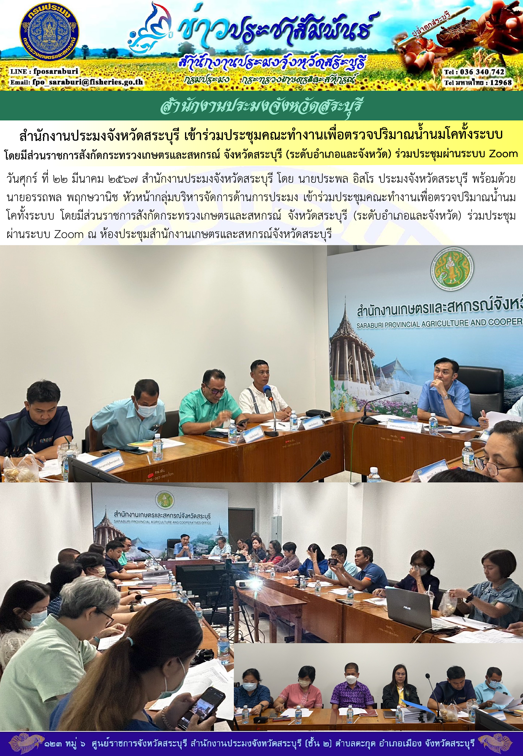 วันศุกร์ ที่ ๒๒ มีนาคม ๒๕๖๗ สำนักงานประมงจังหวัดสระบุรี โดย นายประพล อิสโร ประมงจังหวัดสระบุรี พร้อมด้วยนายอรรถพล พฤกษวานิช หัวหน้ากลุ่มบริหารจัดการด้านการประมง เข้าร่วมประชุมคณะทำงานเพื่อตรวจปริมาณน้ำนมโคทั้งระบบ โดยมีส่วนราชการสังกัดกระทรวงเกษตรและสหกรณ์ จังหวัดสระบุรี (ระดับอำเภอและจังหวัด) ร่วมประชุมผ่านระบบ Zoom ณ ห้องประชุมสำนักงานเกษตรและสหกรณ์จังหวัดสระบุรี