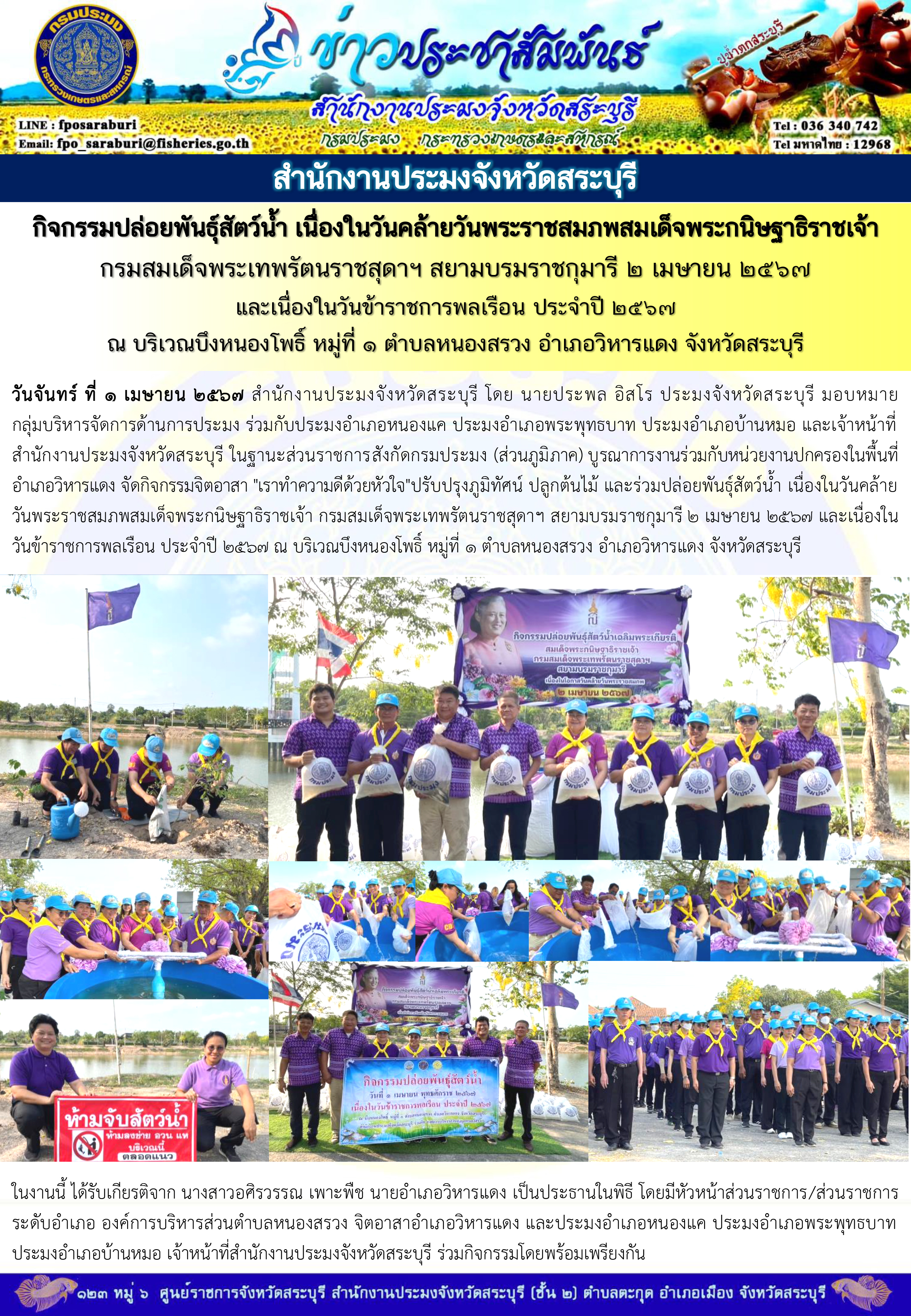 สำนักงานประมงจังหวัดสระบุรี จัดกิจกรรมปล่อยพันธุ์สัตว์น้ำ เนื่องในวันคล้ายวันพระราชสมภพสมเด็จพระกนิษฐาธิราชเจ้า กรมสมเด็จพระเทพรัตนราชสุดาฯ สยามบรมราชกุมารี 2 เมษายน 2567 และเนื่องในวันข้าราชการพลเรือน ประจำปี 2567 ณ บริเวณบึงหนองโพธิ์ หมู่ที่ 1 ตำบลหนองสรวง อำเภอวิหารแดง จังหวัดสระบุรี