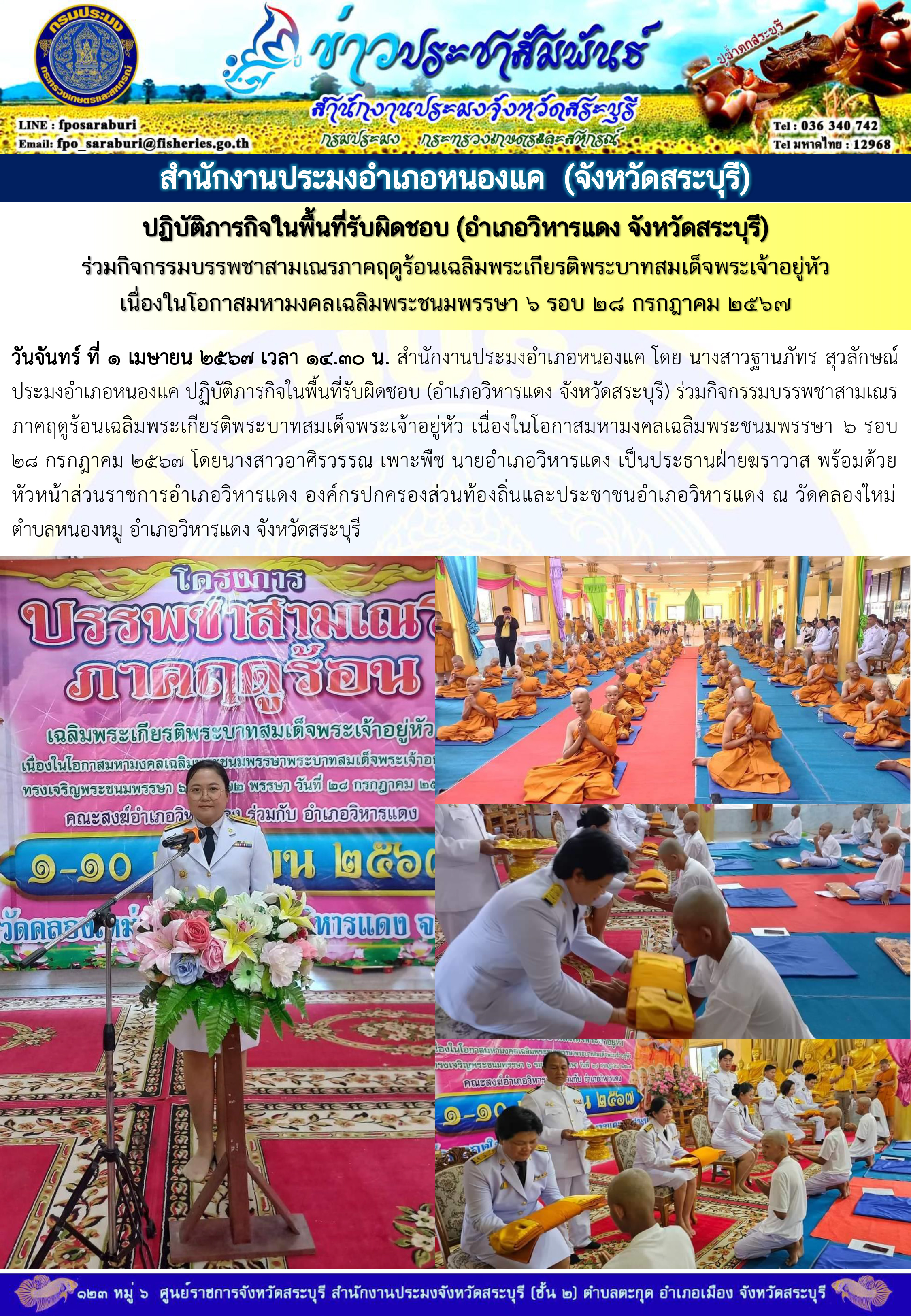 สำนักงานประมงอำเภอหนองแค ปฏิบัติภารกิจในพื้นที่รับผิดชอบ (อำเภอวิหารแดง จังหวัดสระบุรี) ร่วมกิจกรรมบรรพชาสามเณรภาคฤดูร้อนเฉลิมพระเกียรติพระบาทสมเด็จพระเจ้าอยู่หัว เนื่องในโอกาสมหามงคลเฉลิมพระชนมพรรษา 6 รอบ 28 กรกฎาคม 2567
